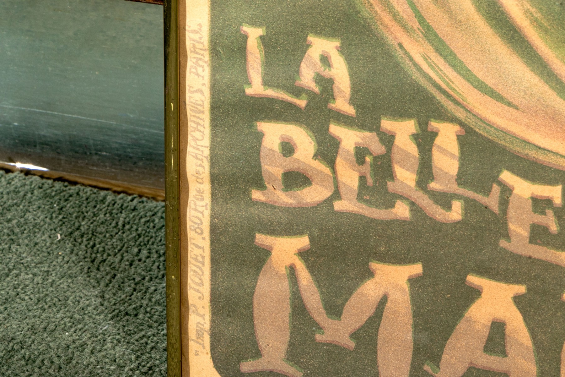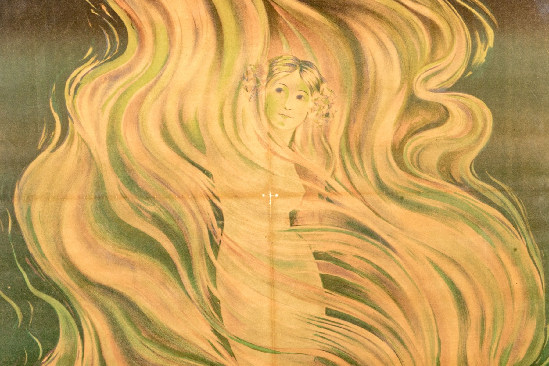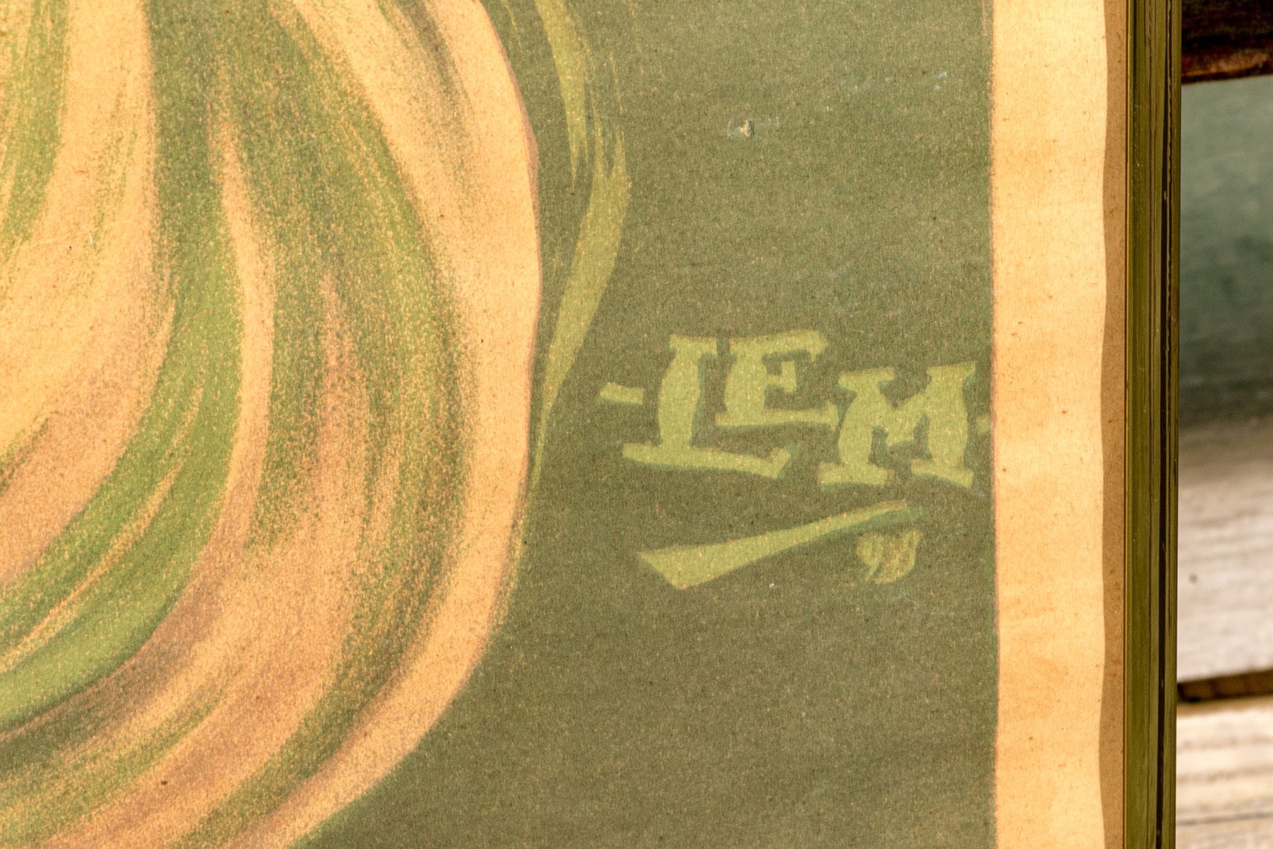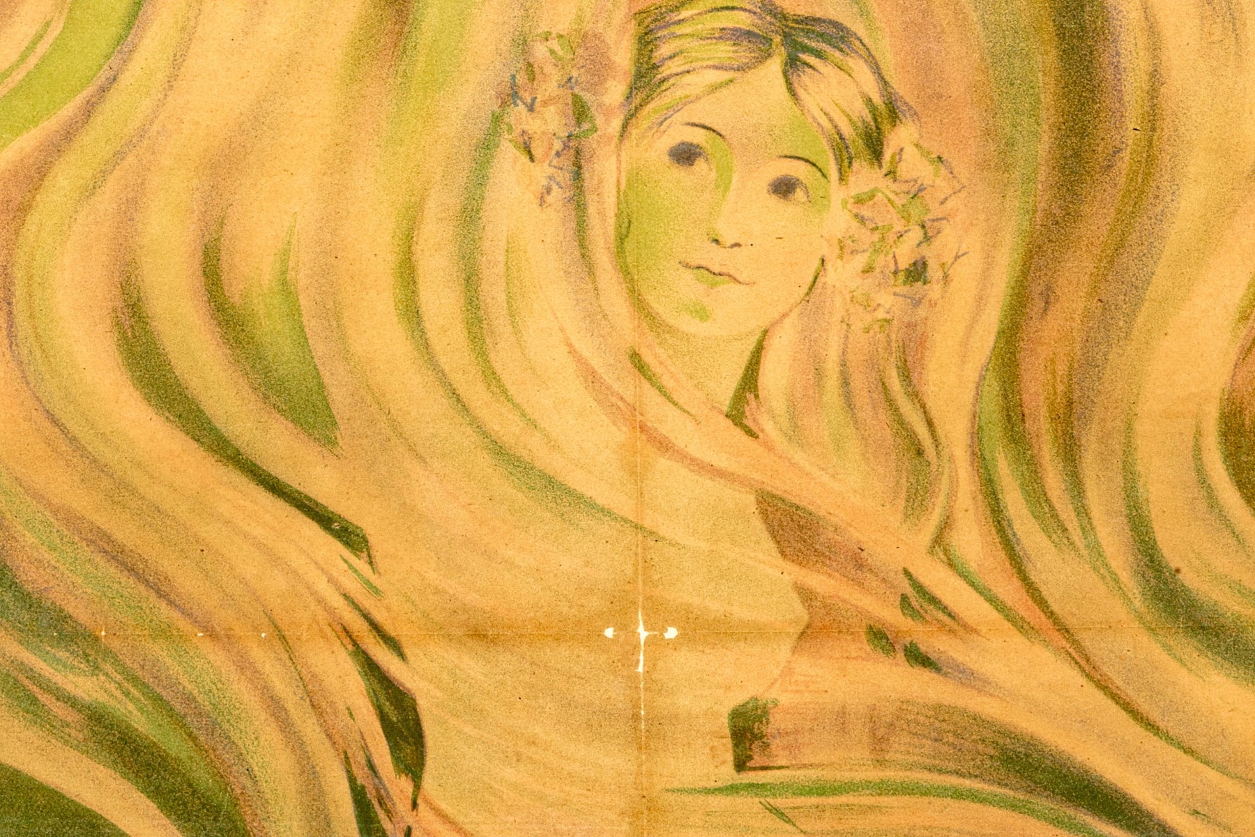 Ernest Barthelemy Lem (French, 1869-1930 lithographic poster for "Danses Lumineuses et Danses Du Feu" starring actress Maryska Recsey. The poster features an illustration depicting a woman emerging from swirling flames in yellow, pink, and green, creating an impressive and impactful display. Printed by P. Jouet. Displayed in a simple gilt frame.