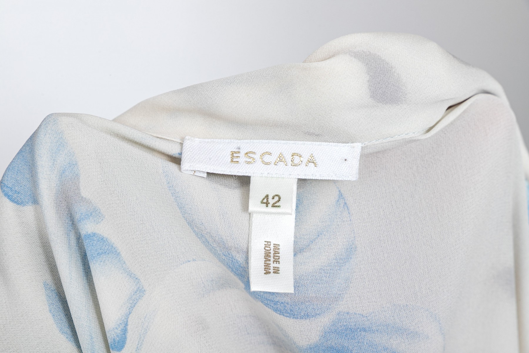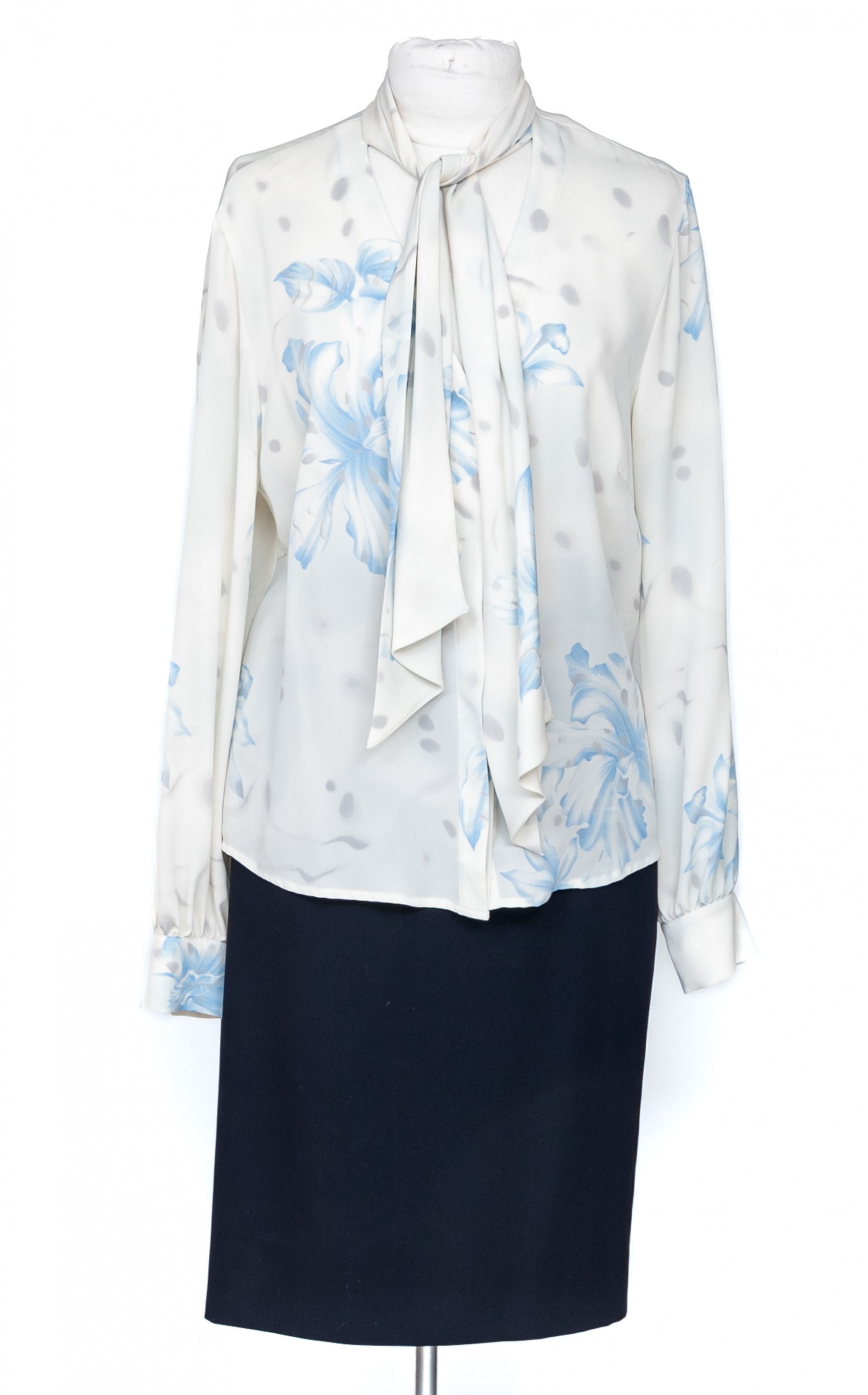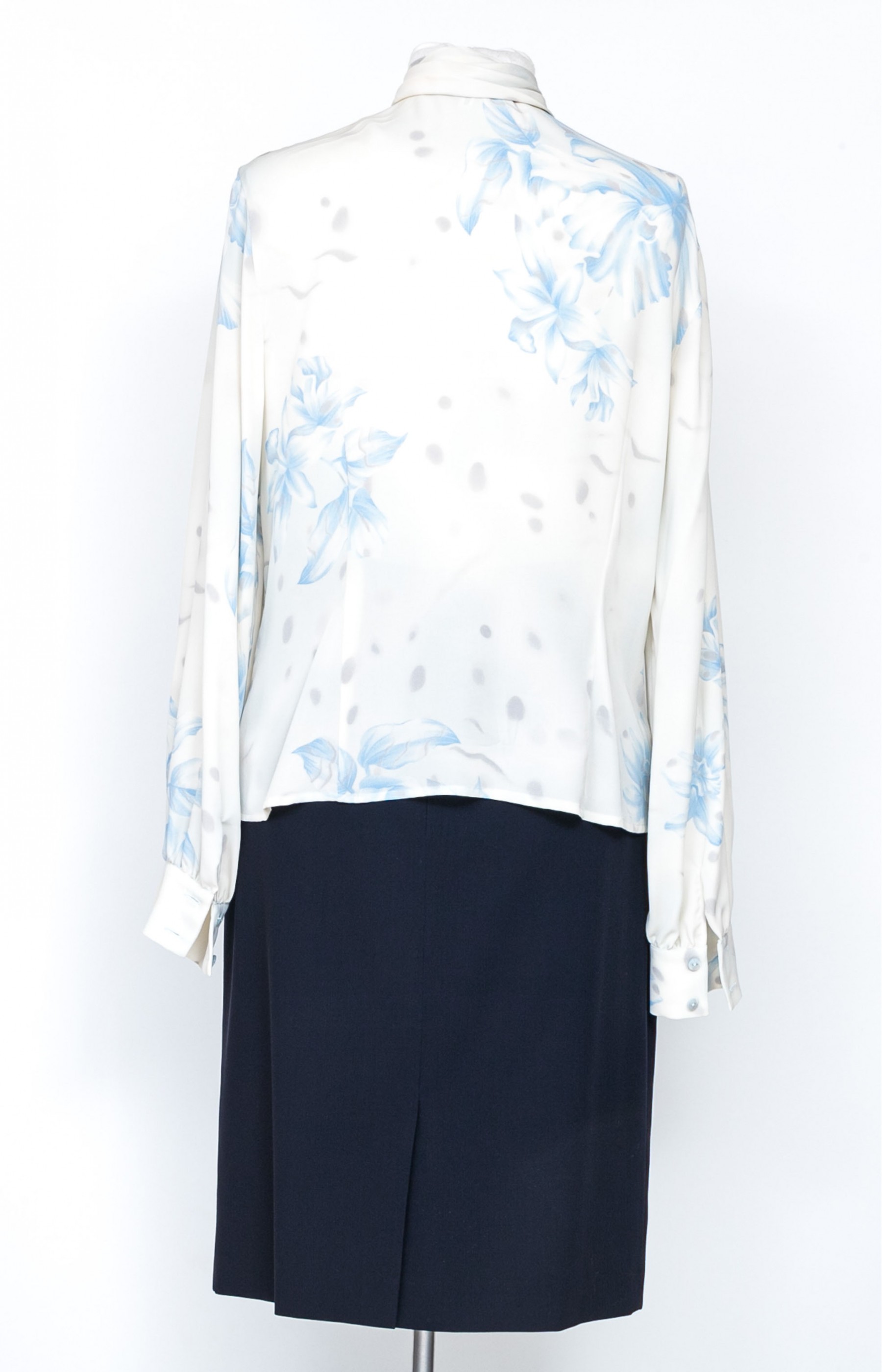 Escada black skirt with white and blue floral print button-up top. Zipper closure on skirt.