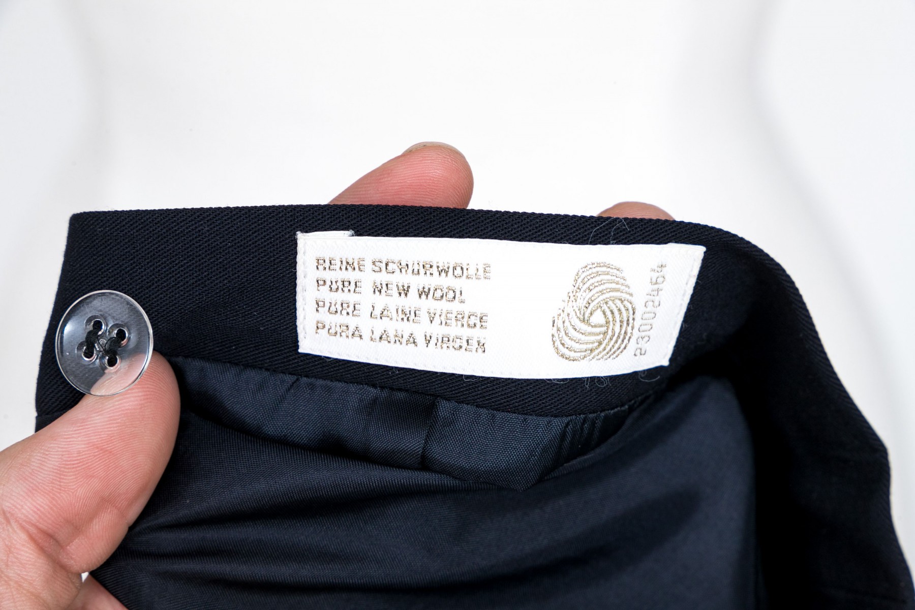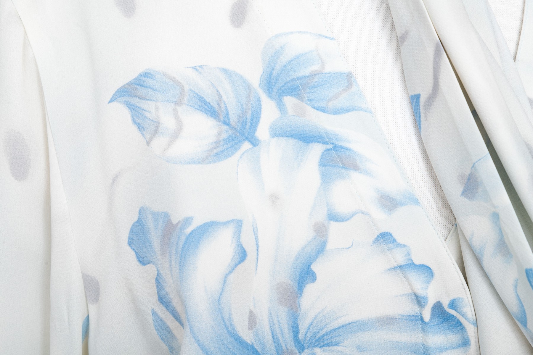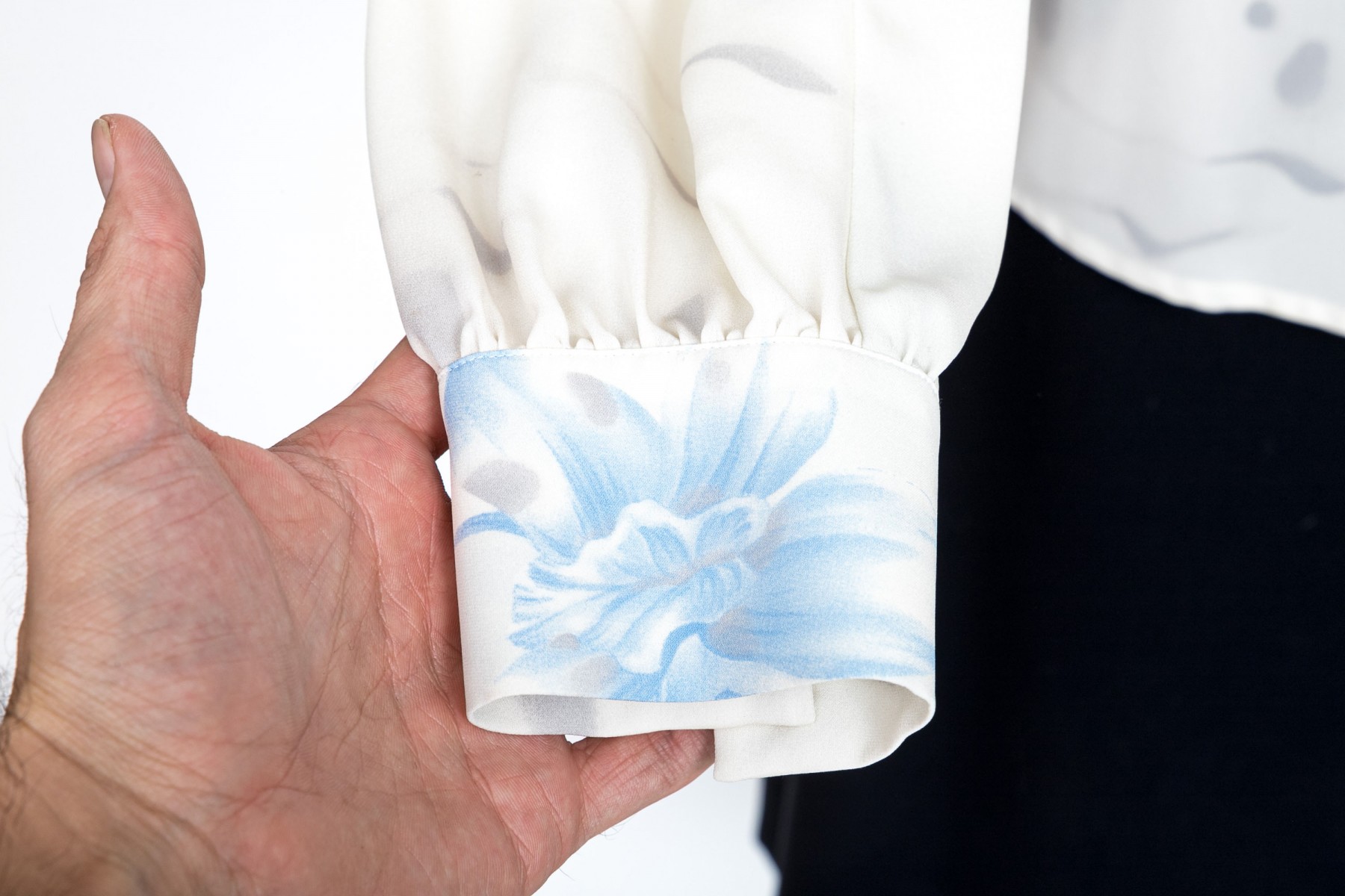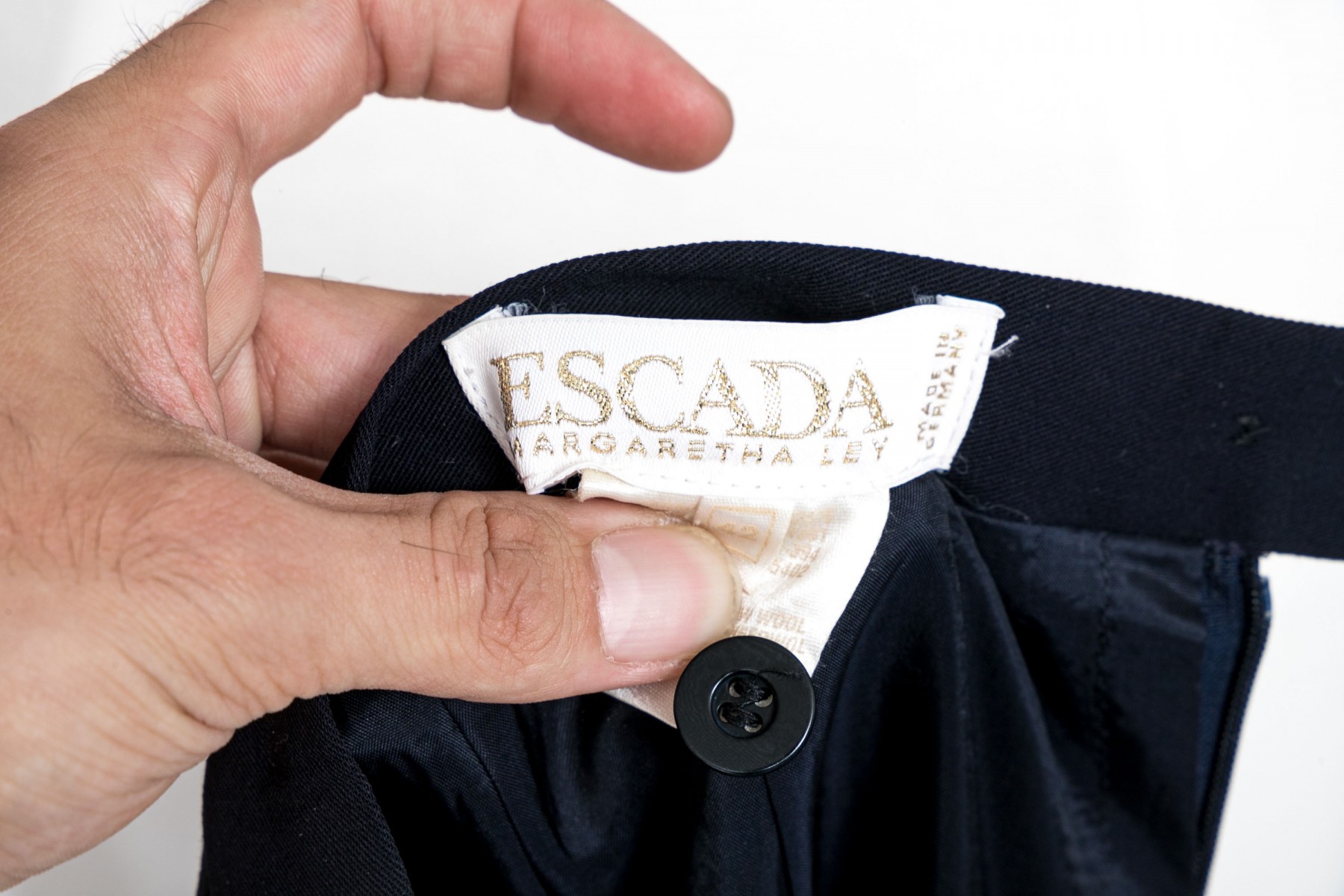 Escada black skirt with white and blue floral print button-up top. Zipper closure on skirt.