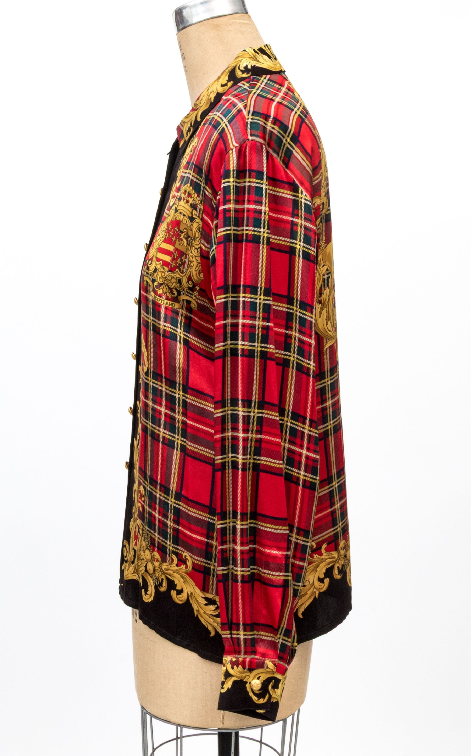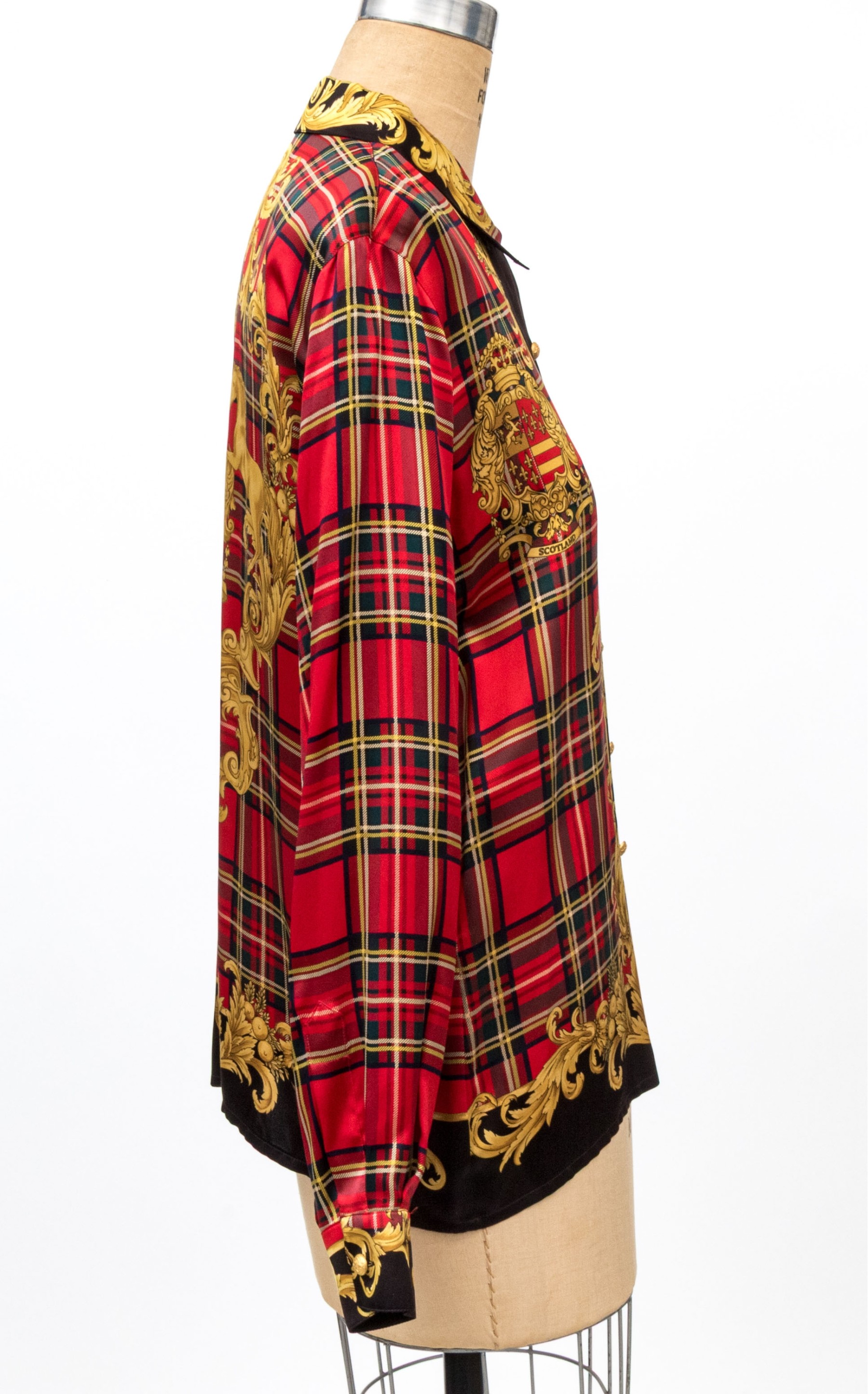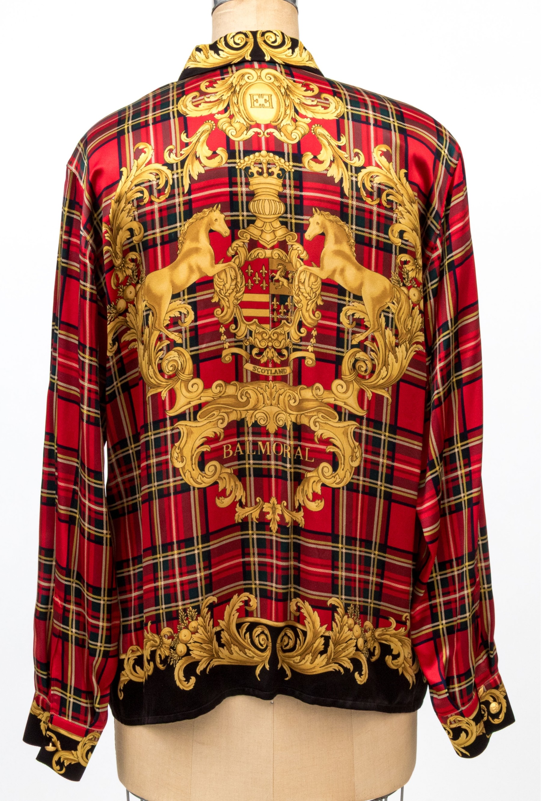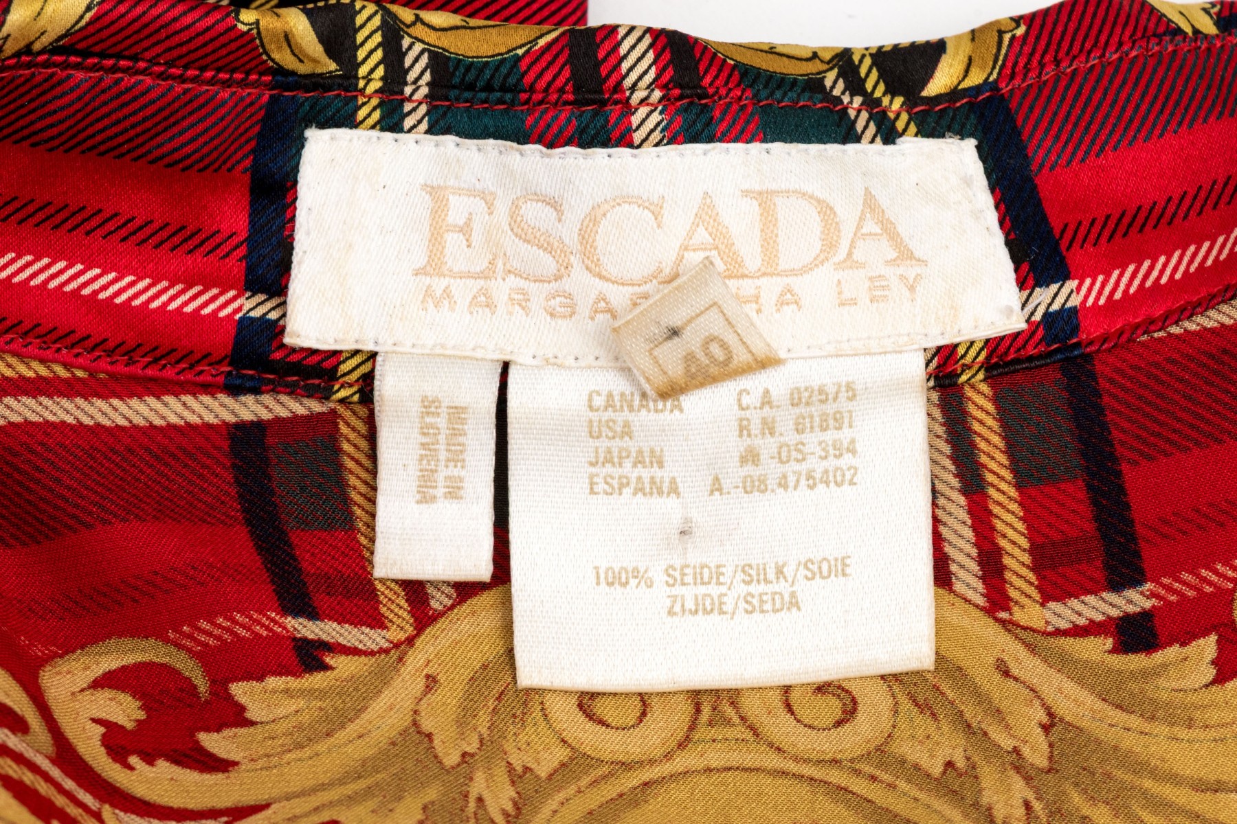 Escada vintage red, black and gold Scottish plaid silk blouse, size 40