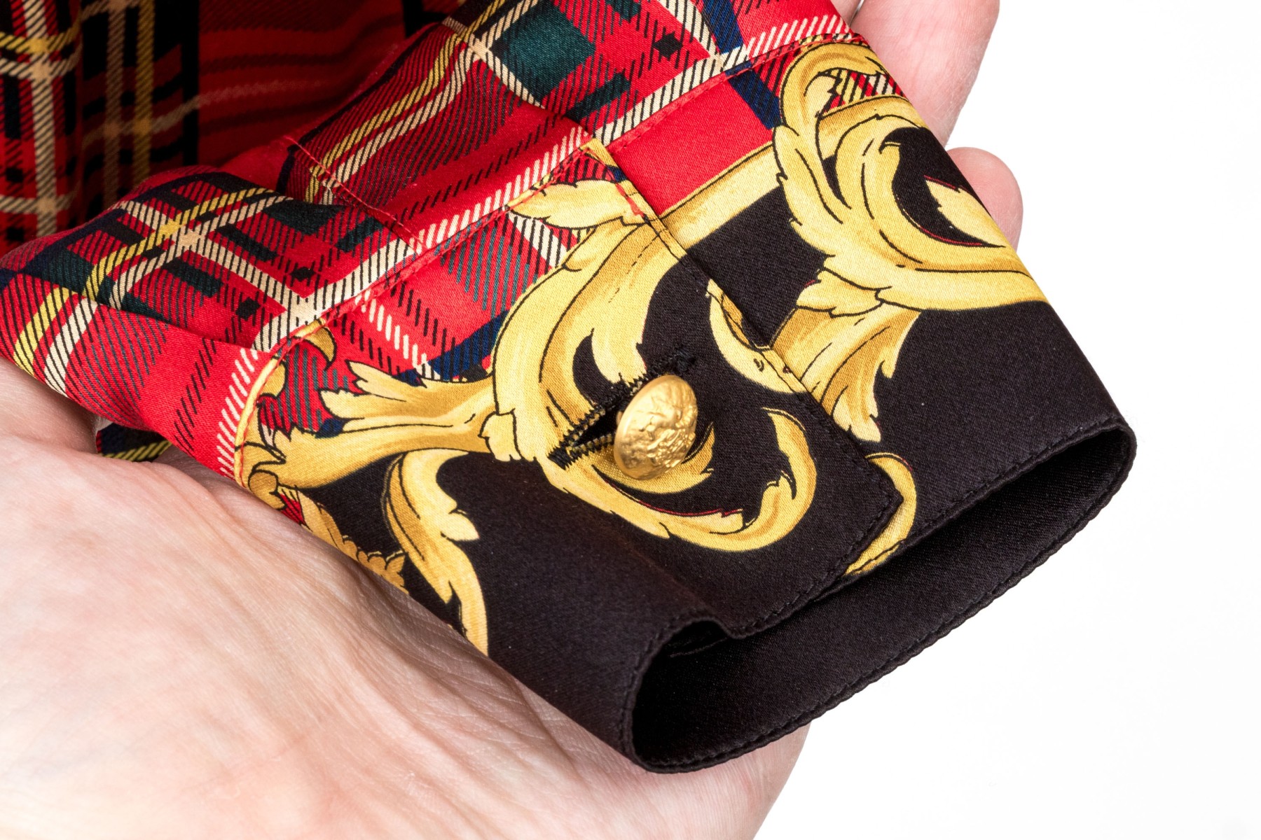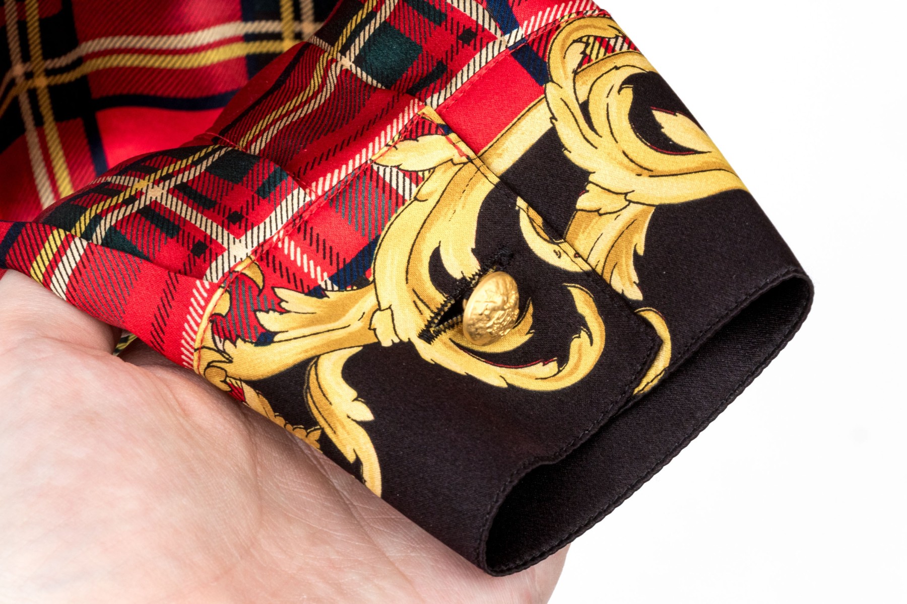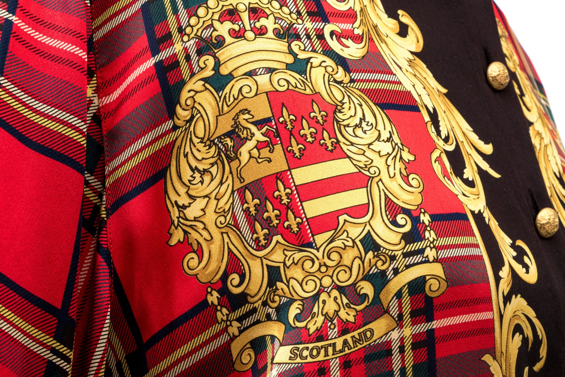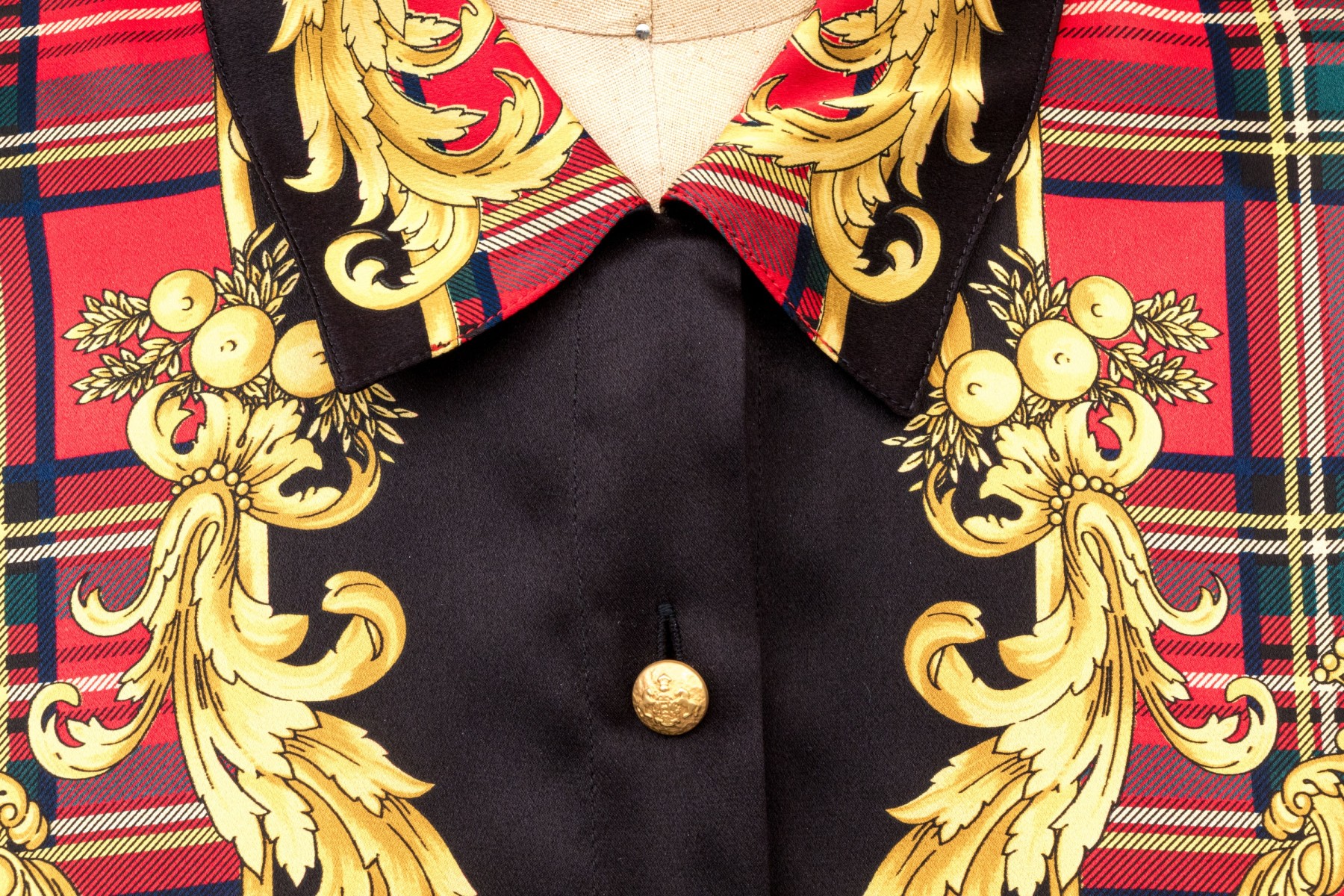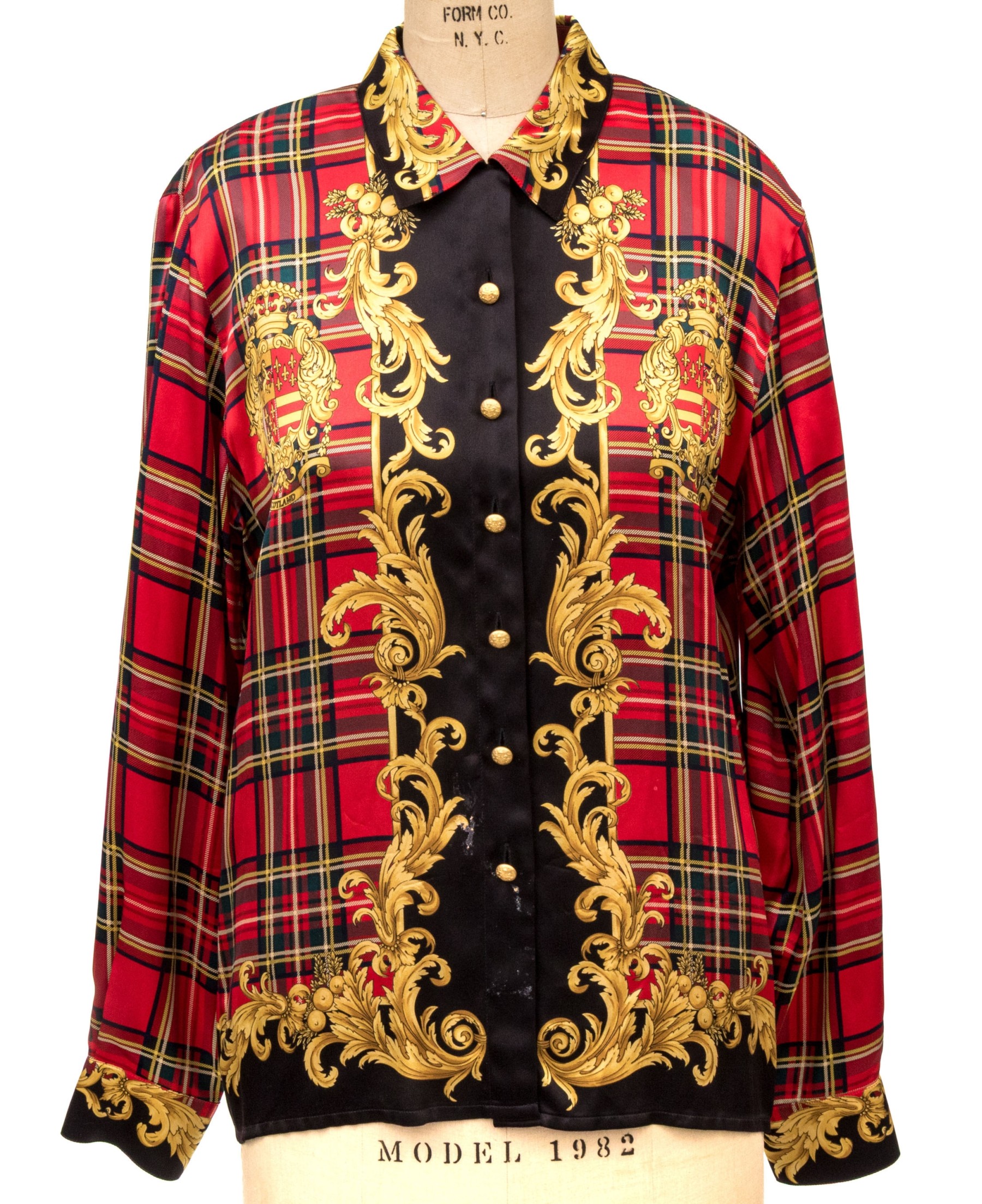 Escada vintage red, black and gold Scottish plaid silk blouse, size 40