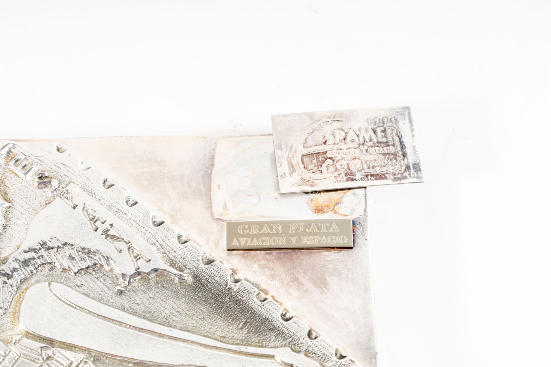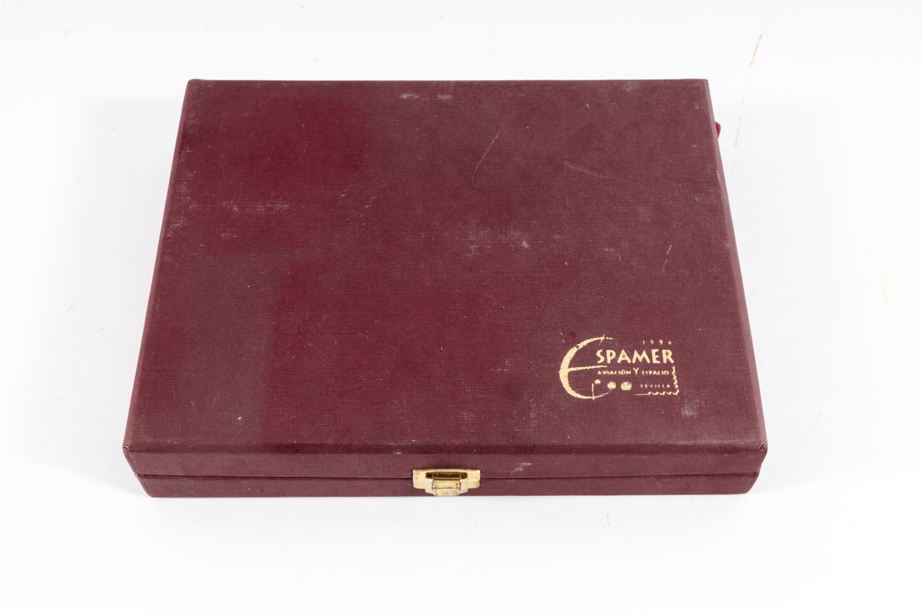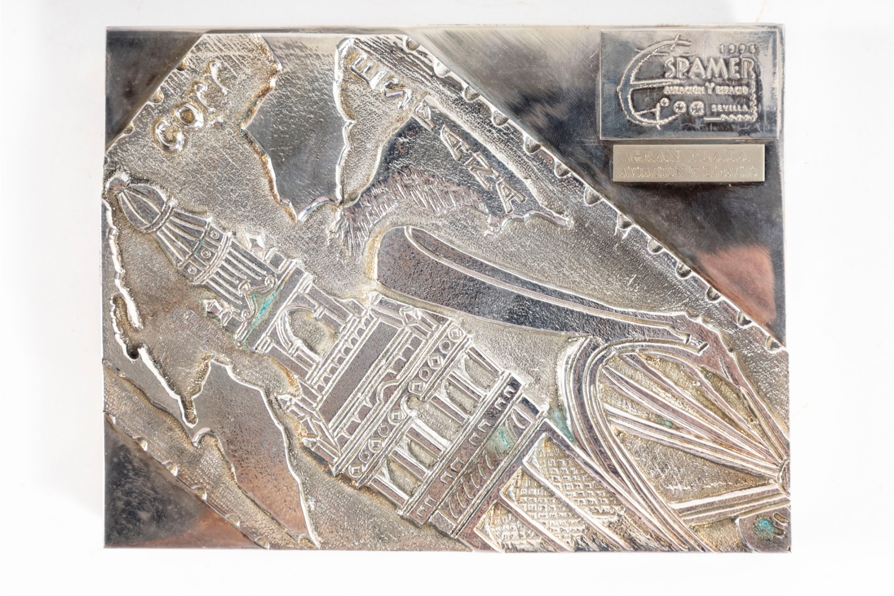 The 1993 Espamer Seville Exhibition was briefly home to 60 stands from varying countries where it was possible to purchase material supplied by their postal administrations relating to the Seville Exhibition. Among various medals minted in silver and copper, this Jewelry box was produced for the event. Silver plated with a mirror finish, the interior is divided with a red felt-lined surface. Case included.