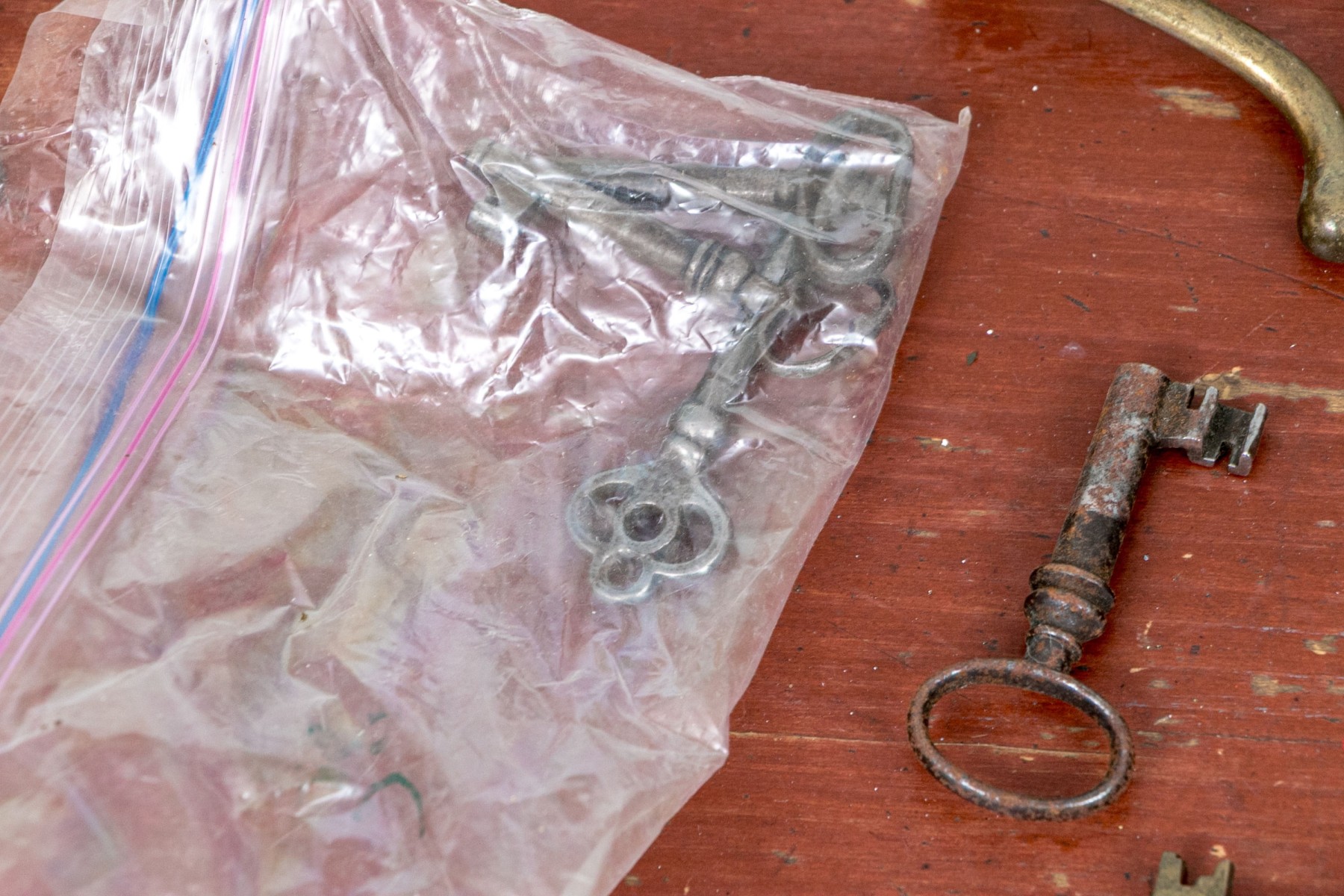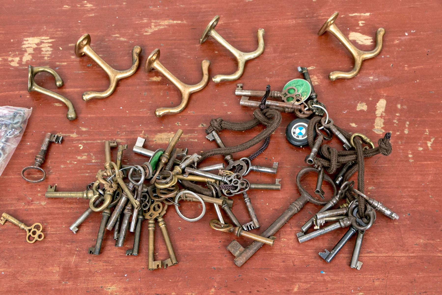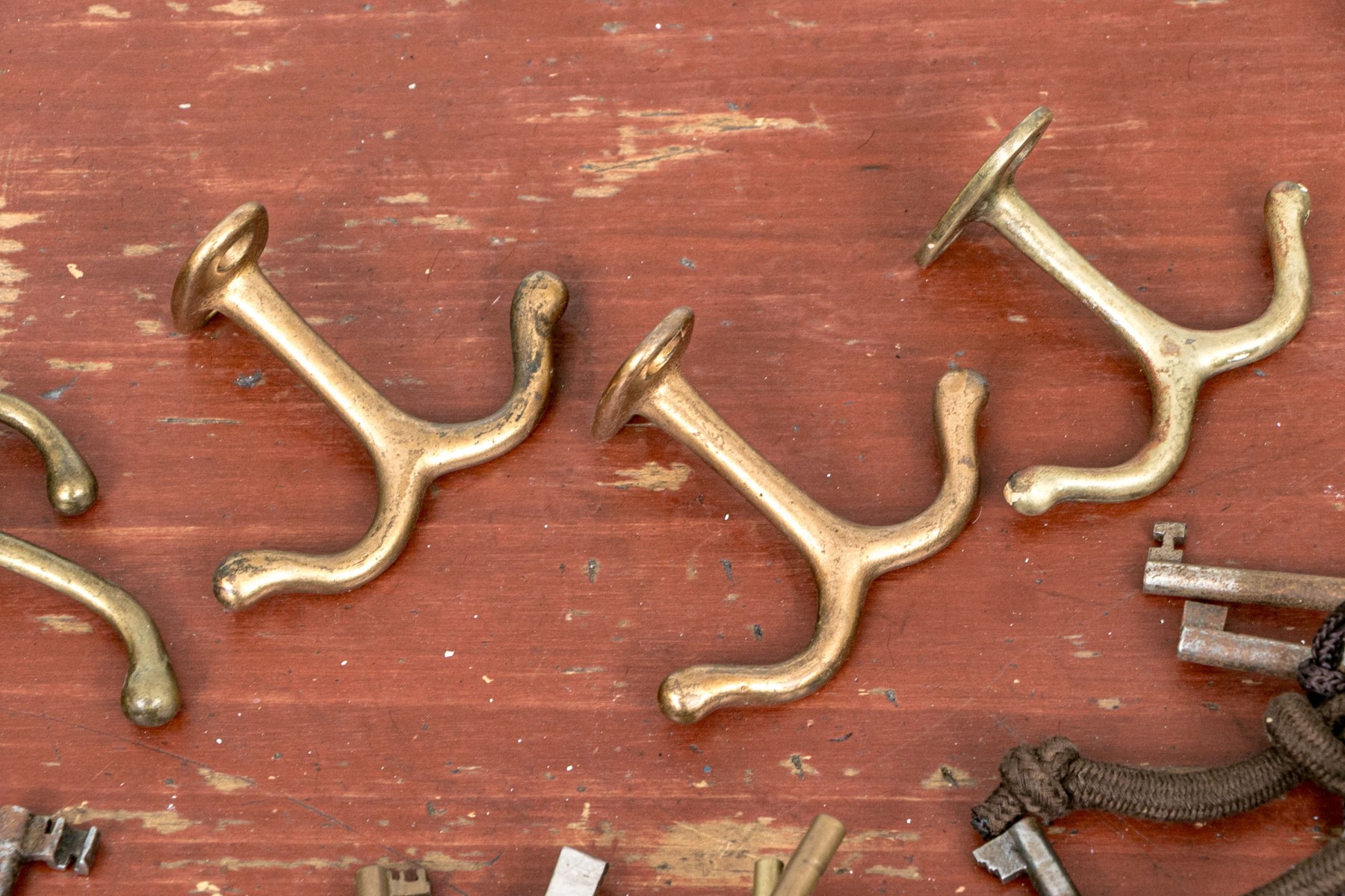 A wonderful collection of hardware and accessories including a handful of brass hooks and a variety of keys.