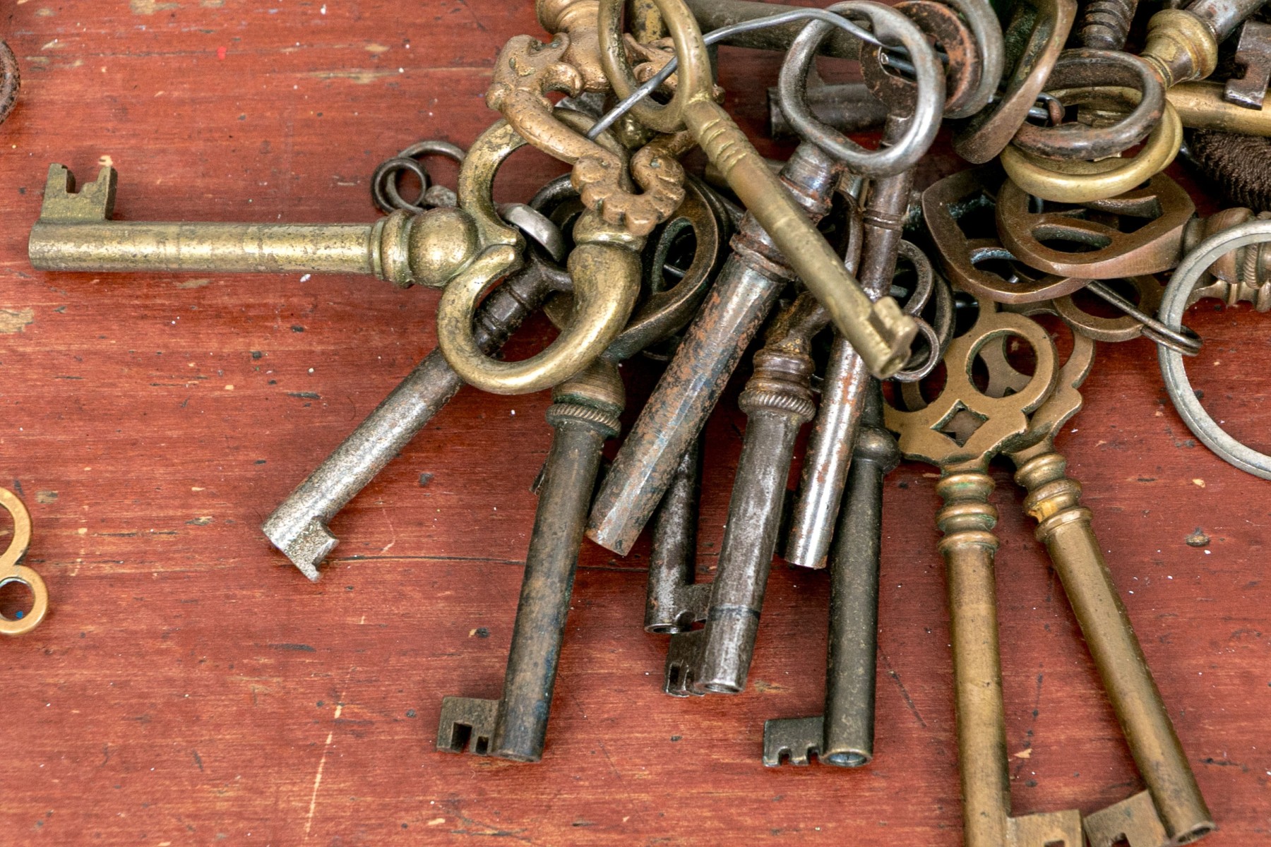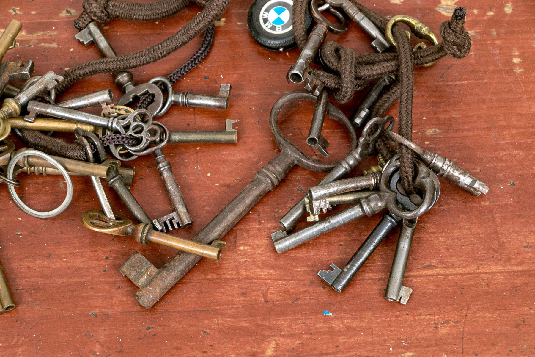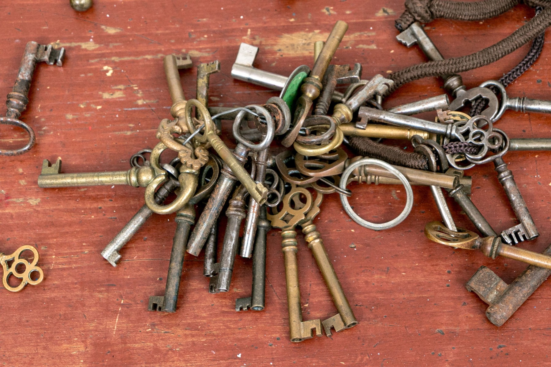 A wonderful collection of hardware and accessories including a handful of brass hooks and a variety of keys.