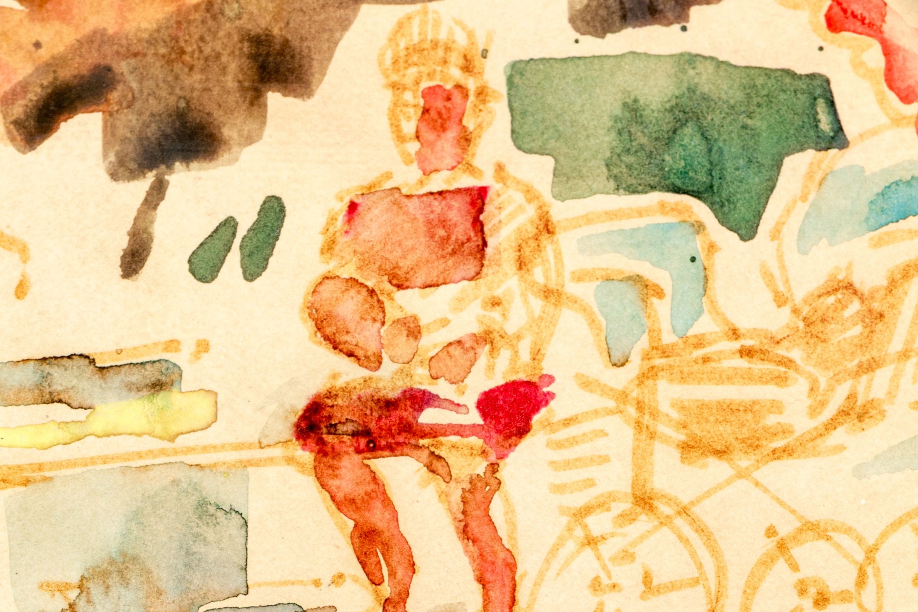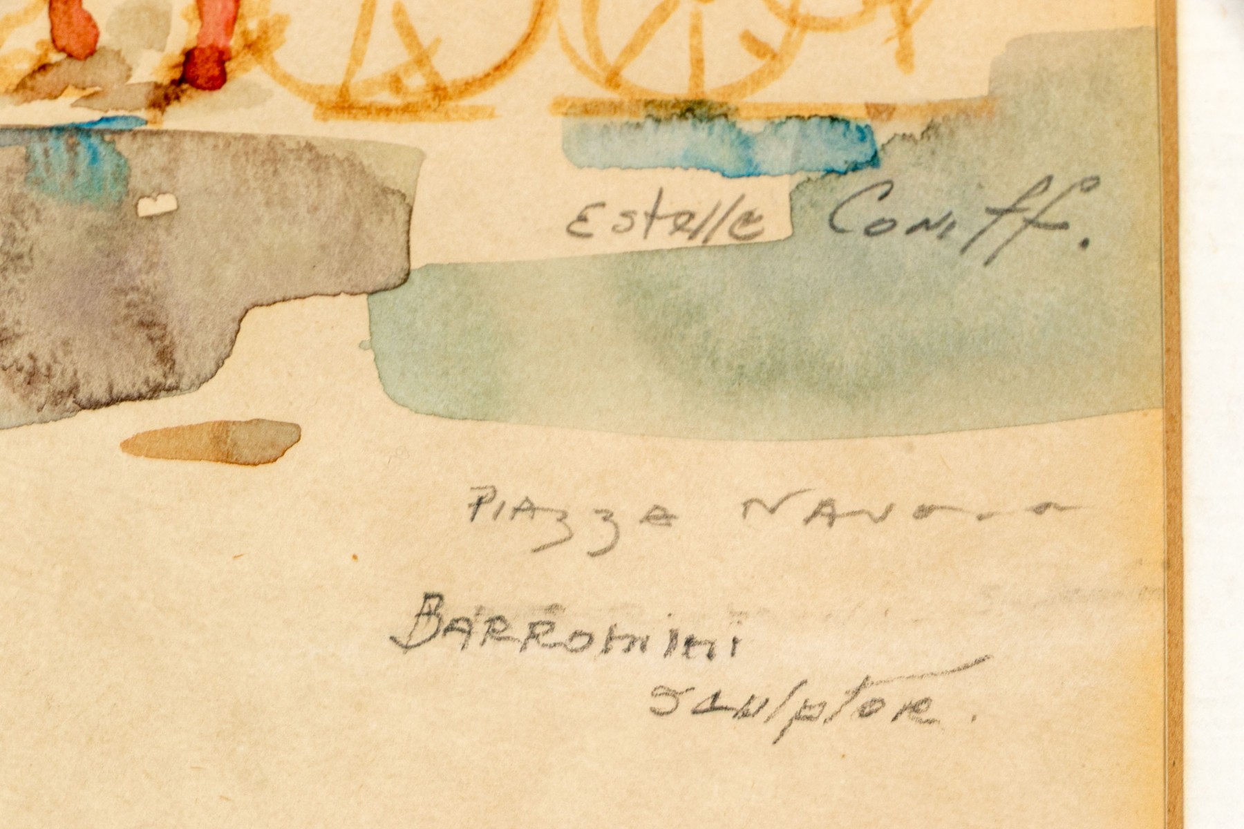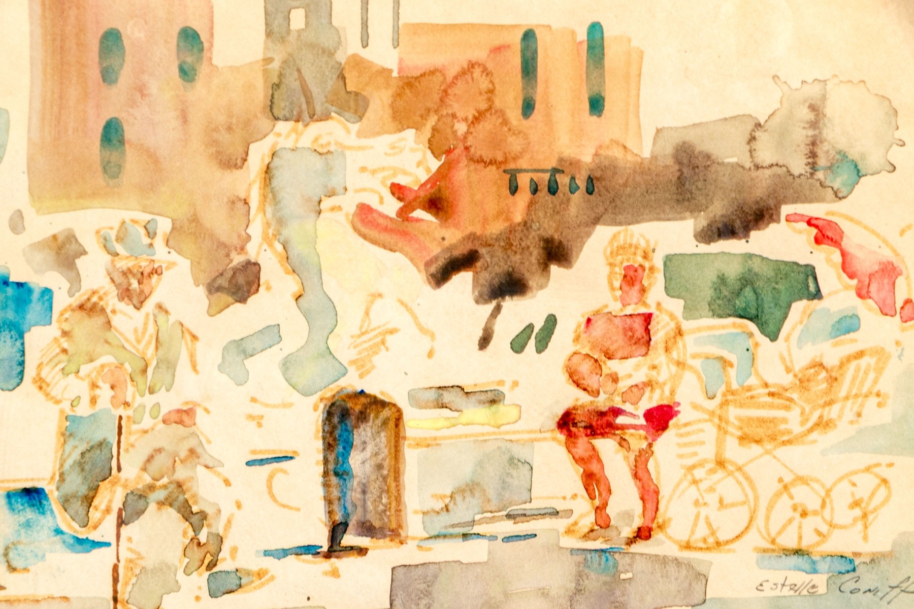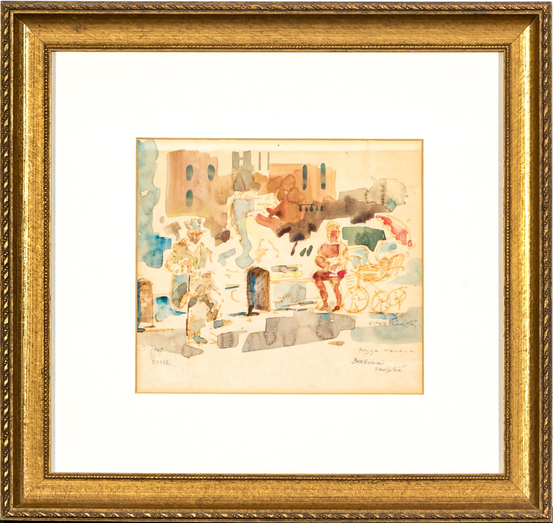 Estelle Keenan Coniff (American, 1912-2000) "Piazza Navona" watercolor painting on paper depicting an abstract scene of two figures seated in an urban Italian landscape. Rendered in a laid-back, expressive style with airy spaces between colors and forms. Signed lower right.