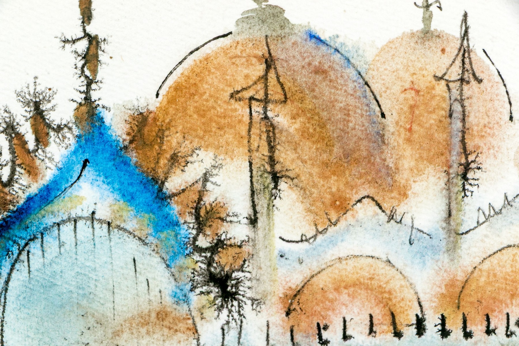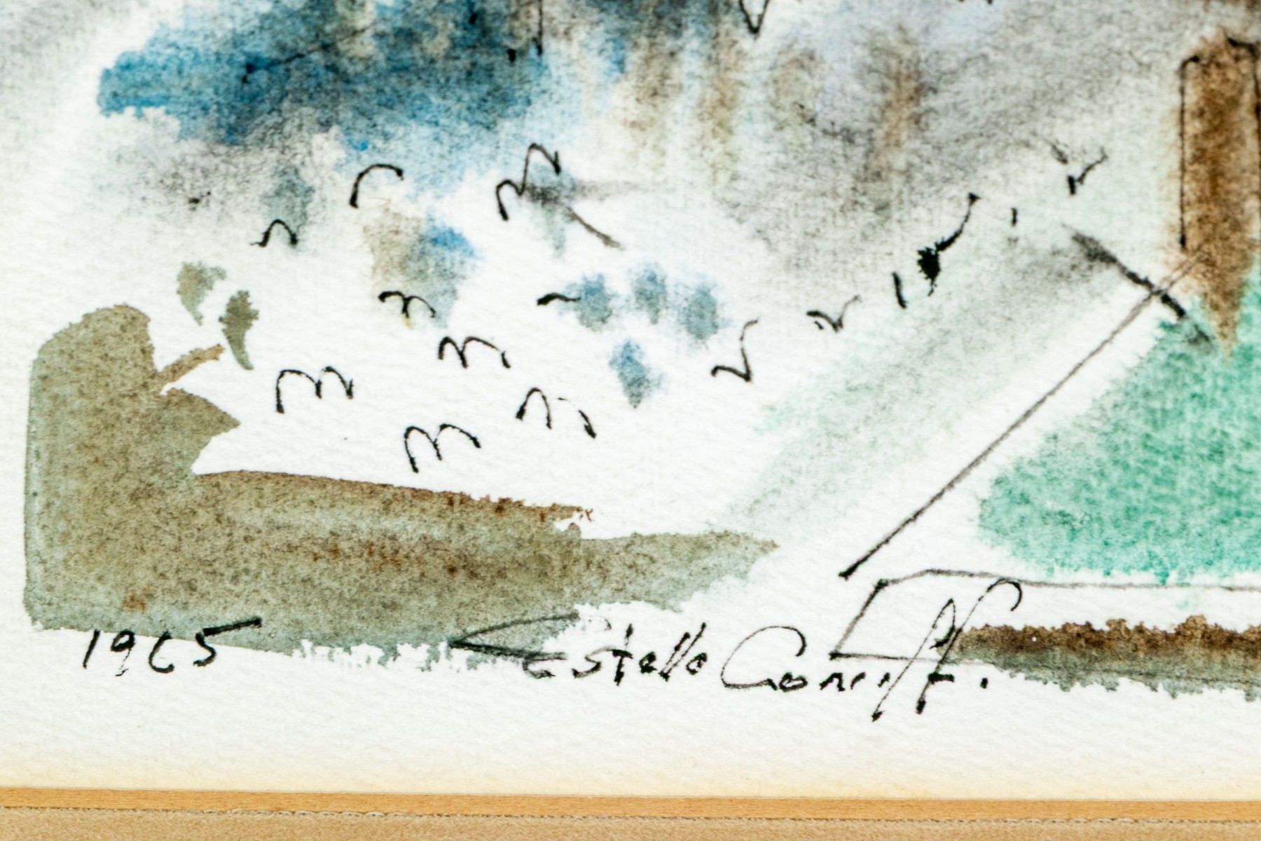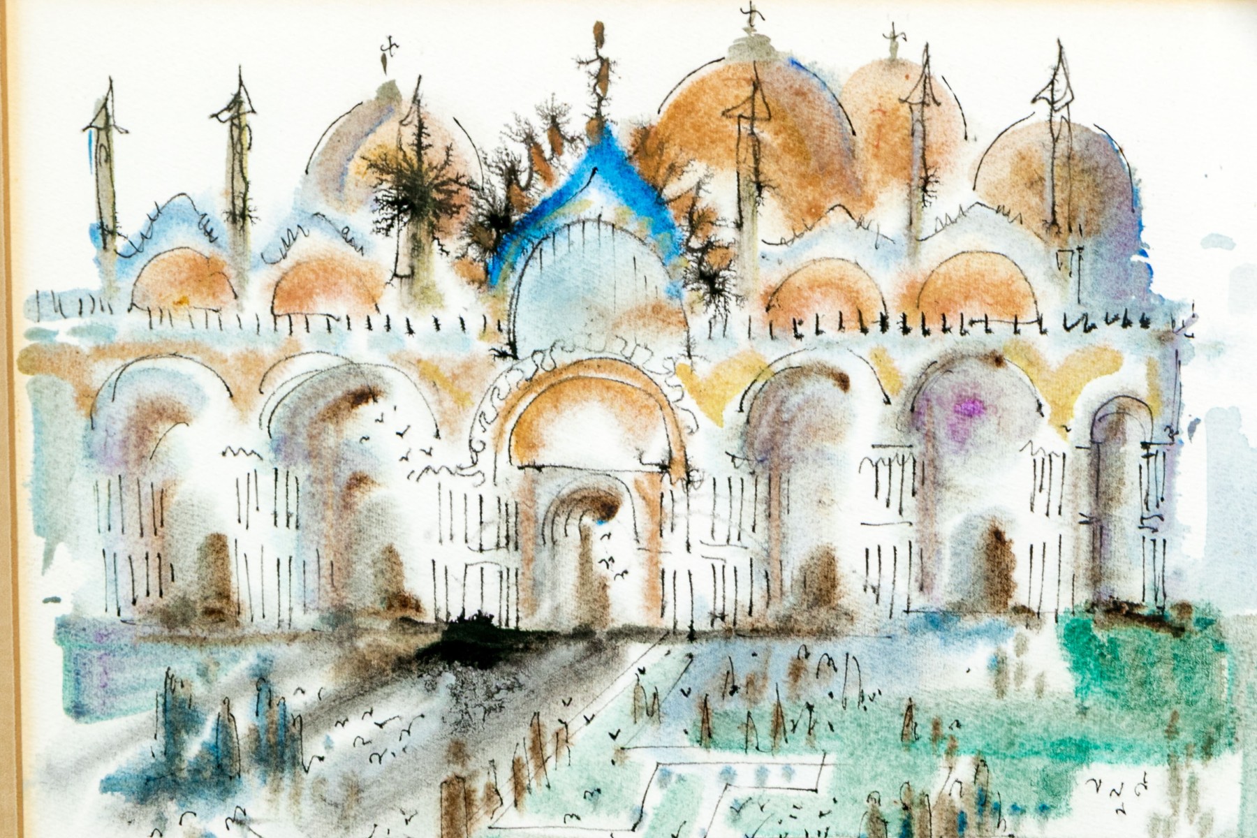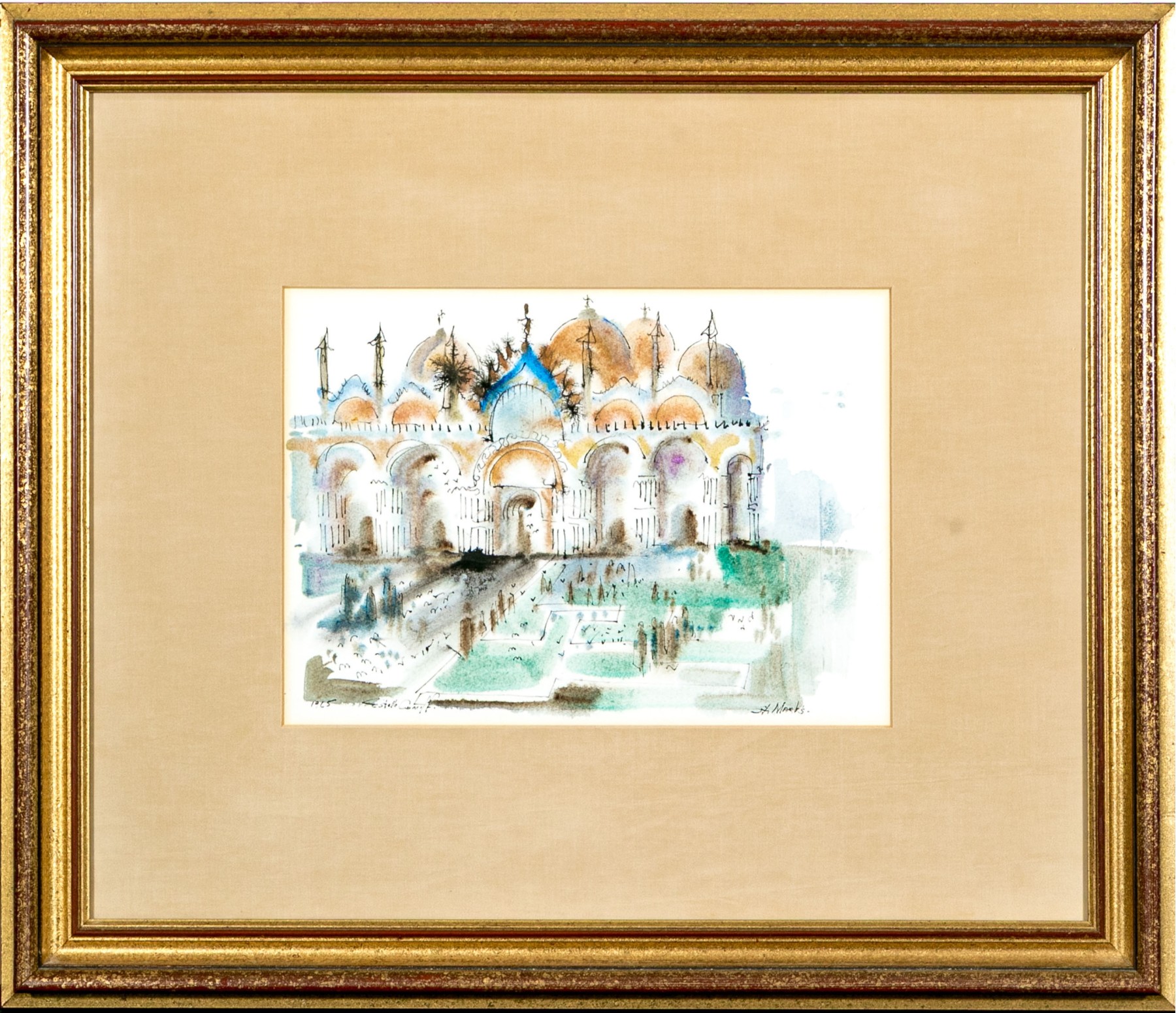 Estelle Keenan Coniff (American, 1912-2000) "St. Mark's" watercolor painting on paper depicting the titled Venetian basilica rendered in a loose, expressive style with vibrant pops of green, orange, and blue. Ink signed, dated 1965, and titled along the lower margin.
