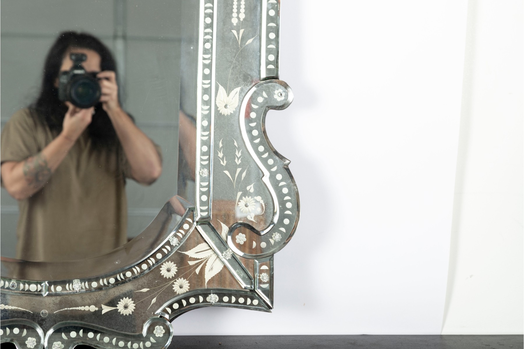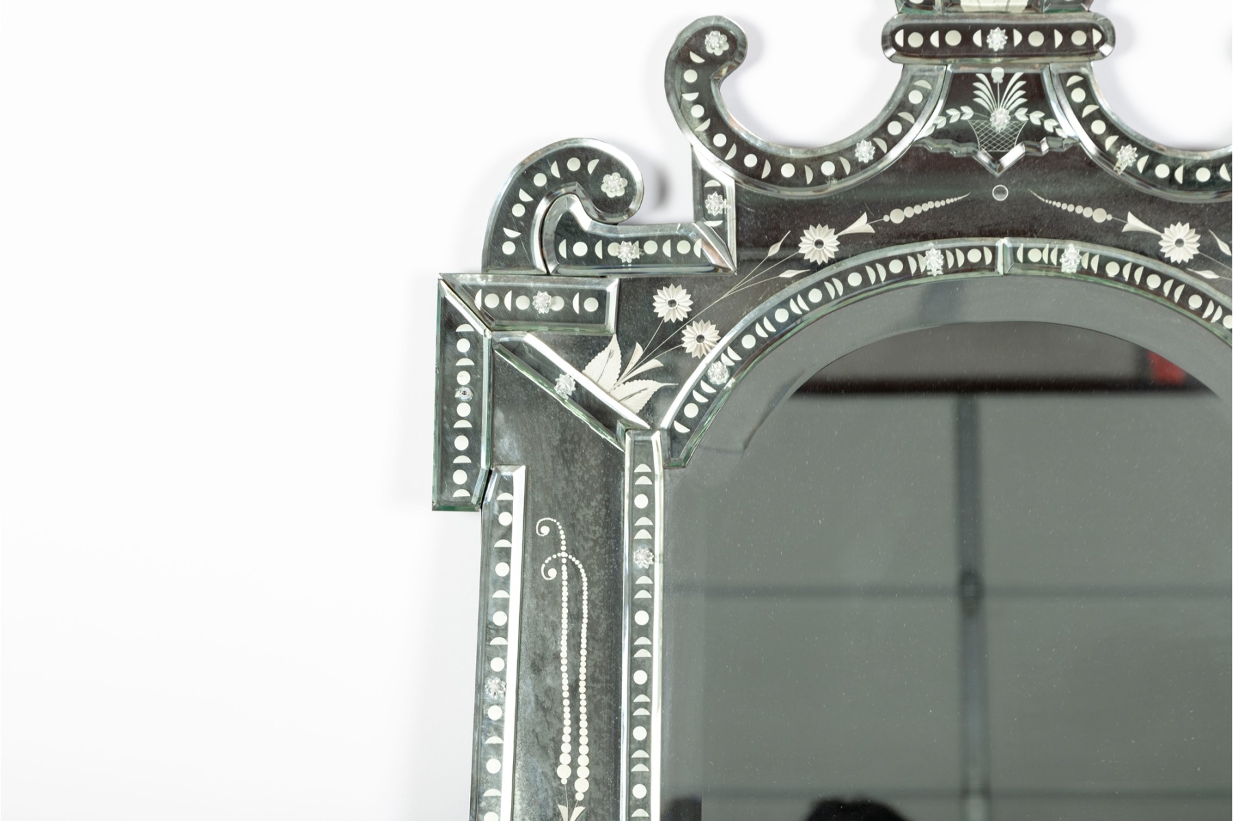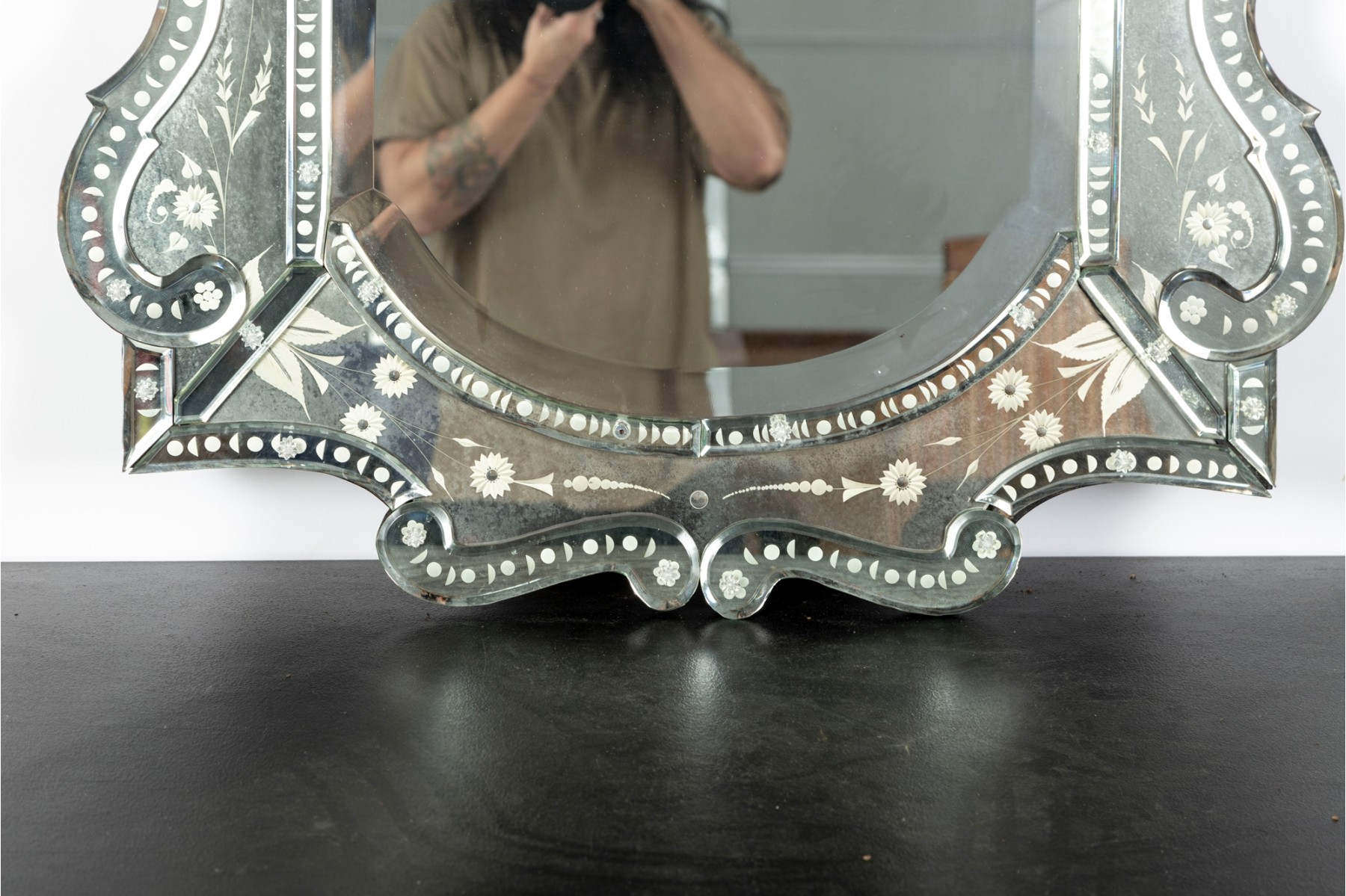 An etched Venetian glass mirror featuring an ornate design with intricate floral and scrollwork patterns etched directly into the glass. The frame is composed of individual mirrored panels, carefully arranged to create a luxurious and elegant look.