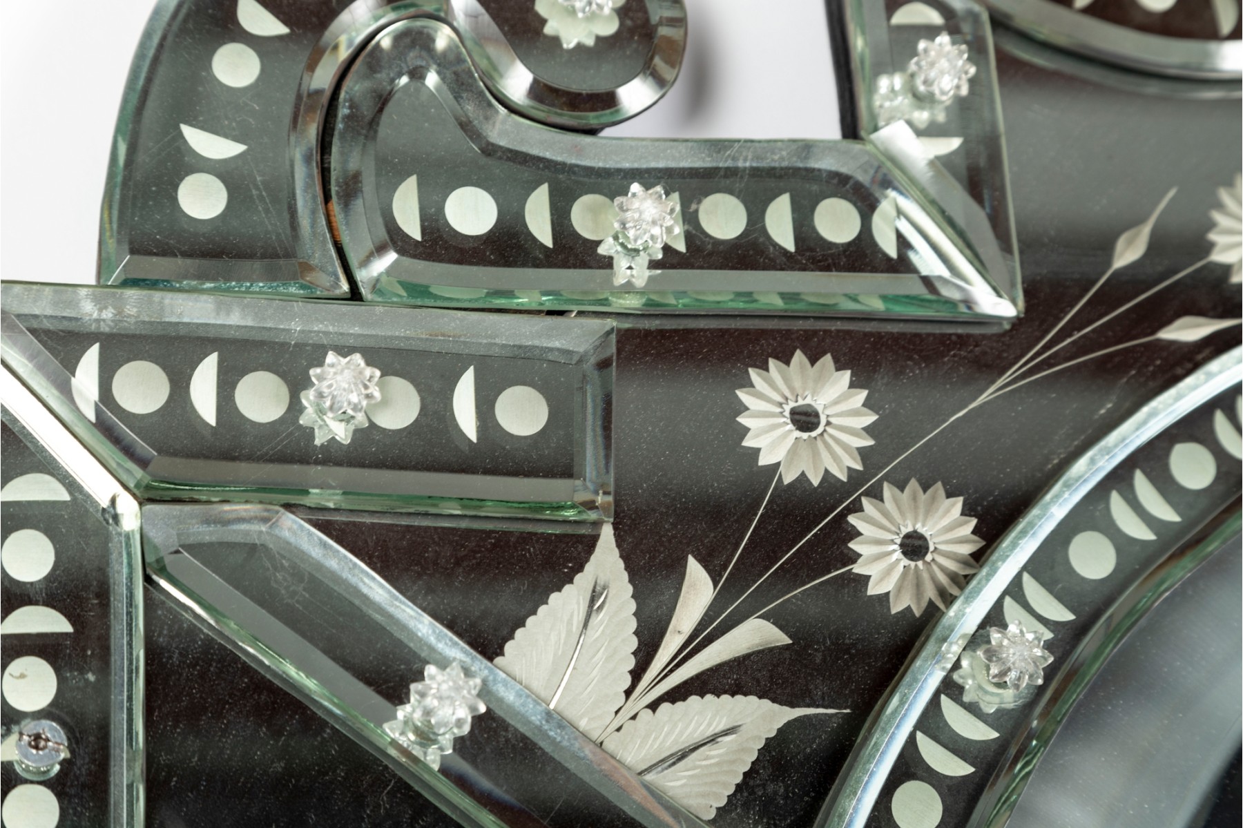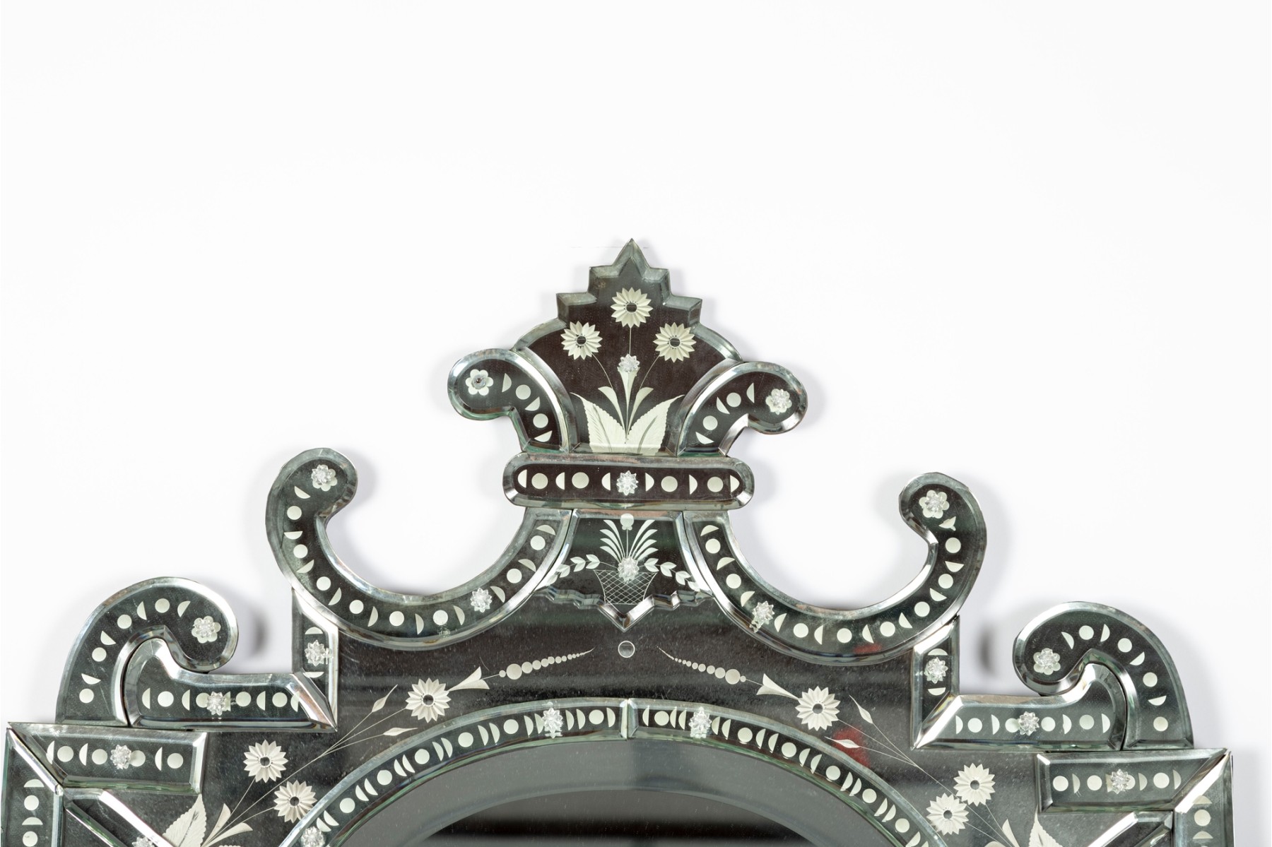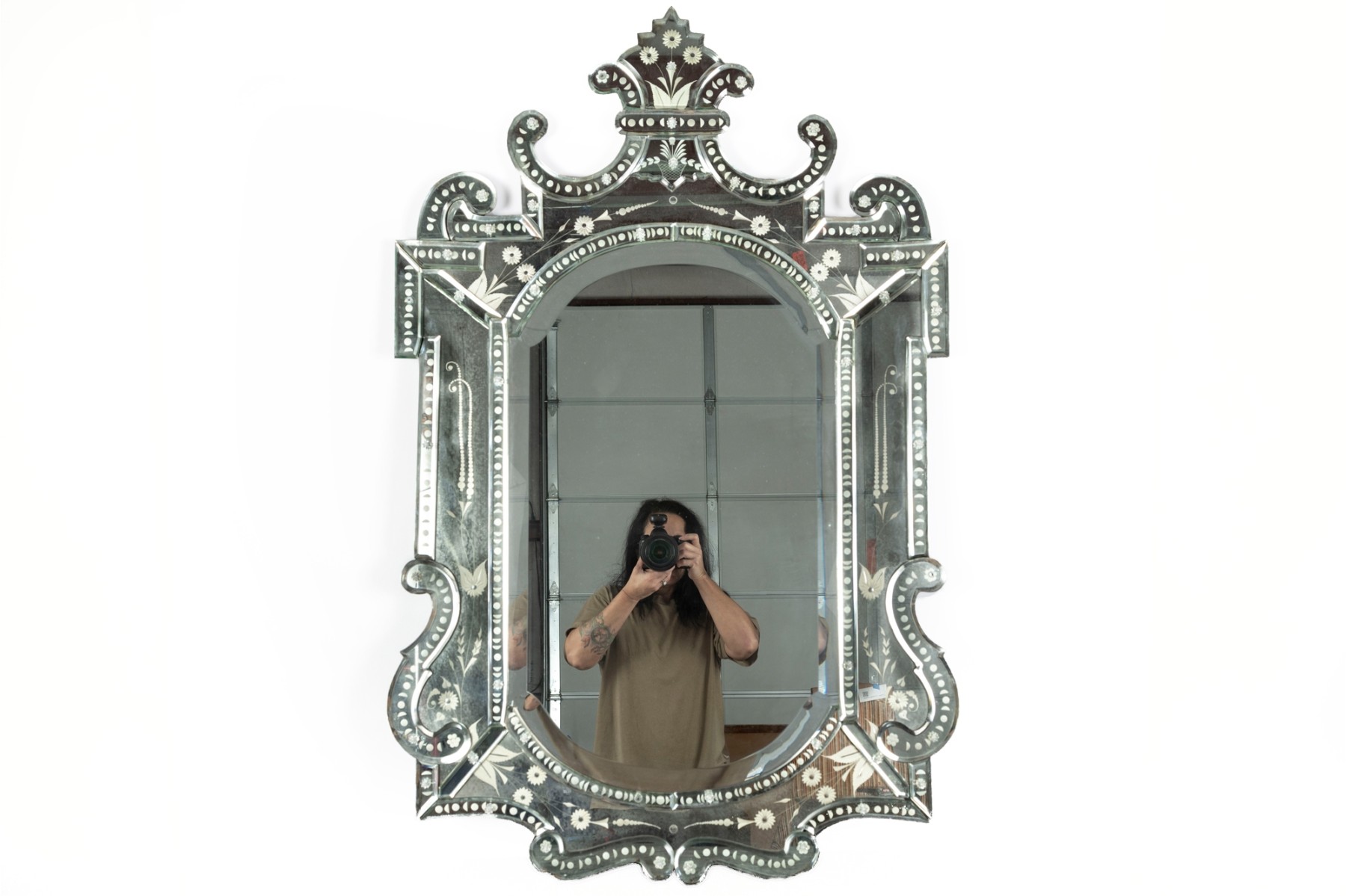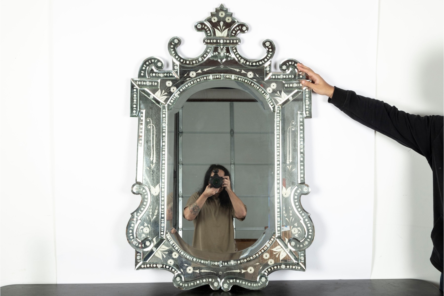 An etched Venetian glass mirror featuring an ornate design with intricate floral and scrollwork patterns etched directly into the glass. The frame is composed of individual mirrored panels, carefully arranged to create a luxurious and elegant look.
