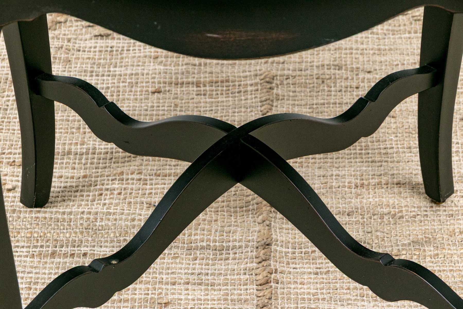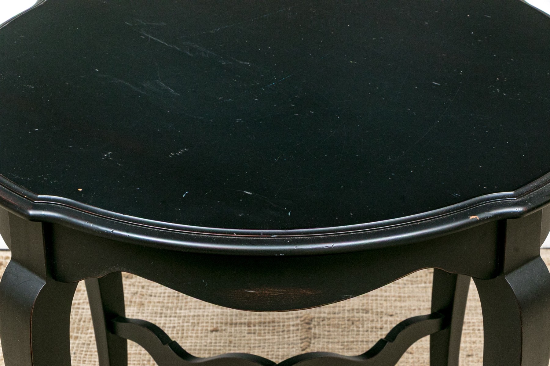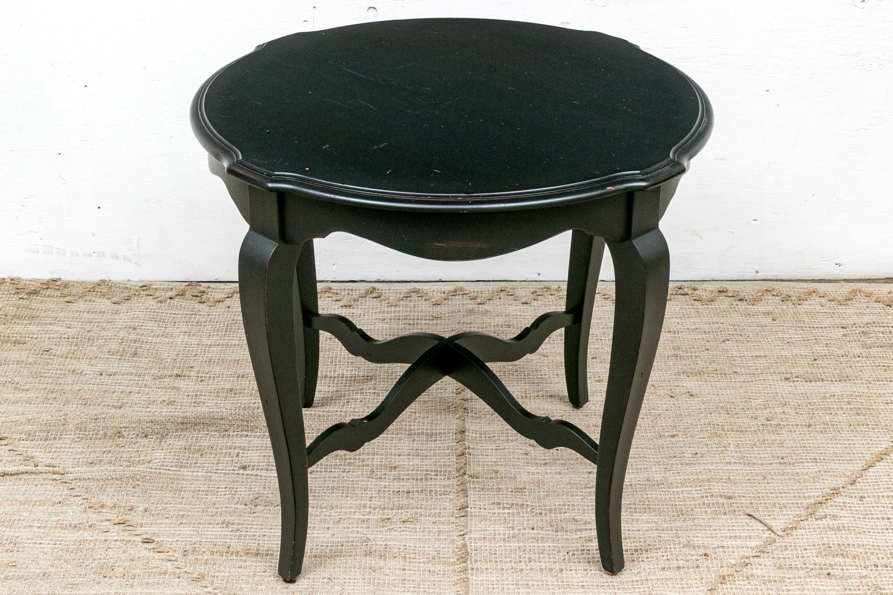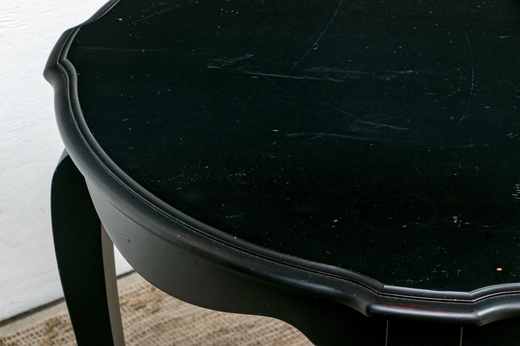 On four cabriole legs with carved 'X' form stretcher supports underneath the table top. Circular form table top with four sections that extend slightly where the legs terminate at the top of table. Nicely carved and handsomely finished in black.