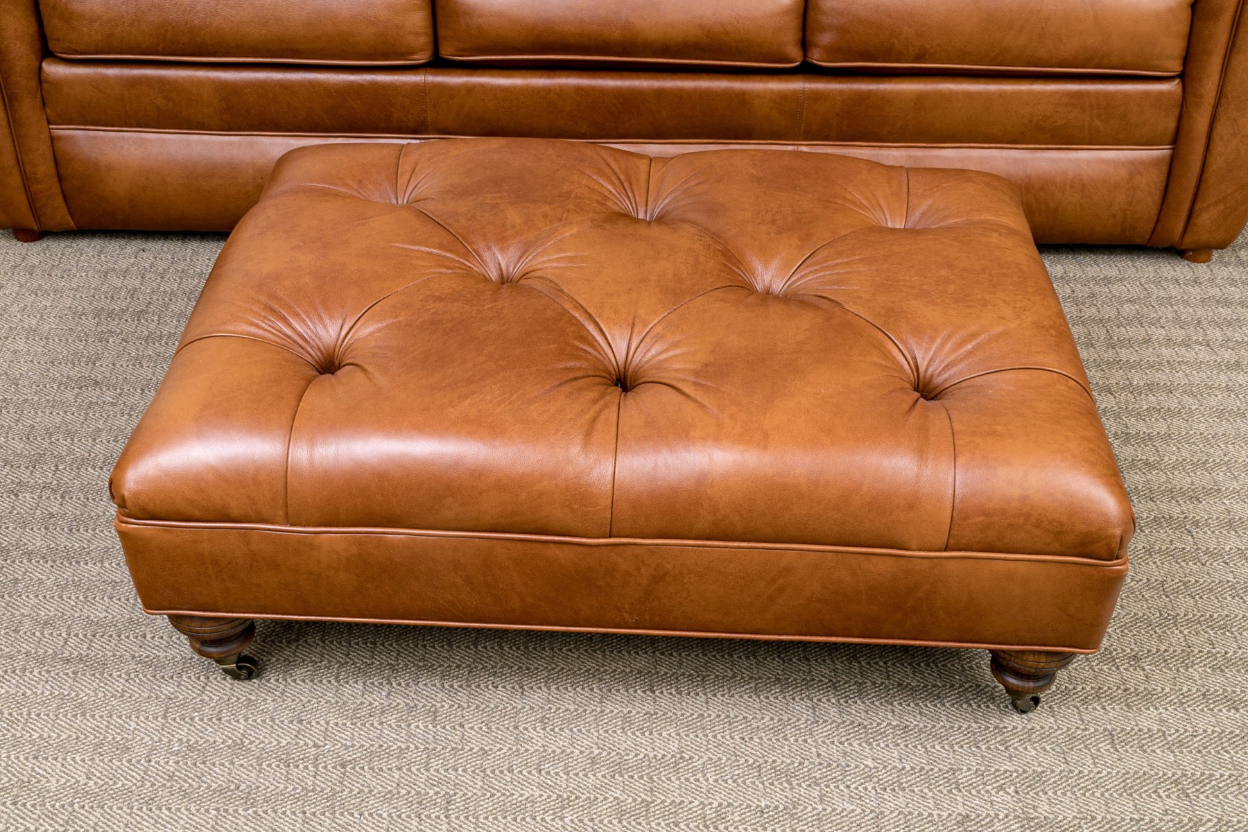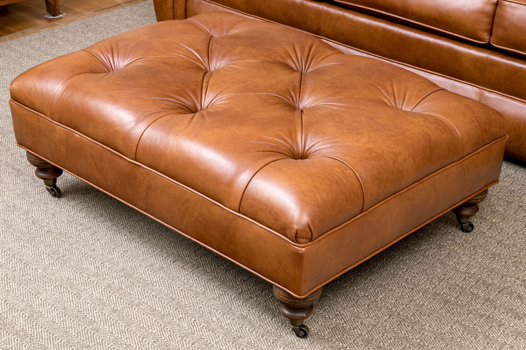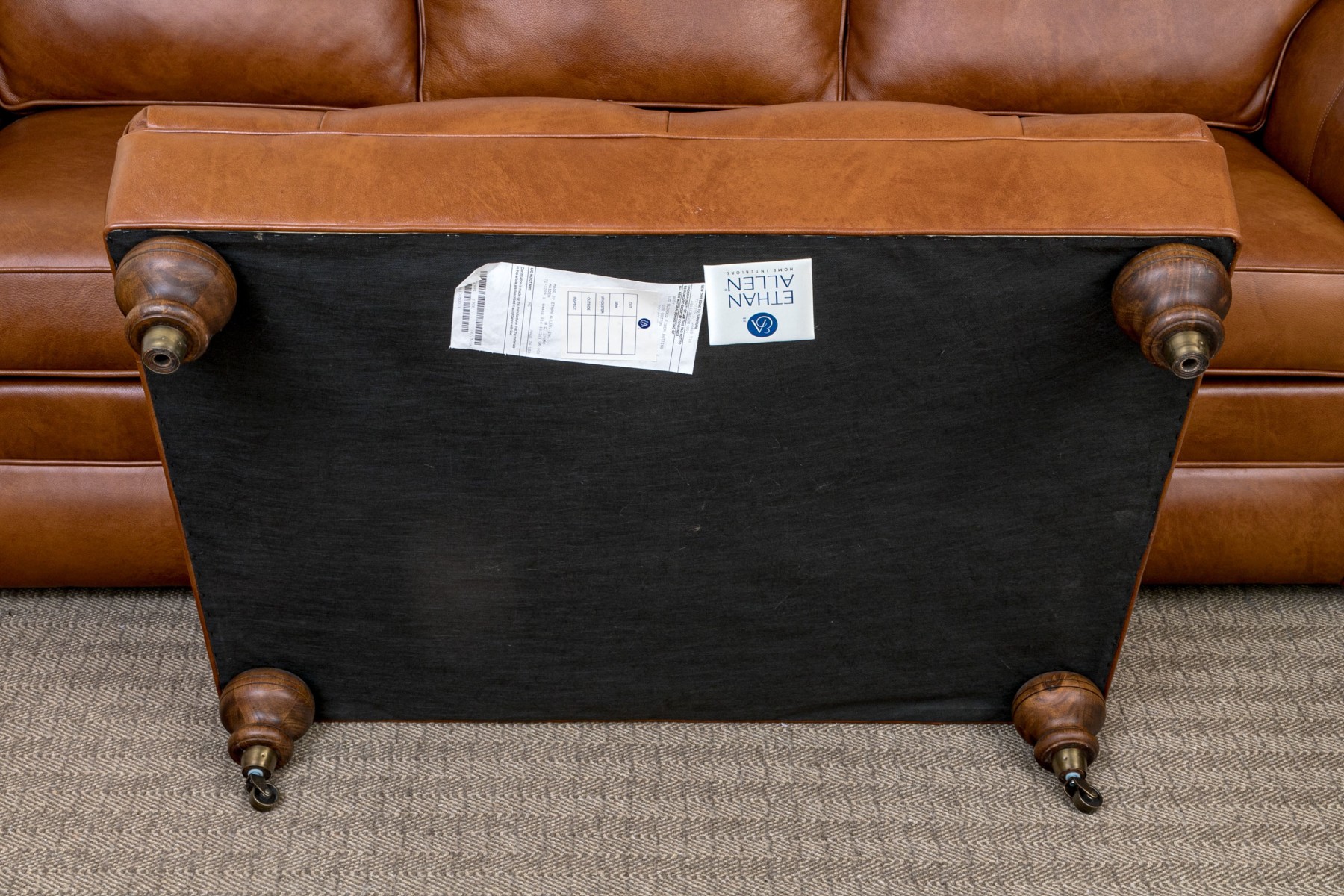 Handsome Ethan Allen leather upholstered ottoman enhanced with decorative button tufting.