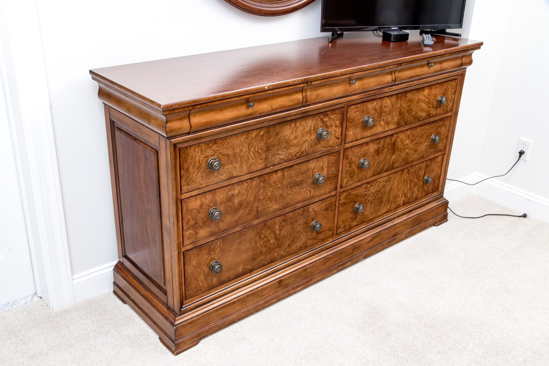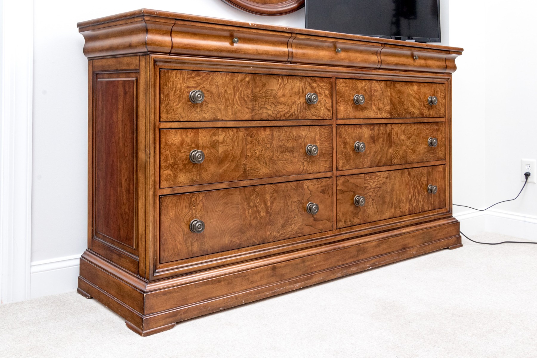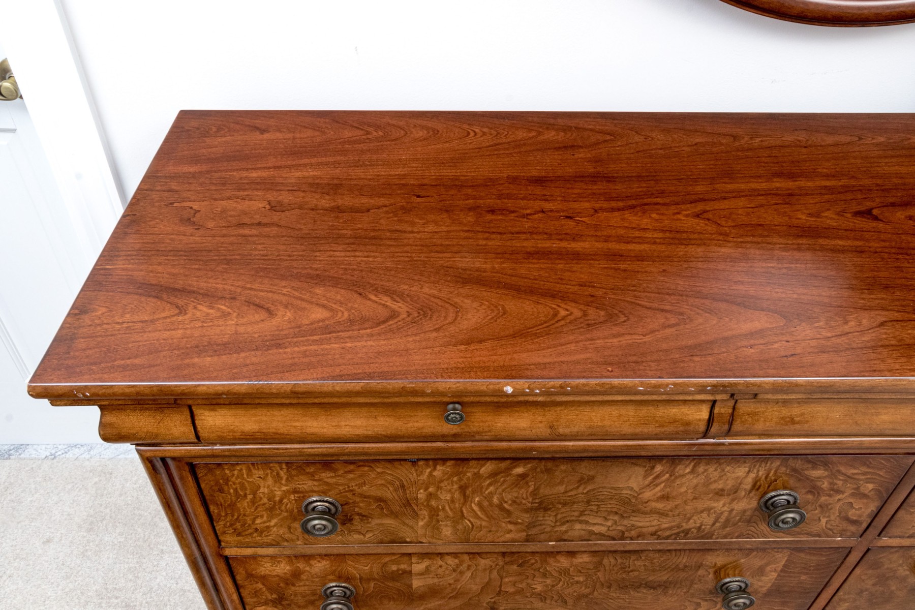 An Ethan Allen Townhouse Dresser handsomely crafted with six burl veneered drawers and an additional discreet row of three drawers just below the top.
