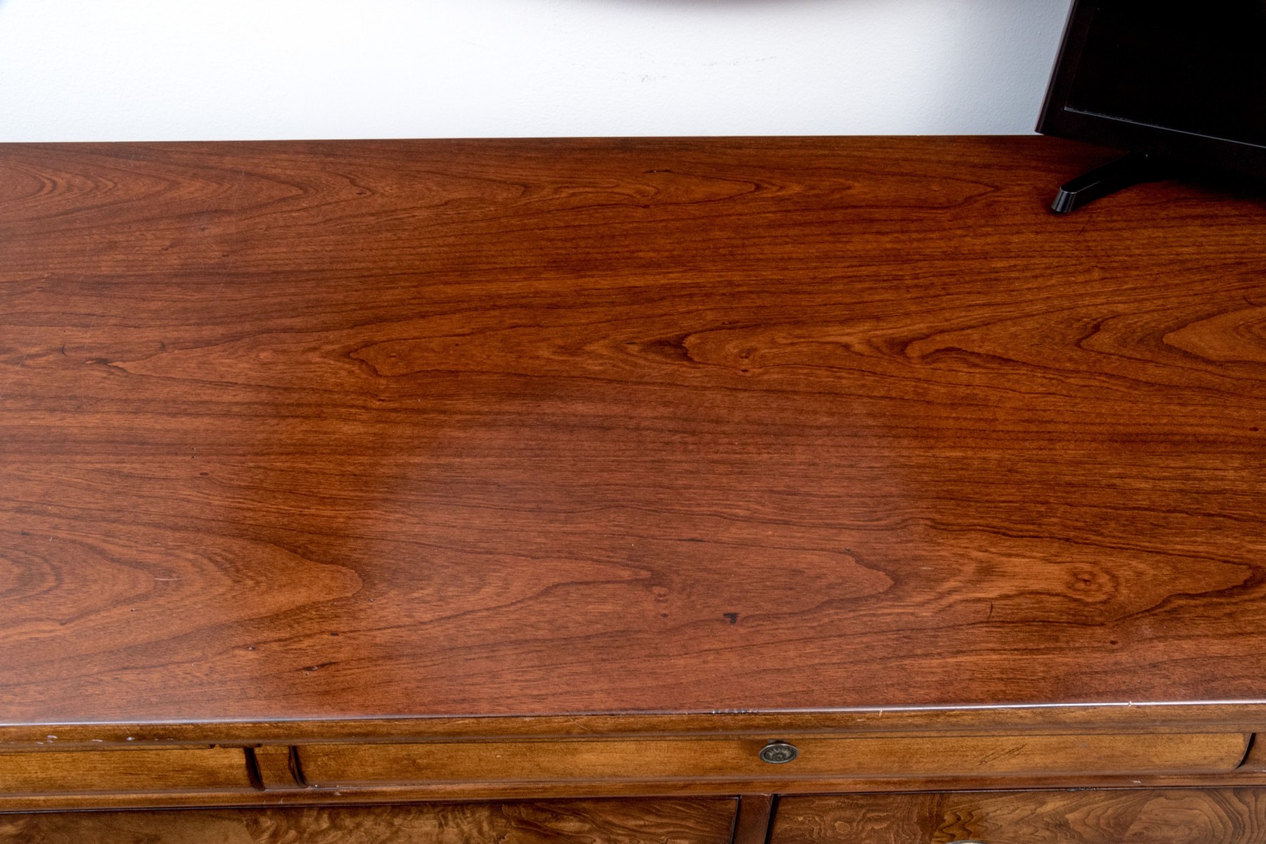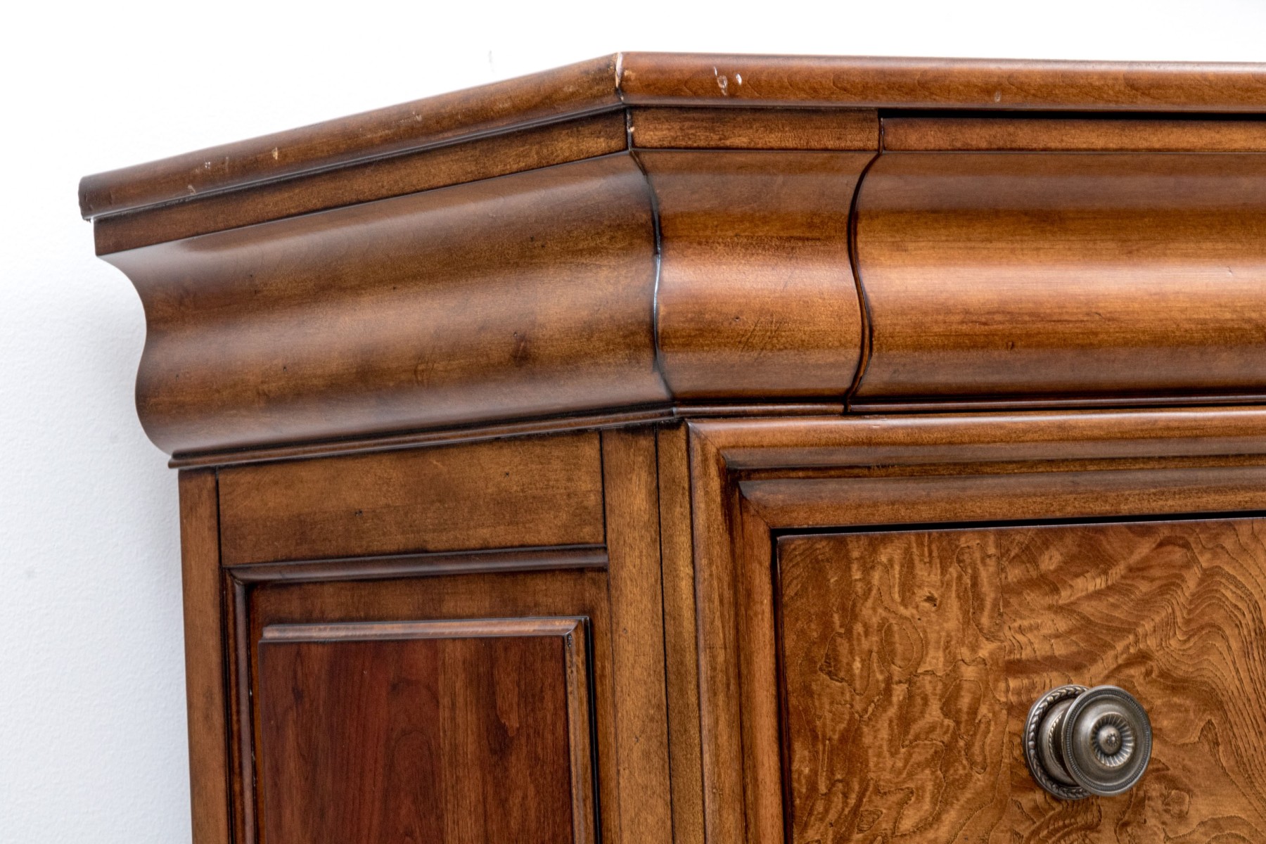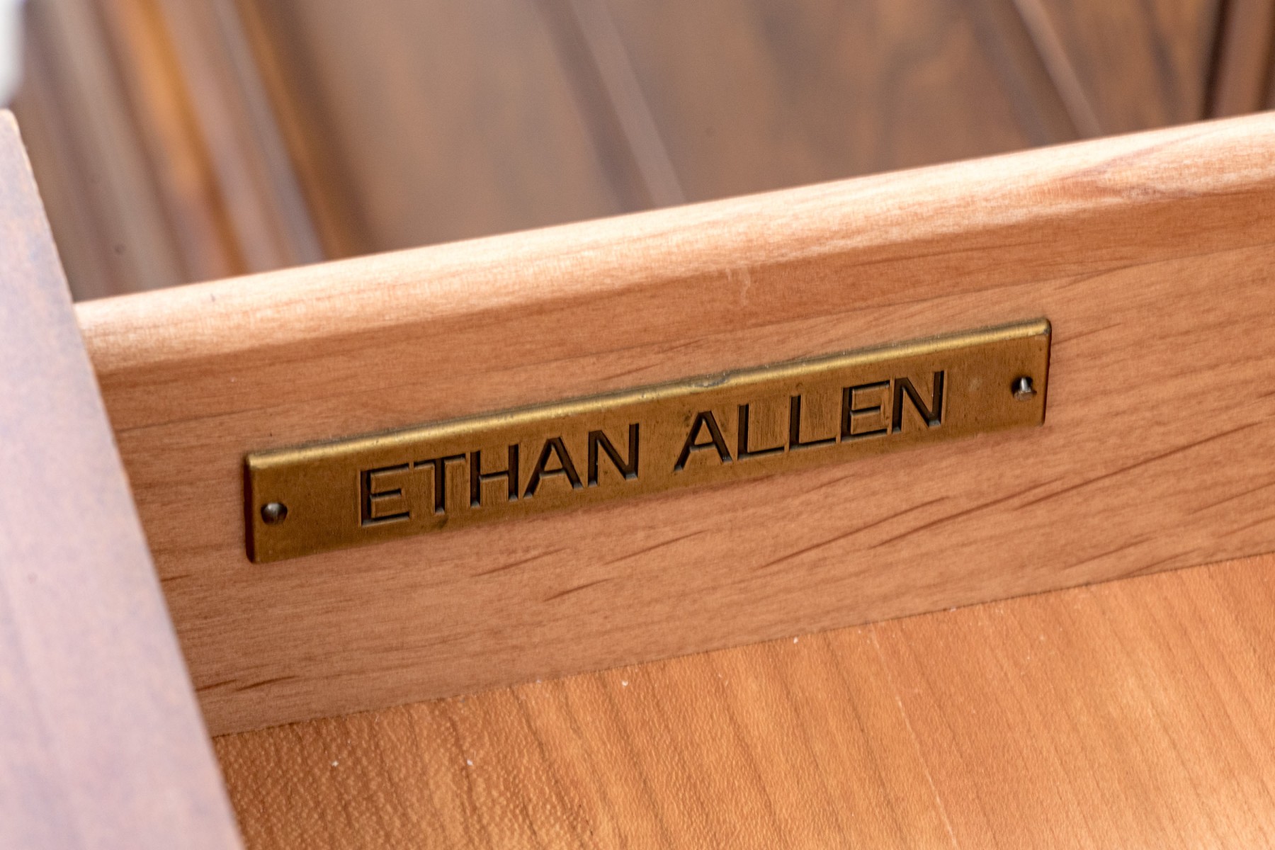 An Ethan Allen Townhouse Dresser handsomely crafted with six burl veneered drawers and an additional discreet row of three drawers just below the top.