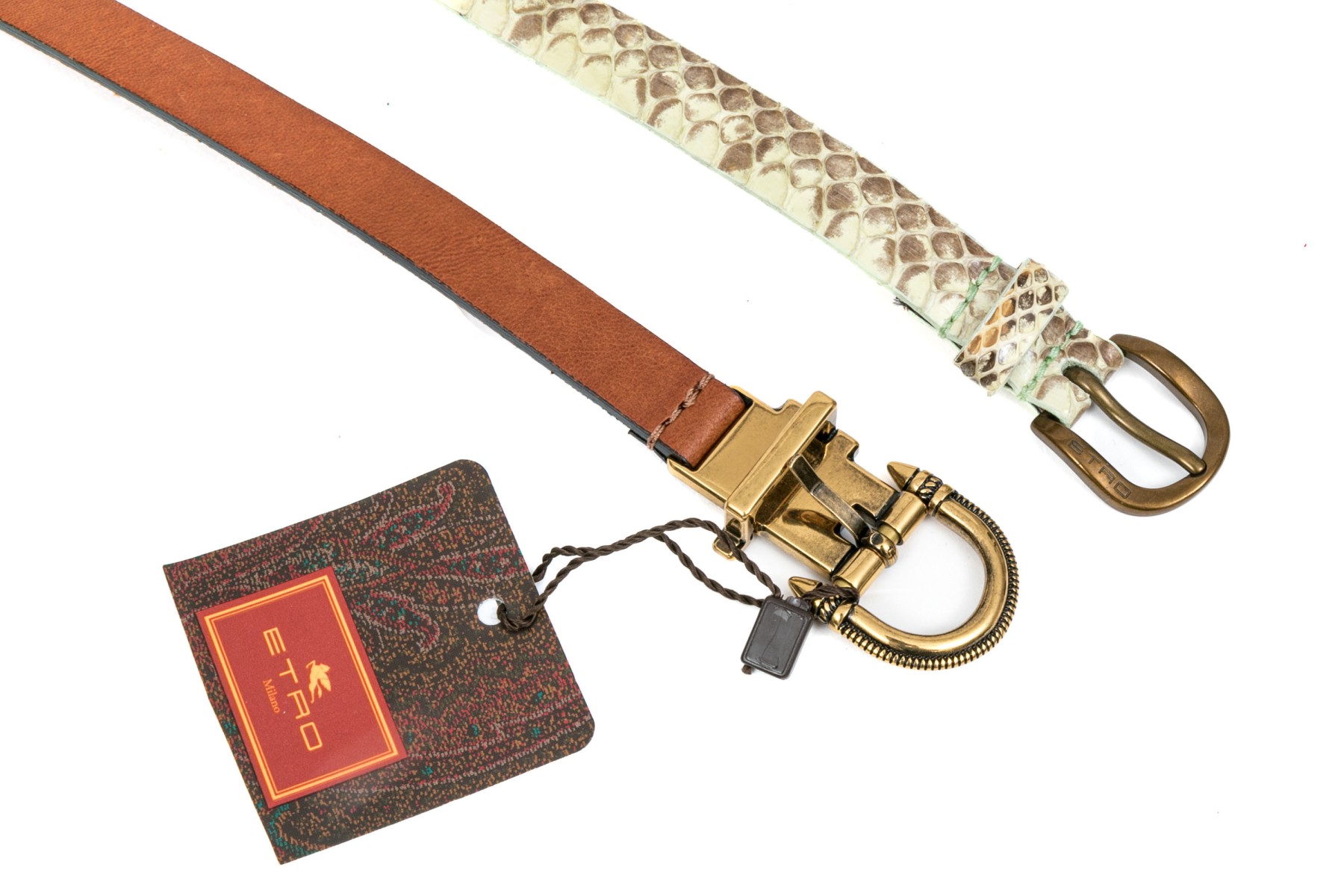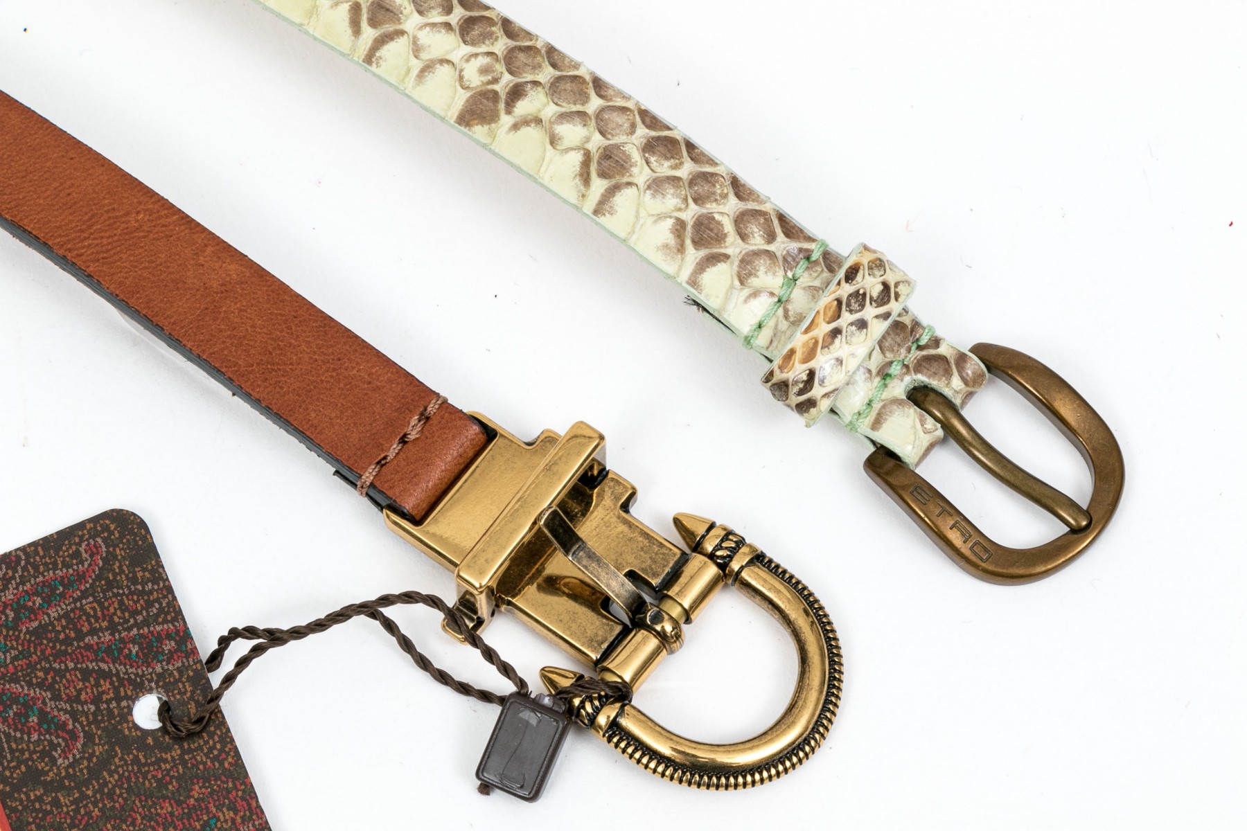 Etro lovely pair of two narrow belts, leather and snakeskin grains
