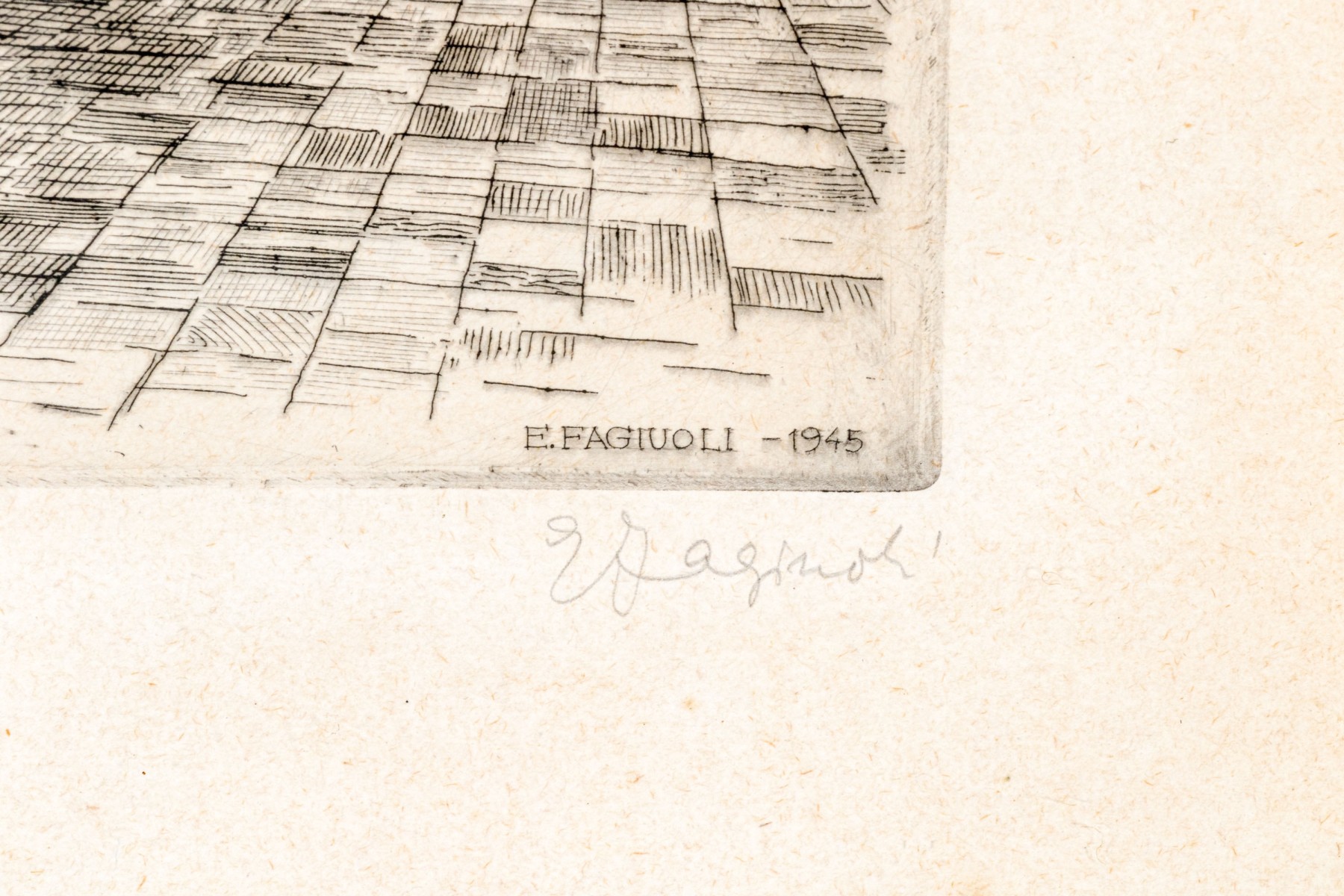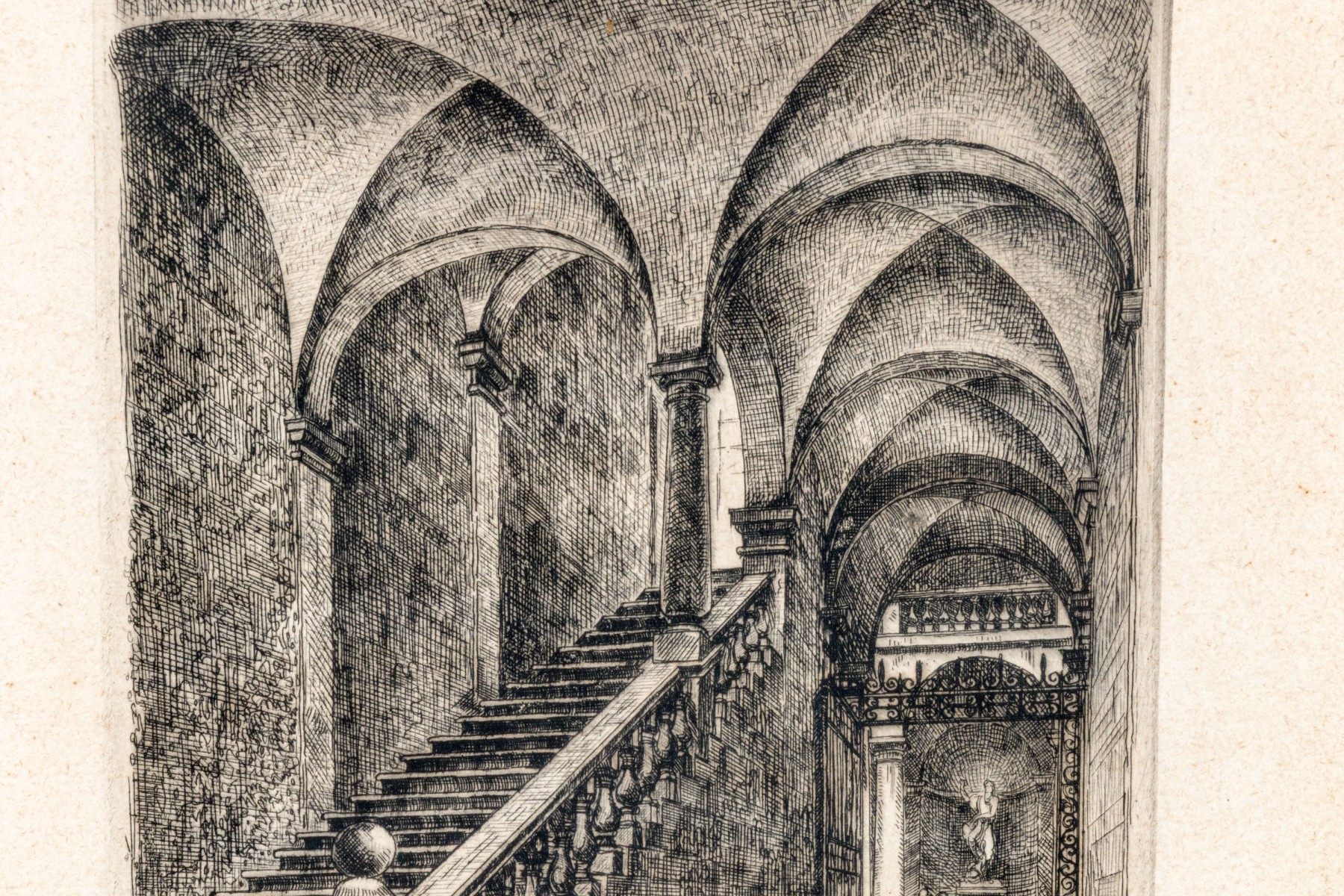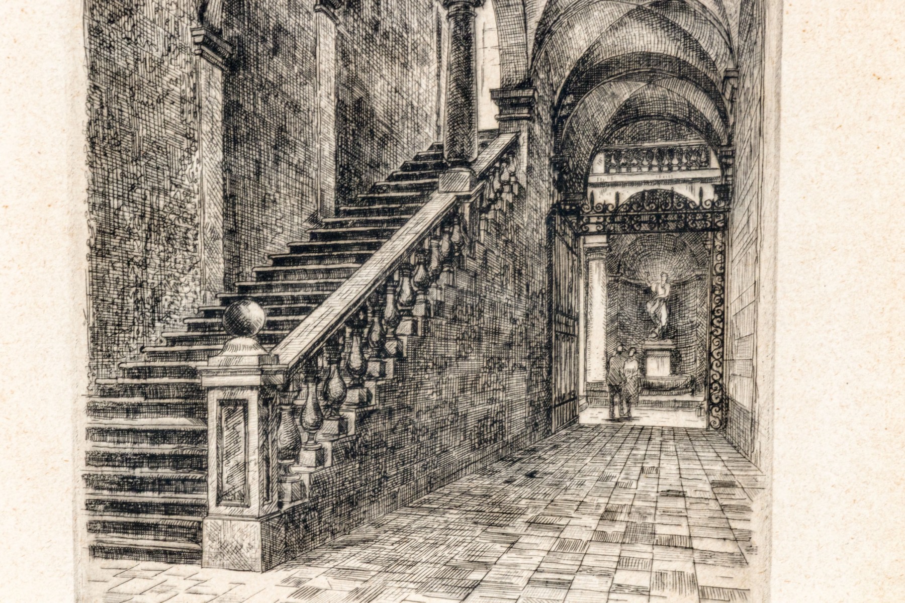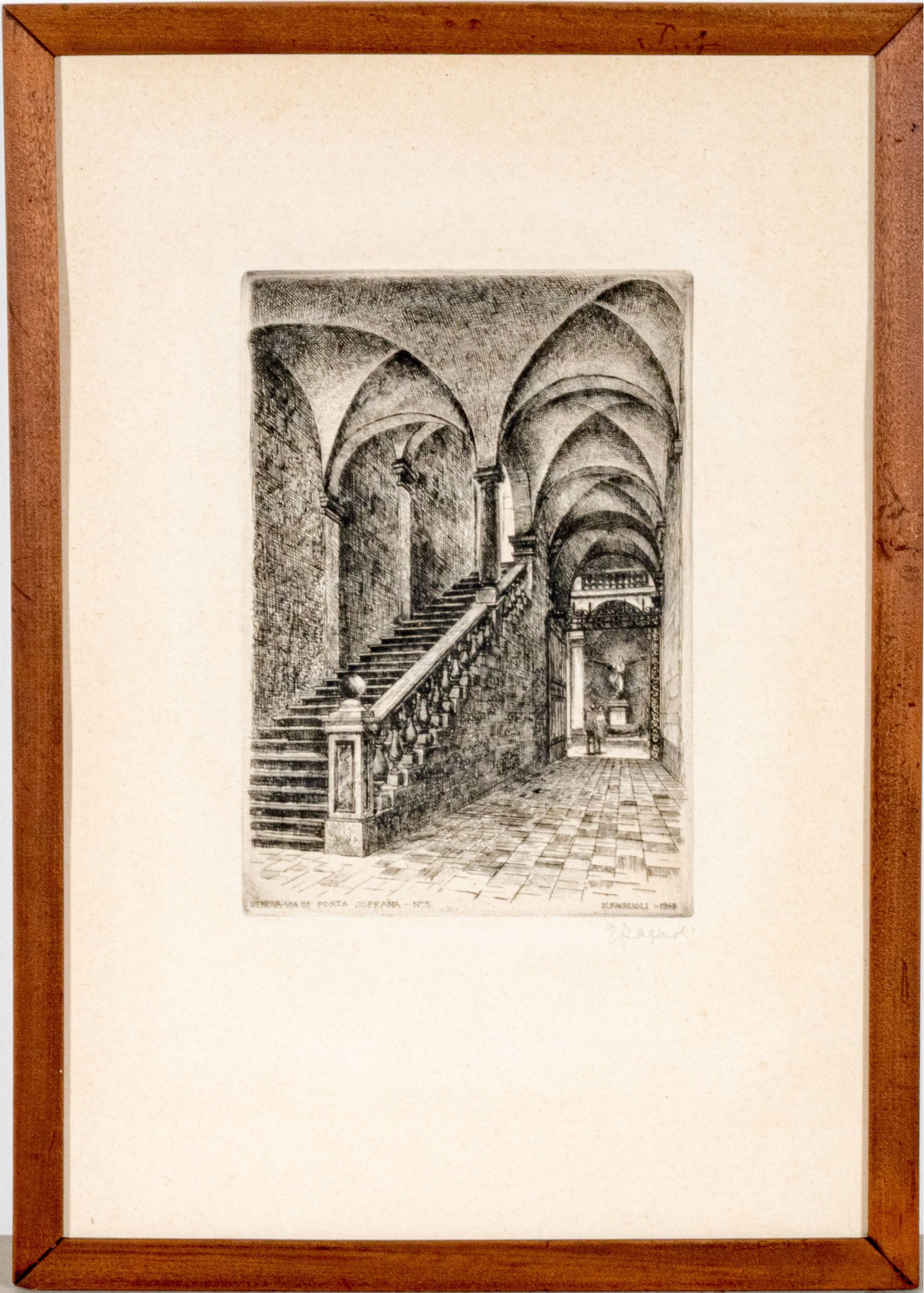 Ettore Fagiuoli (Italian, 1884-1961) "Genova-Via Di Porta Soprana-No.5" engraving depicting a foyer with an impressively vaulted ceiling drawing the eye through layered triangular geometry over a tiled floor with a grand staircase to the left. Pencil signed to mat out of plate. Plate signed, dated and titled.