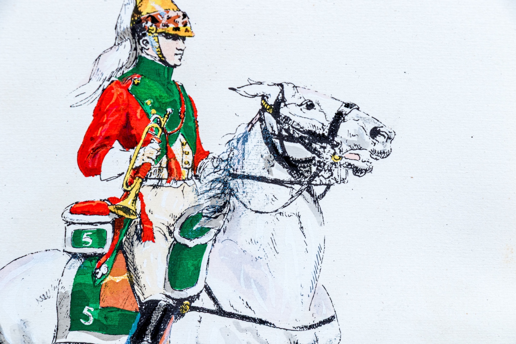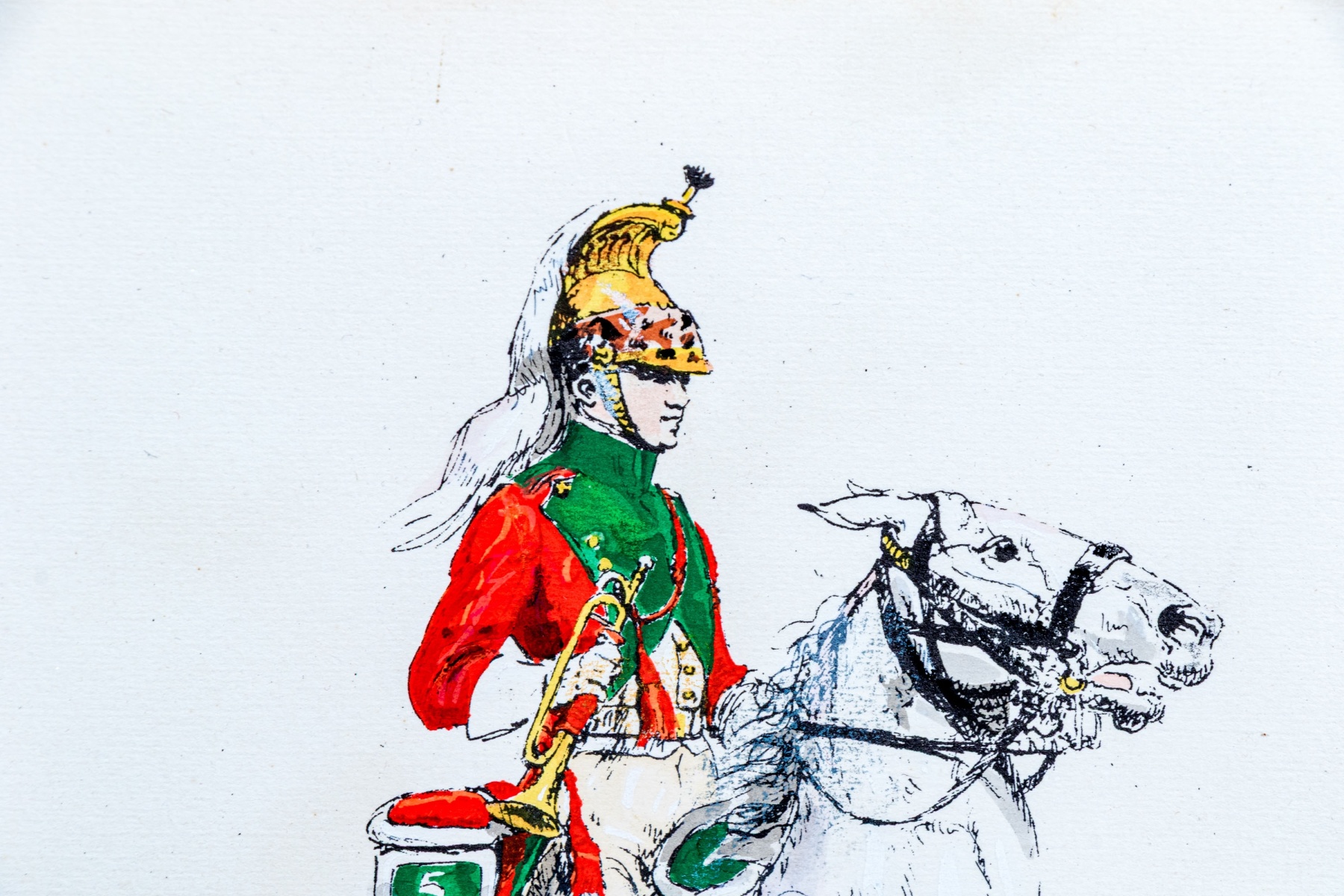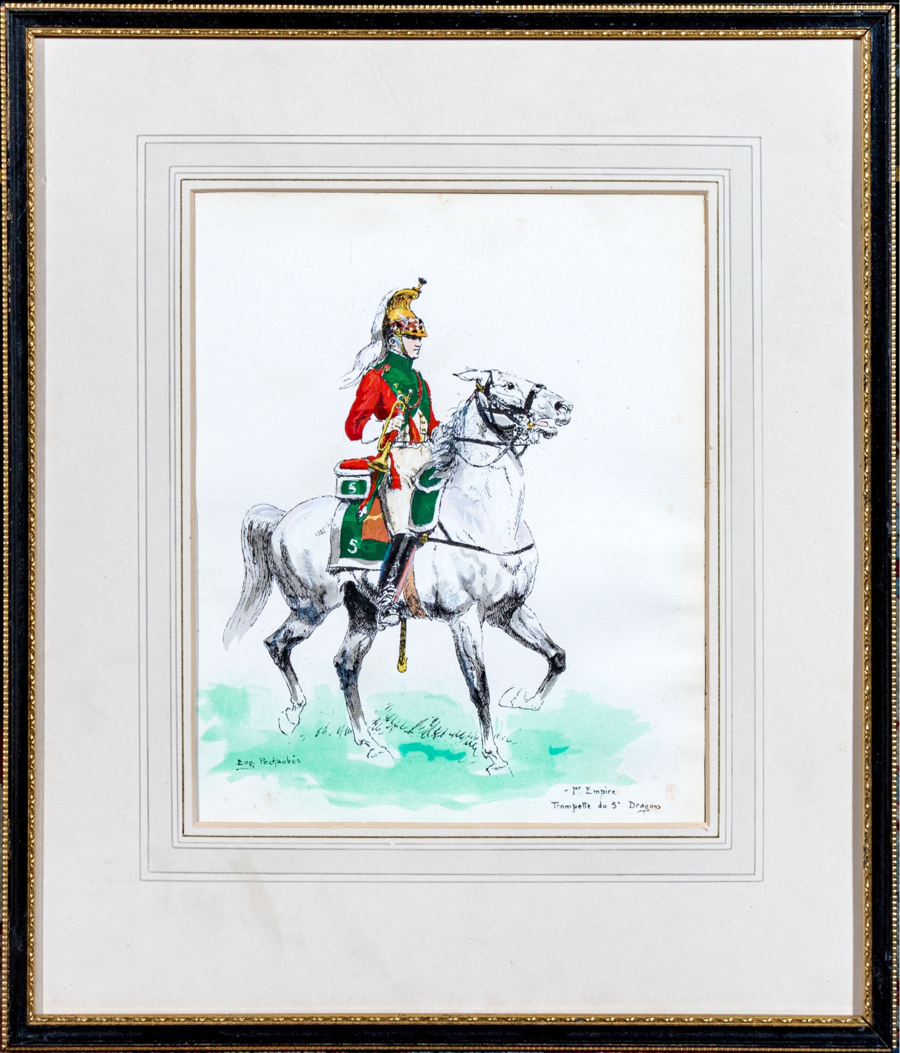 Eugene Pechaubes (French, 1890-1967) "1er Empire Trompette du 5e Dragons" hand colored etching on paper depicting a trumpeter from the French cavalry wearing vibrant green and red while riding on a white horse over a teal-green ground. Signed in plate lower left and titled lower right.