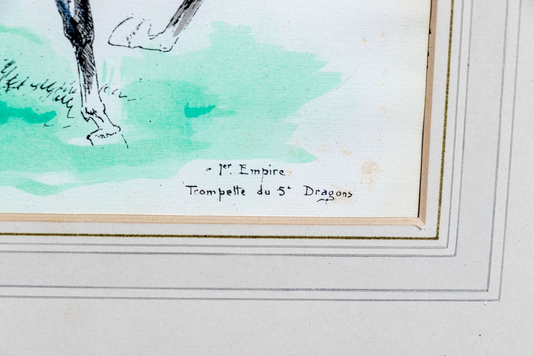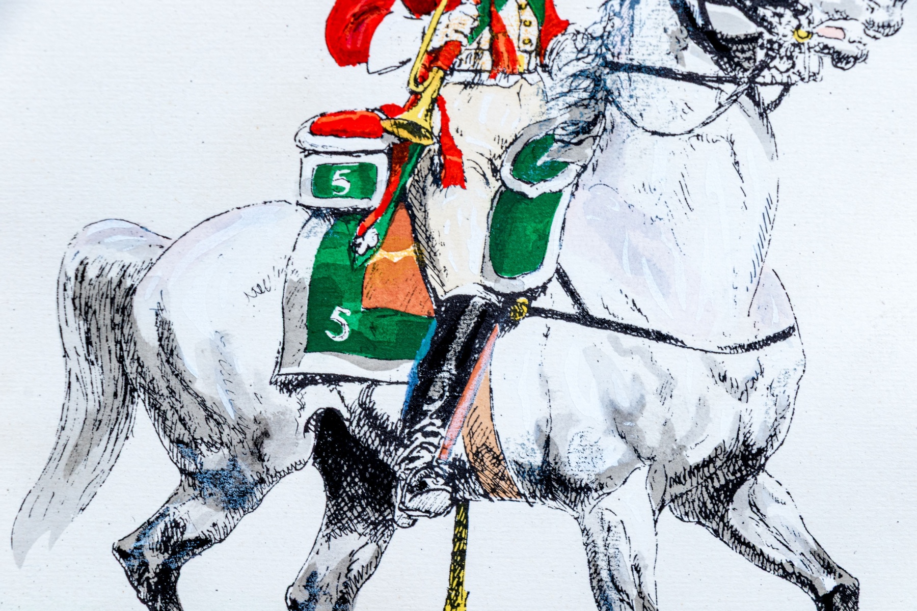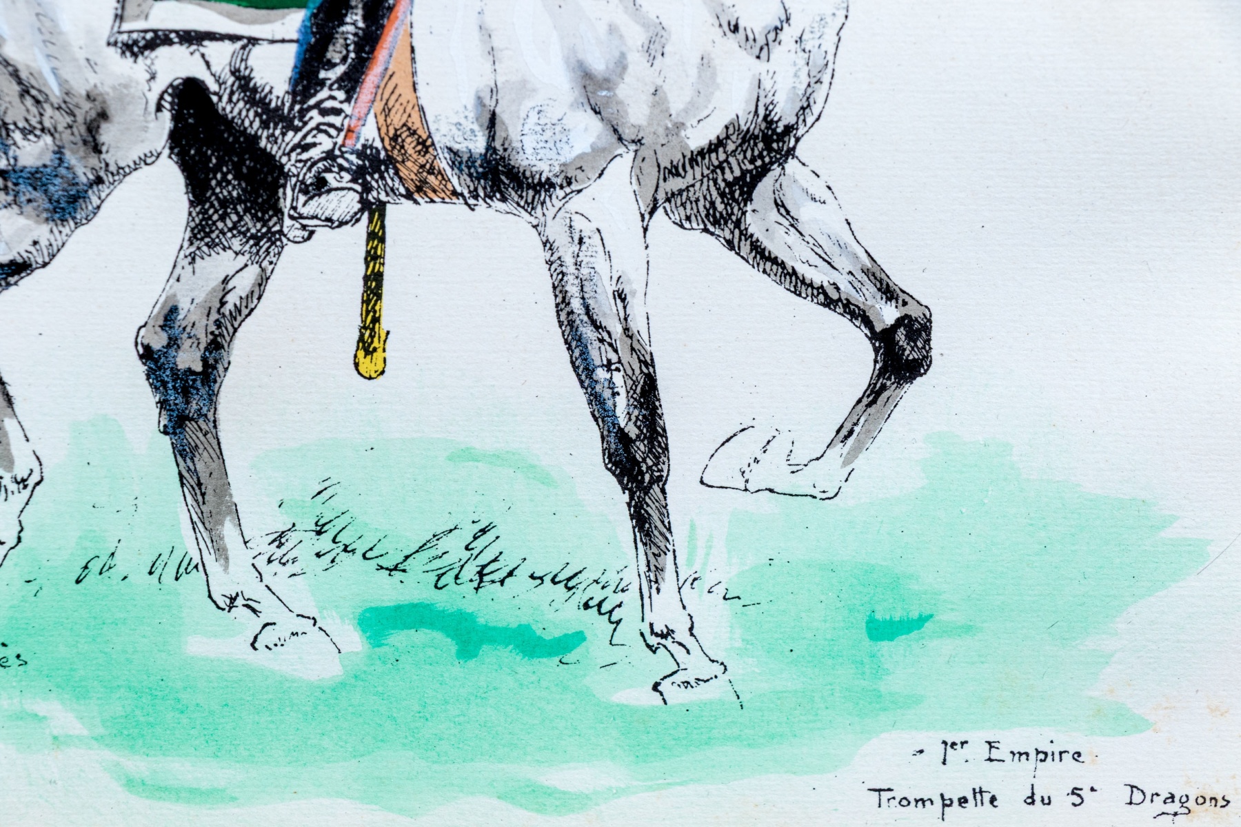 Eugene Pechaubes (French, 1890-1967) "1er Empire Trompette du 5e Dragons" hand colored etching on paper depicting a trumpeter from the French cavalry wearing vibrant green and red while riding on a white horse over a teal-green ground. Signed in plate lower left and titled lower right.