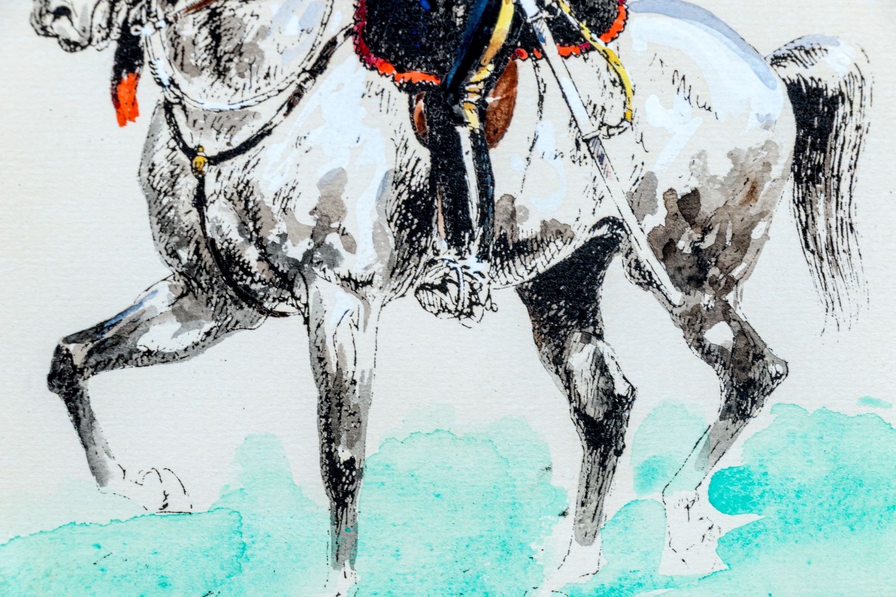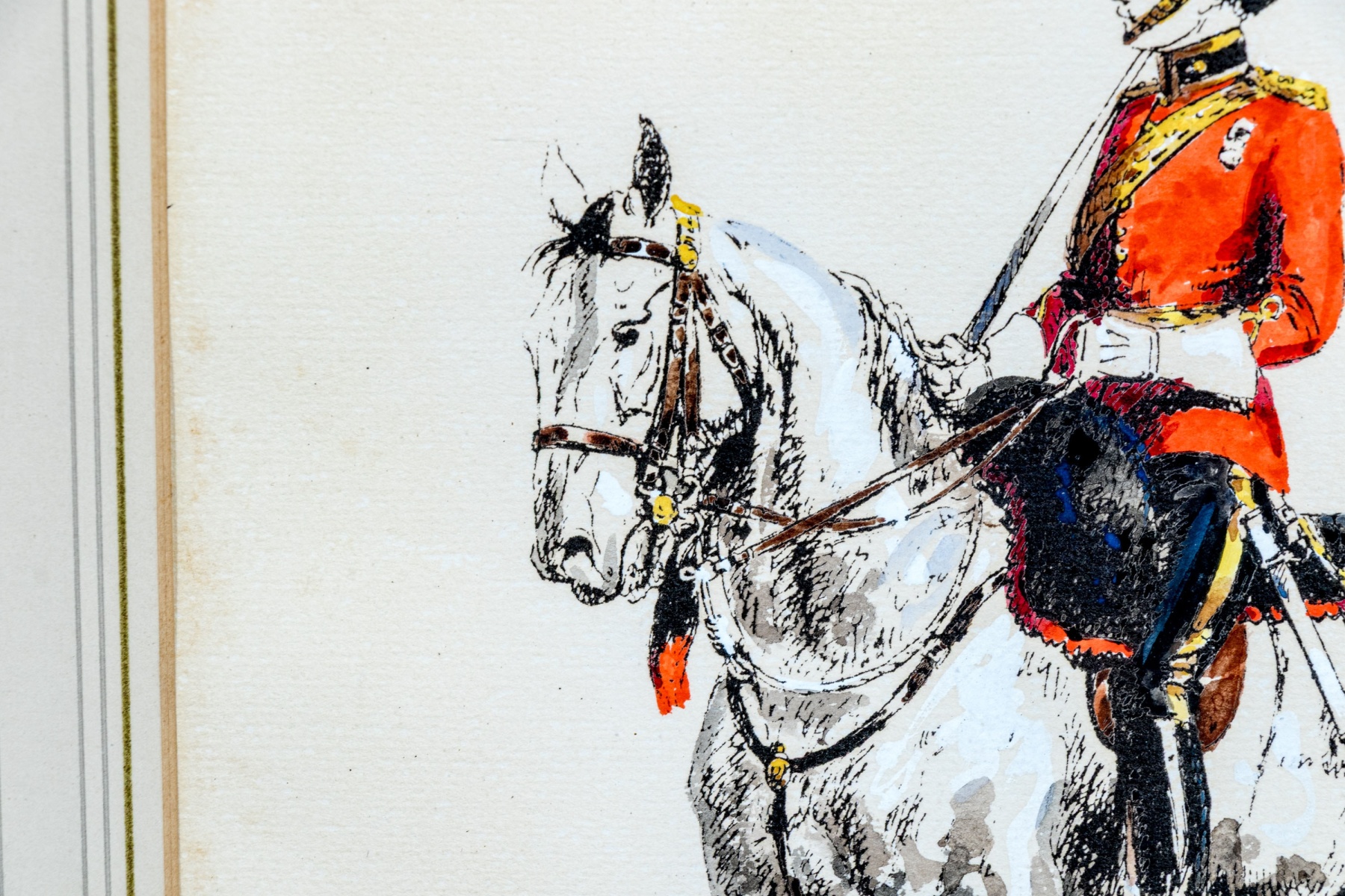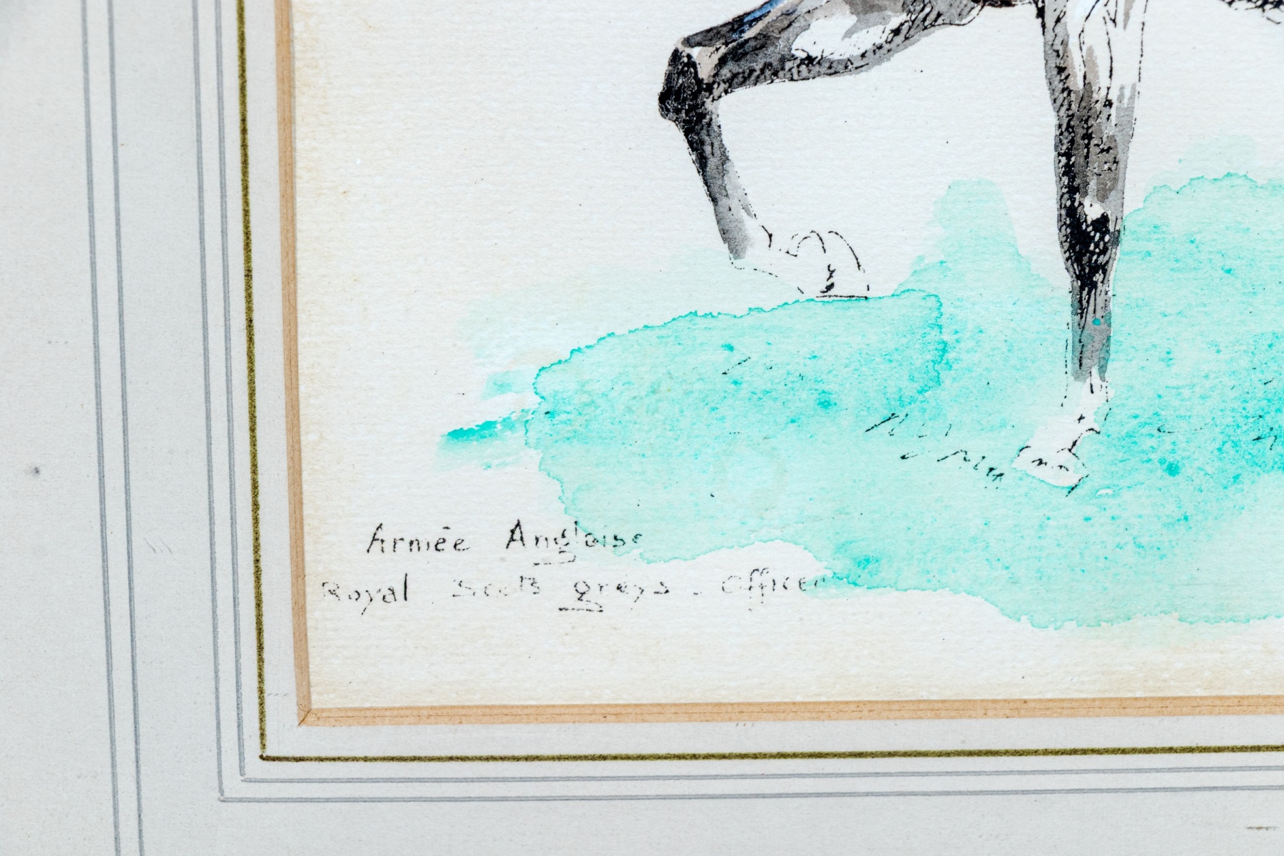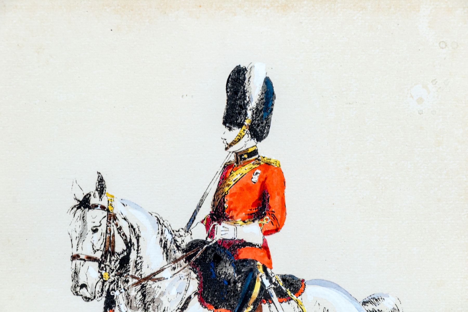 Eugene Pechaubes (French, 1890-1967) "Armèe Anglaise Royal Scots Greys Officer" hand colored etching on paper depicting a Royal Scots Greys officer in red uniform riding on a white horse over a teal blue ground. Signed in plate lower right and titled lower left.