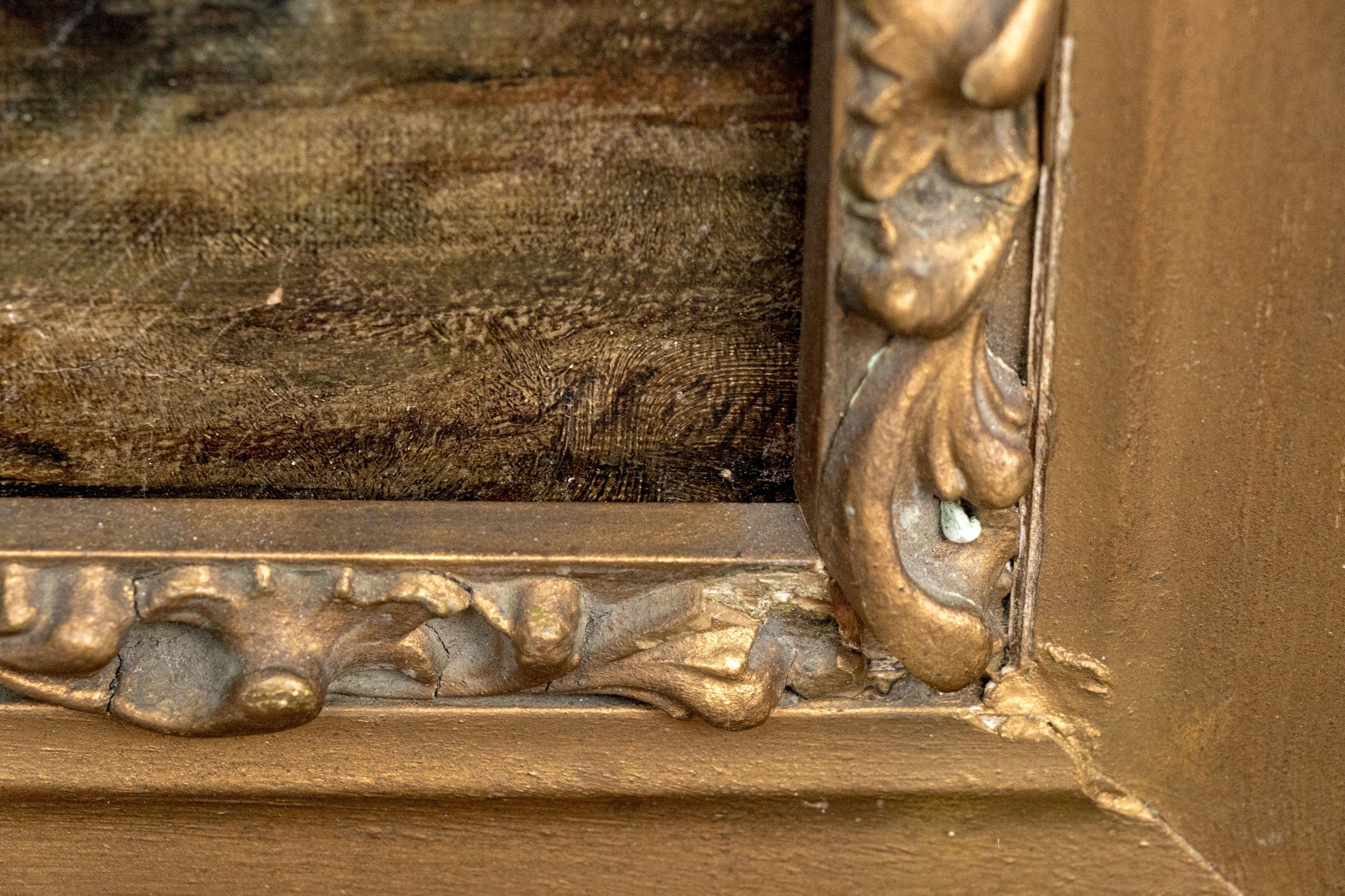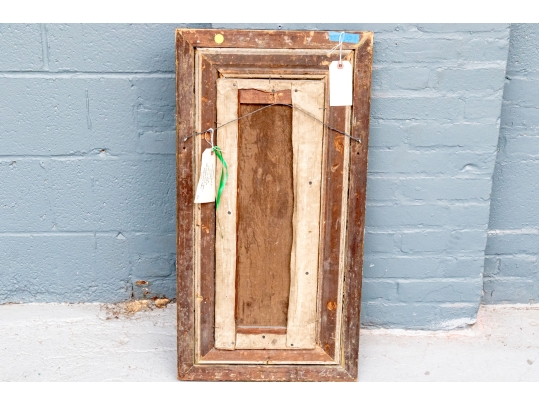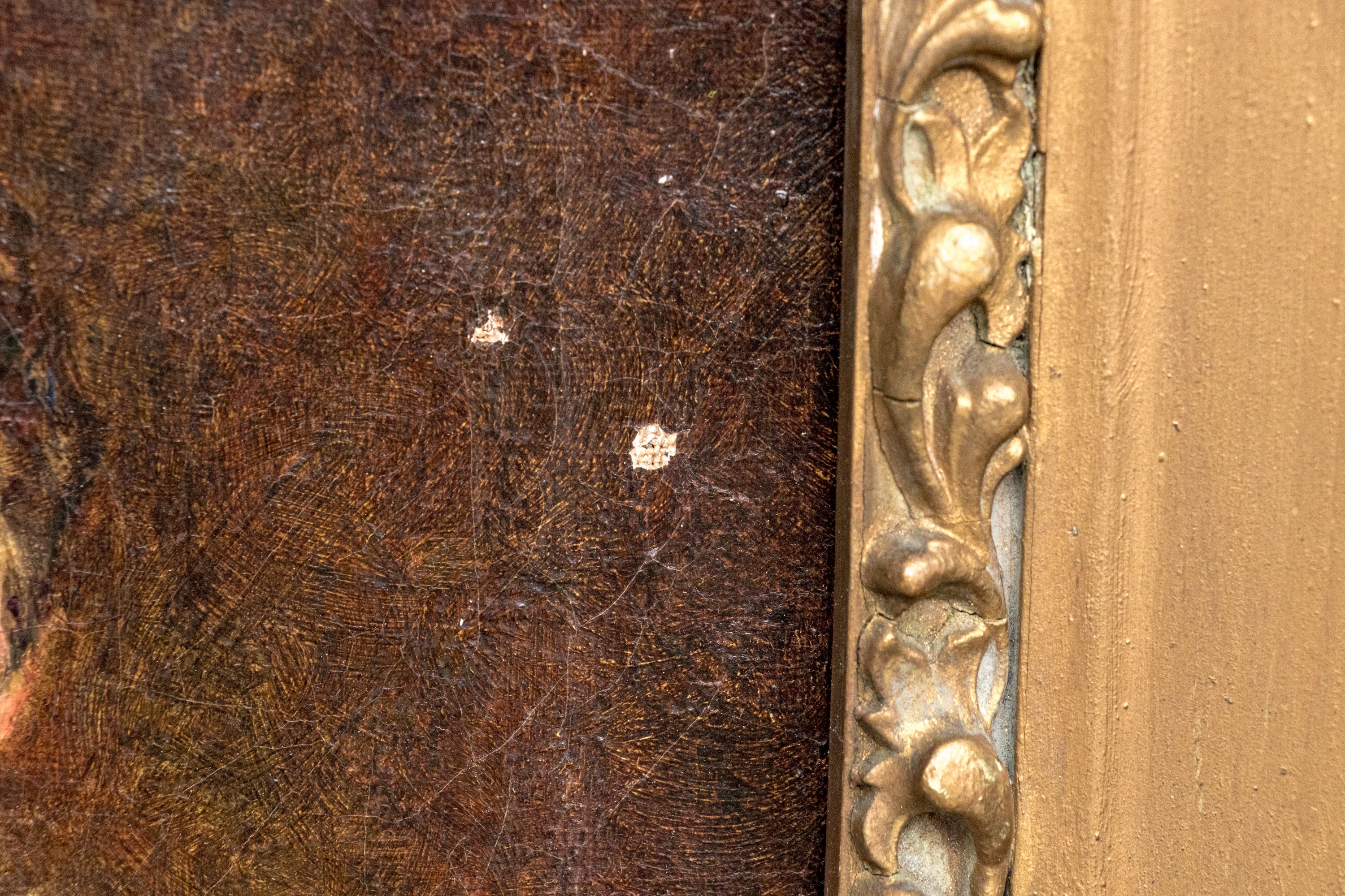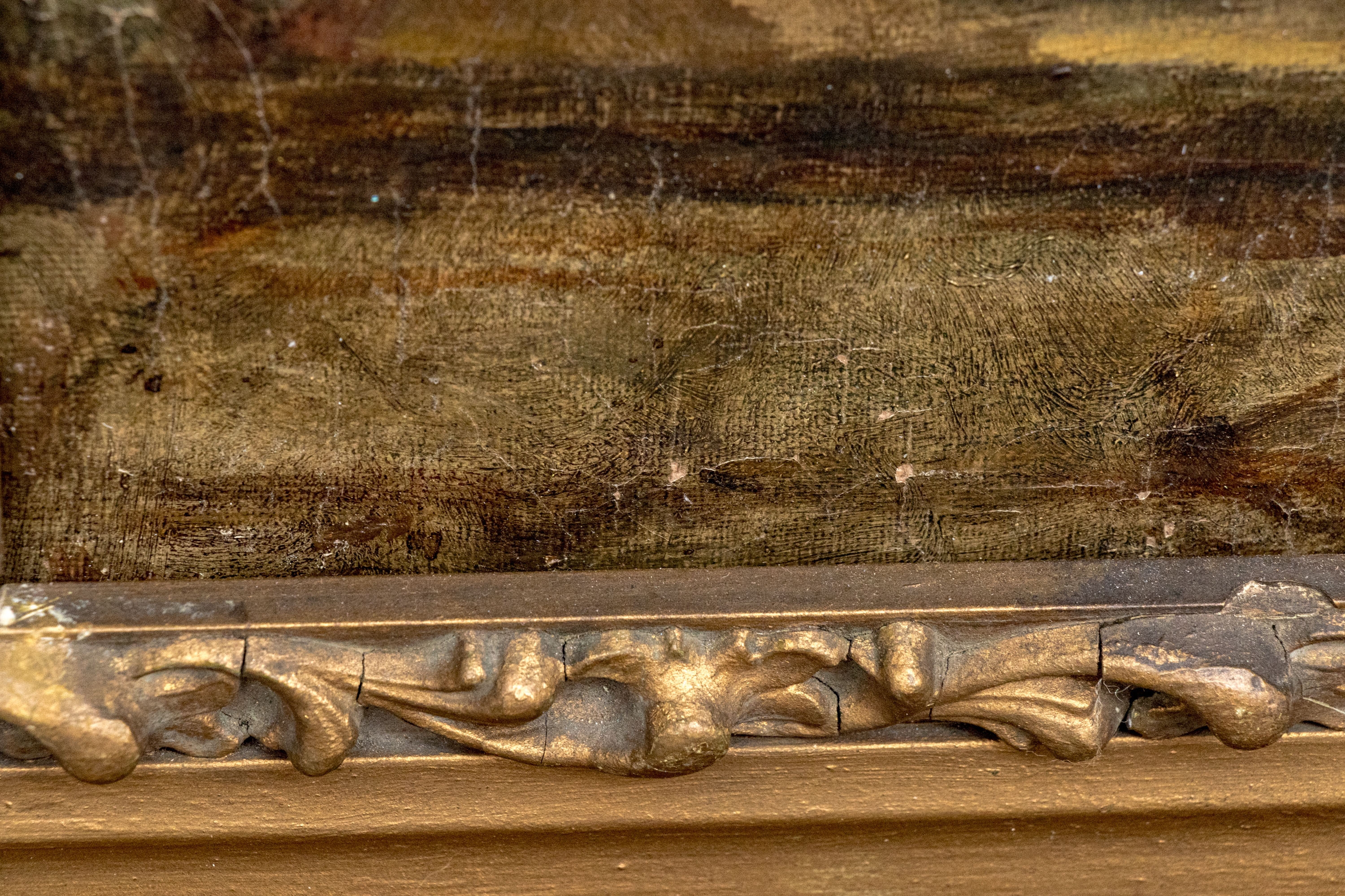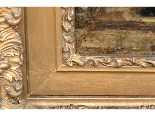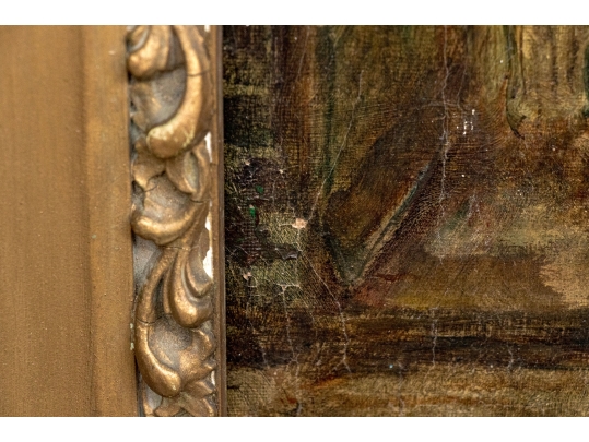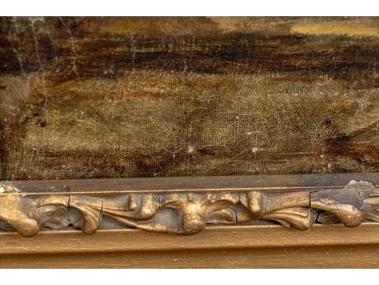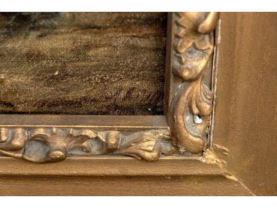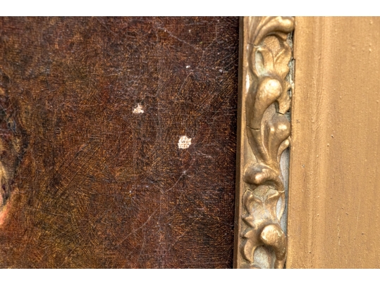 Condition: Please review the detail photos. There is stable cracquelure and spot losses upper right and upper center, with several gilt and wood losses to the frame however the presentation remains very fine.