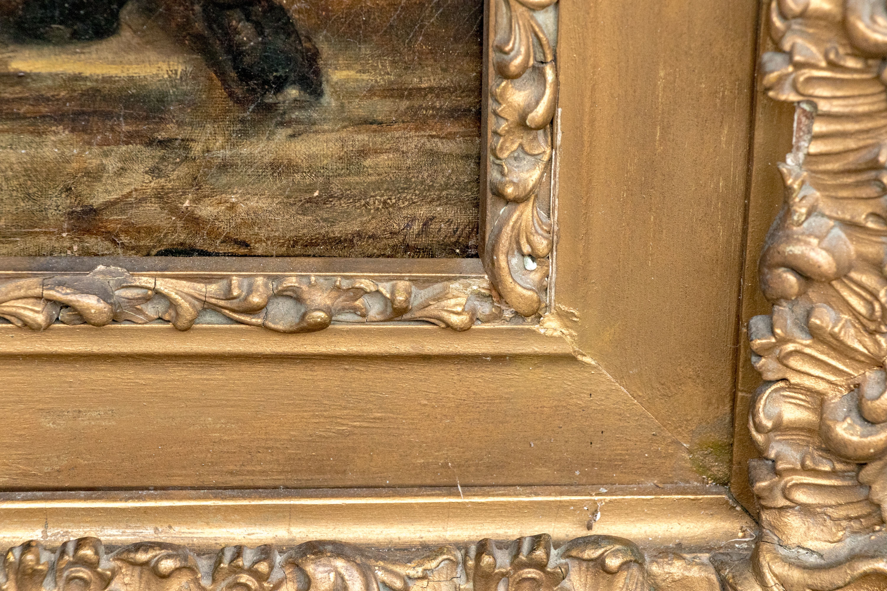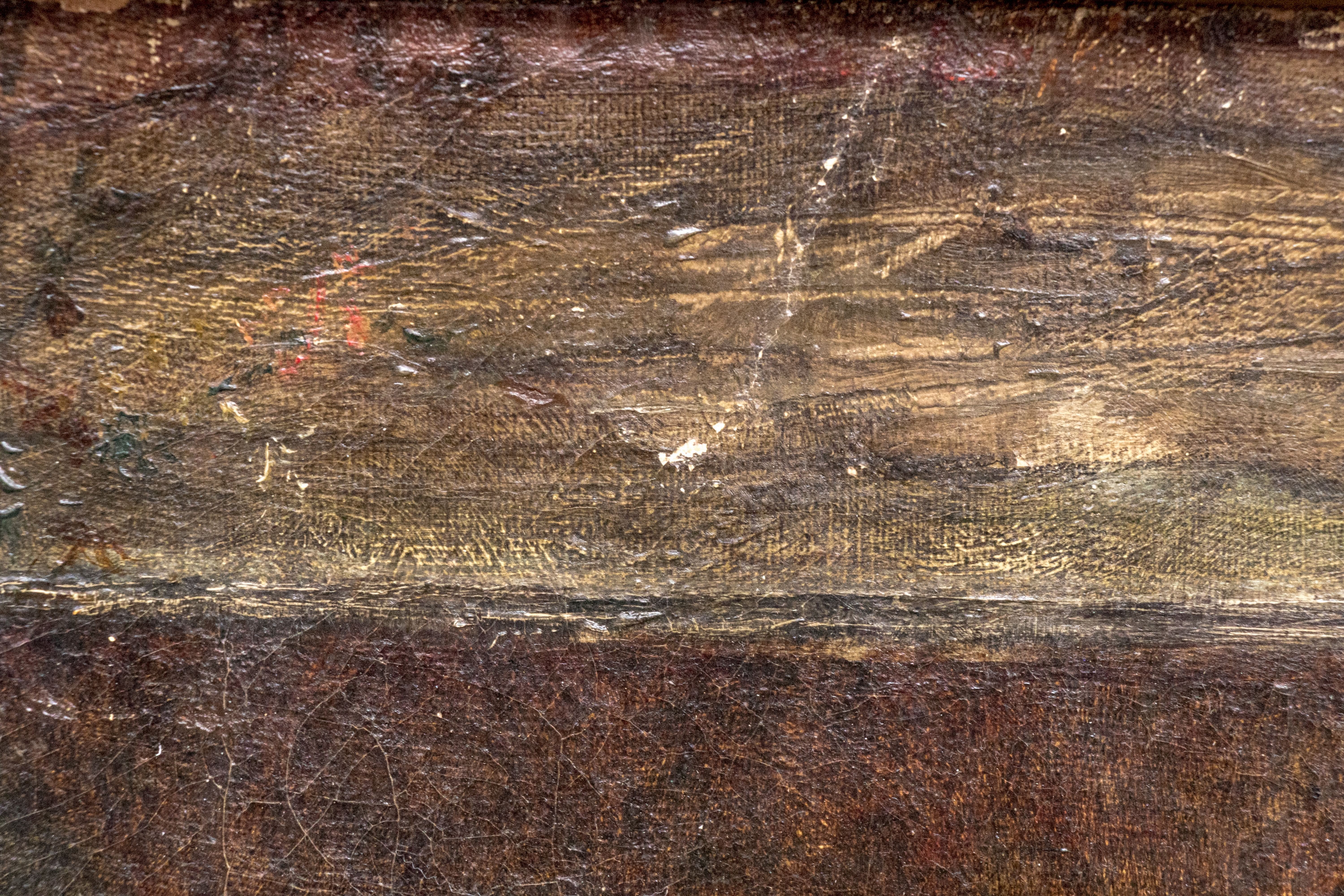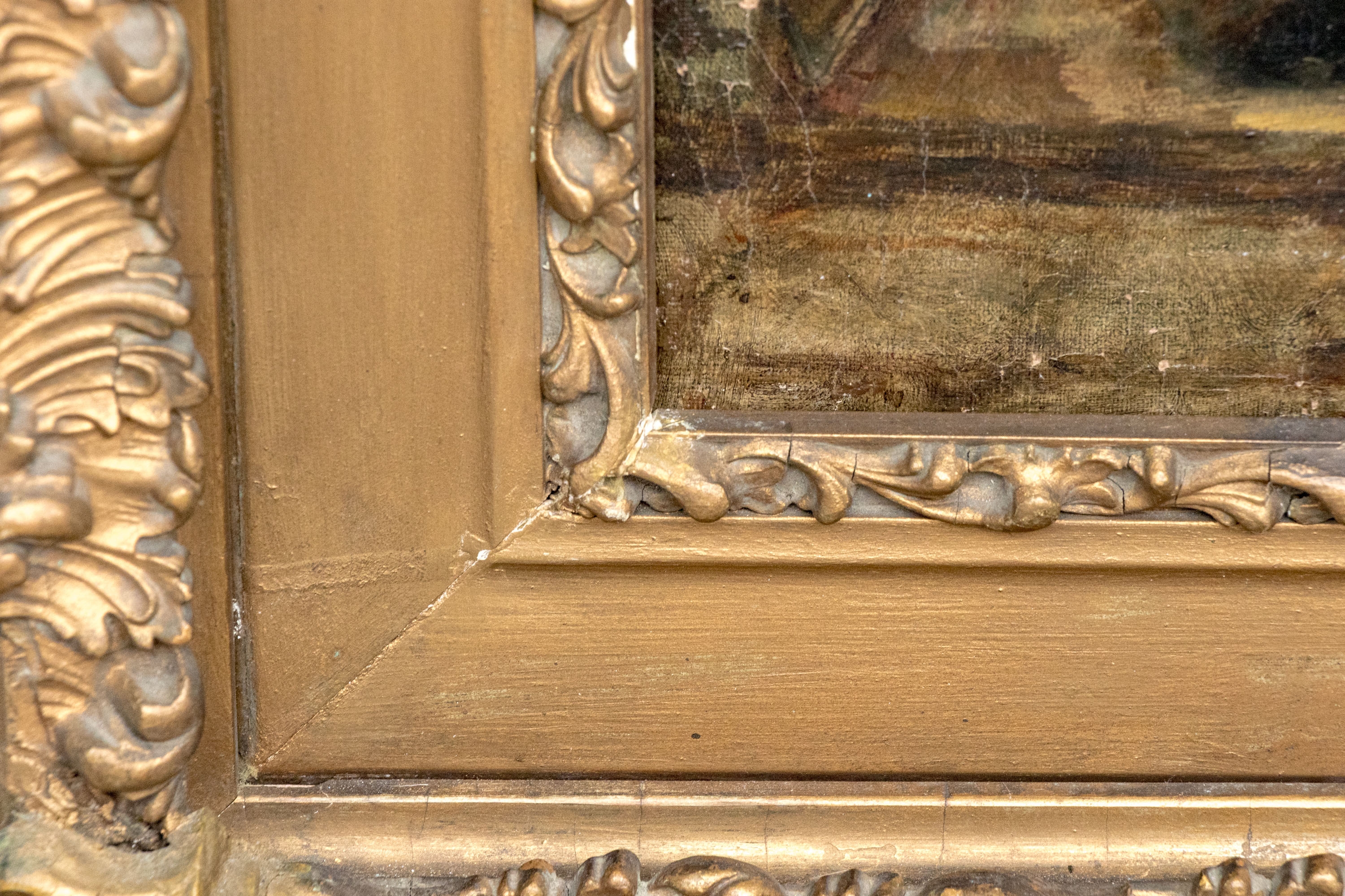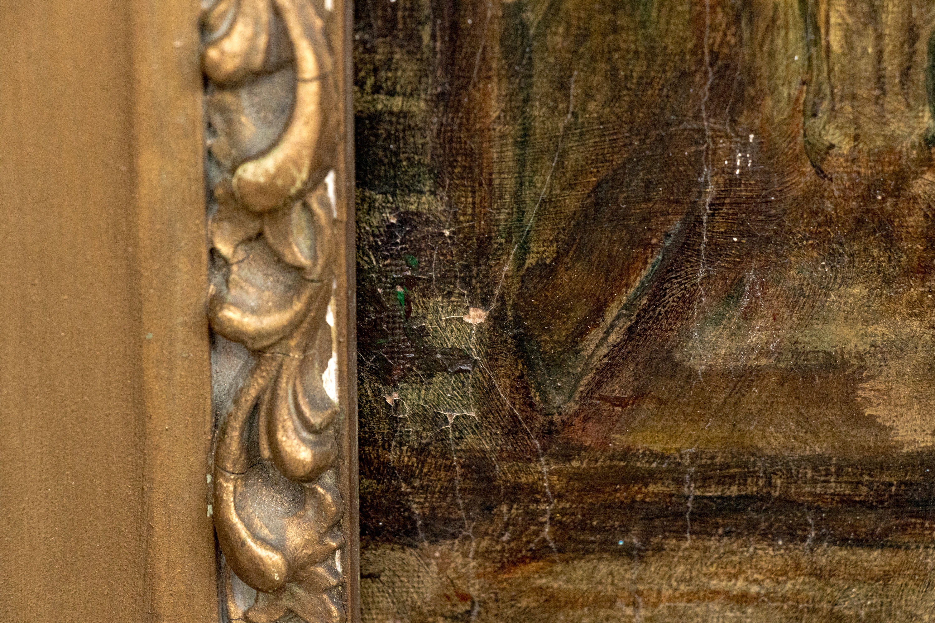 Condition: Please review the detail photos. There is stable cracquelure and spot losses upper right and upper center, with several gilt and wood losses to the frame however the presentation remains very fine.