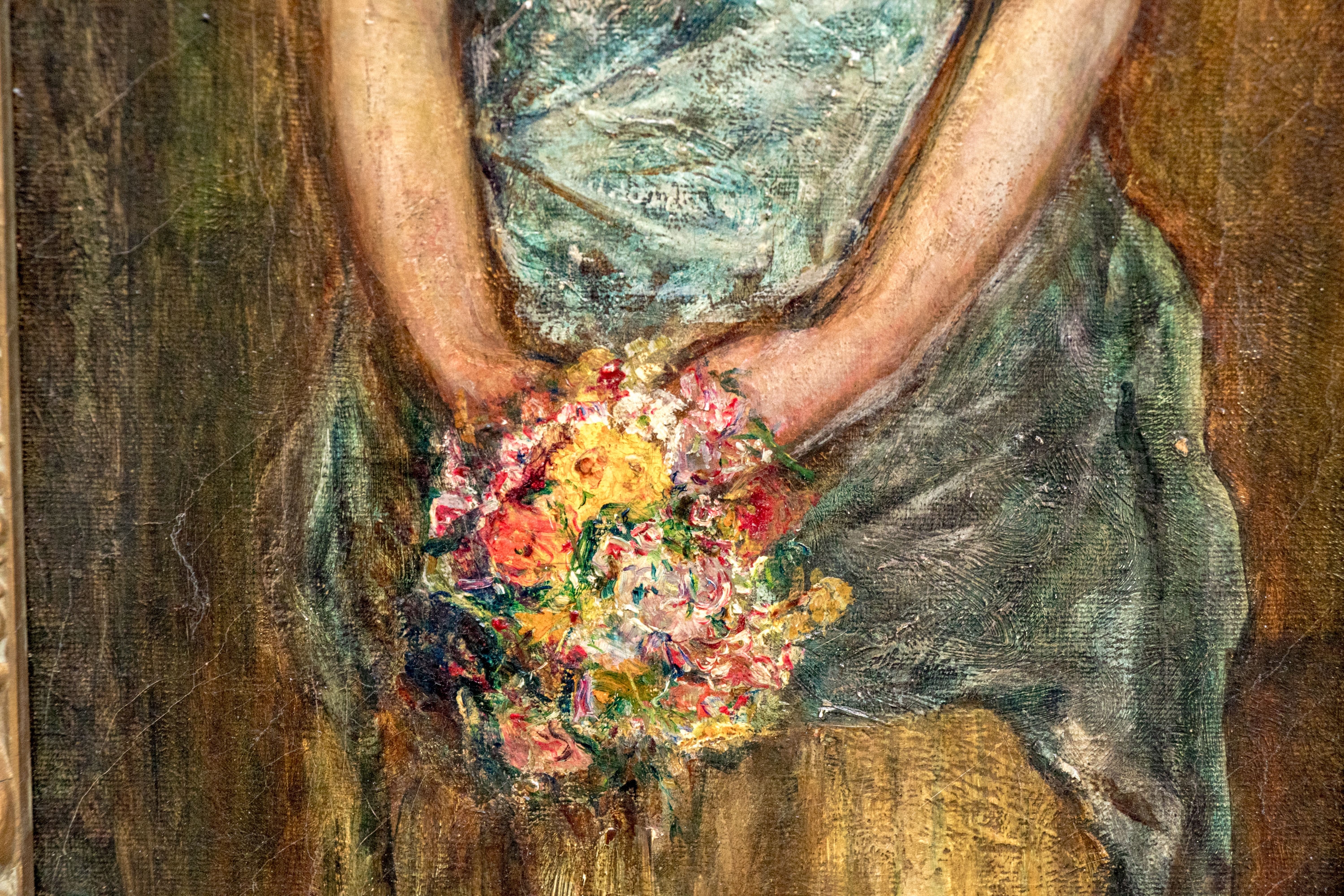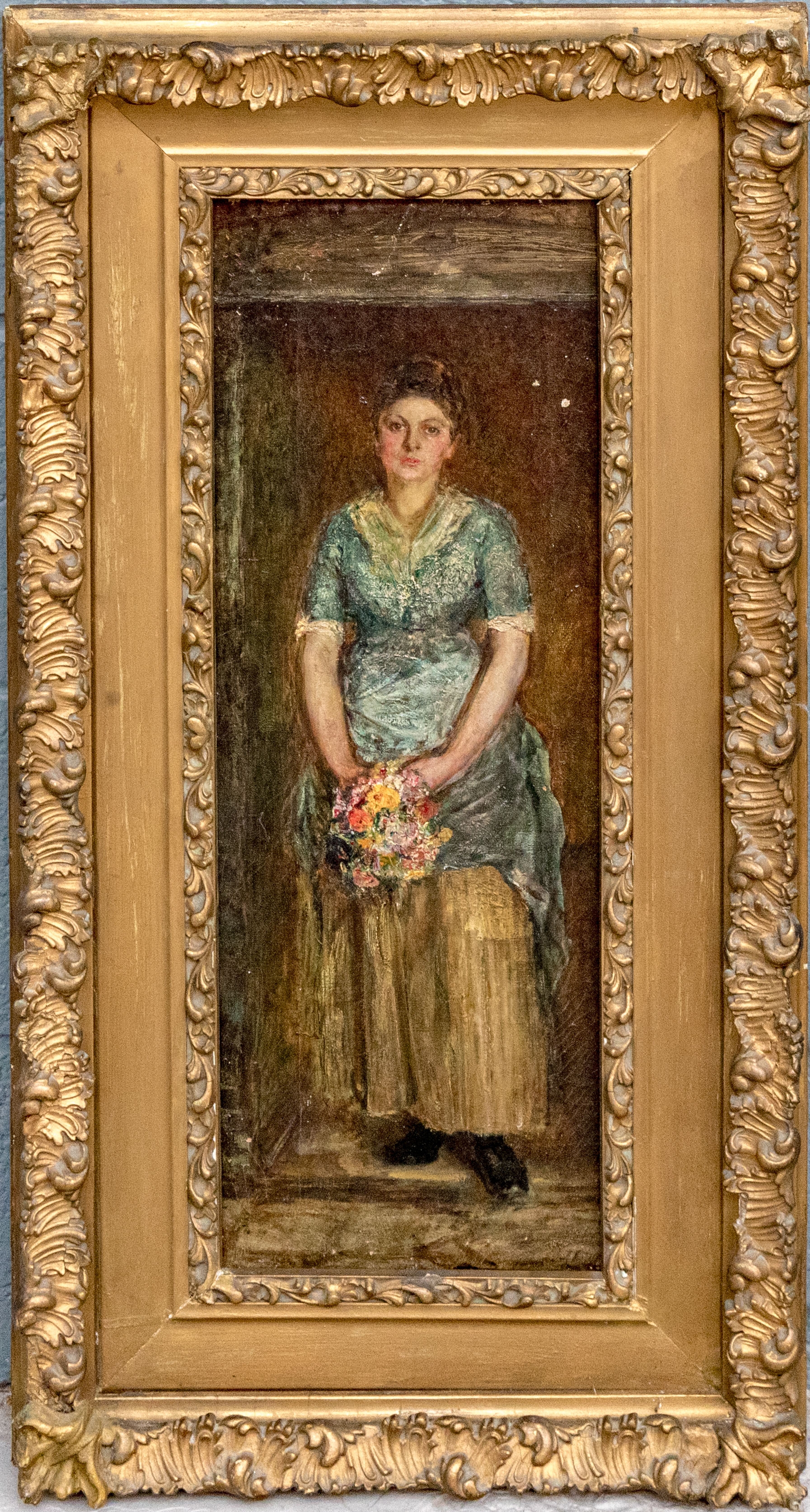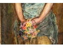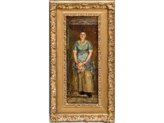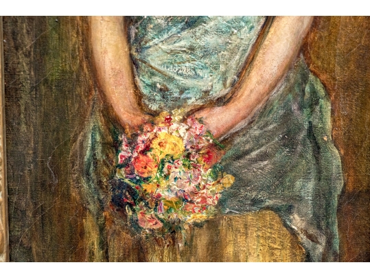 Possibly signed lower right corner. Illegible. A lovely portrait of a brunette in a blue laced trimmed dress with yellow skirt and a matching blue shawl wrapped around her waist. She stands demurely in a dark doorway holding a lovely bouquet of flowers. Presented in a fine period carved and gilt two part wood frame.