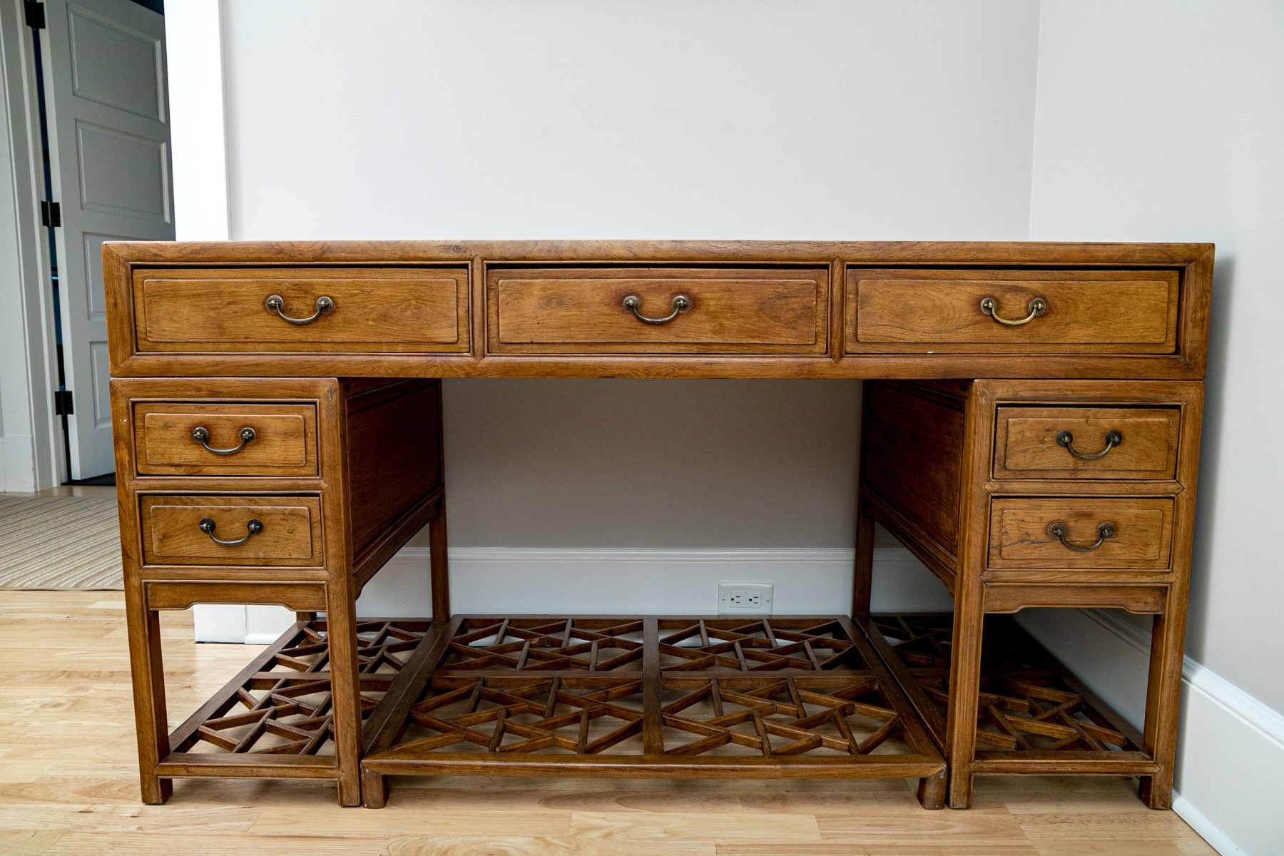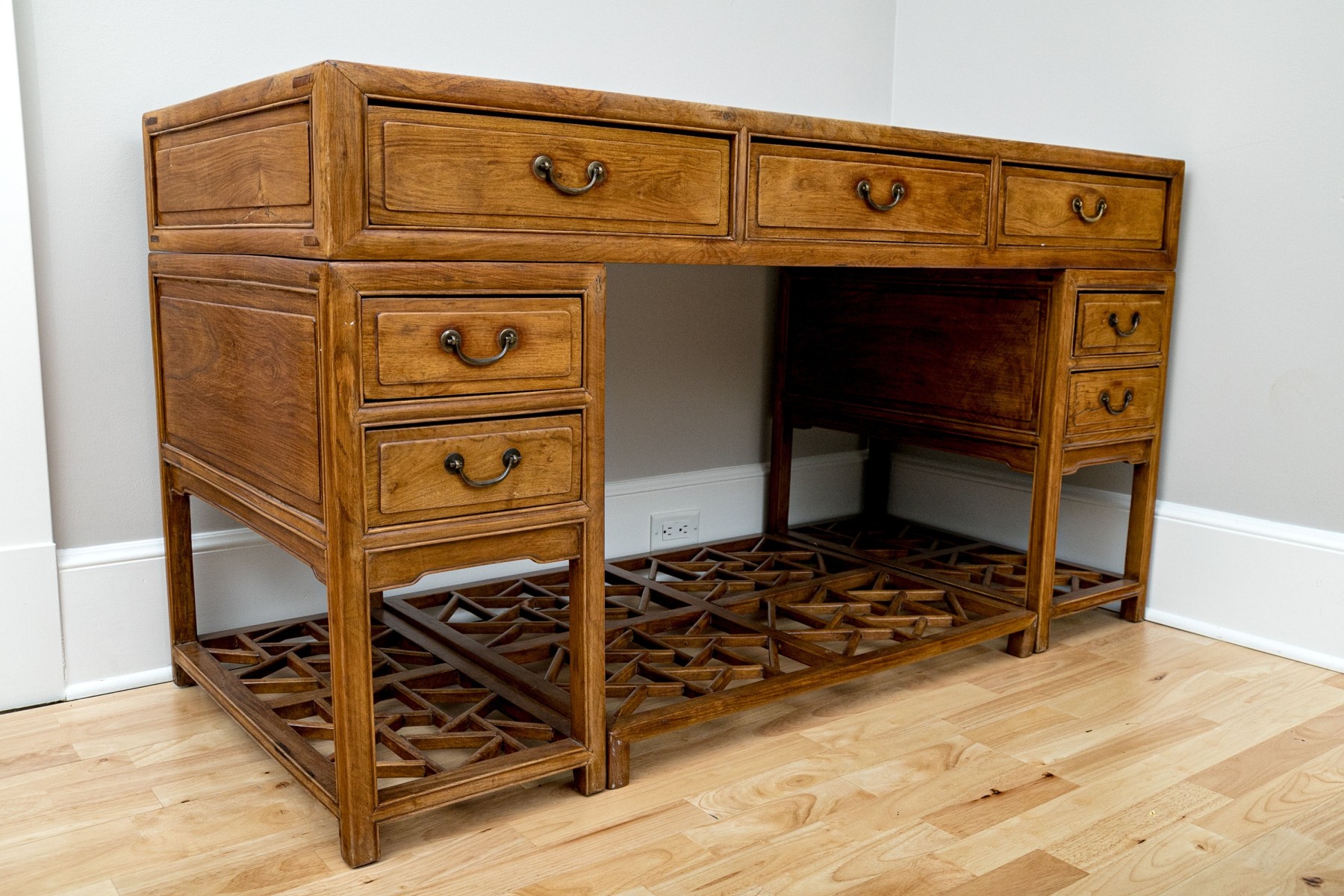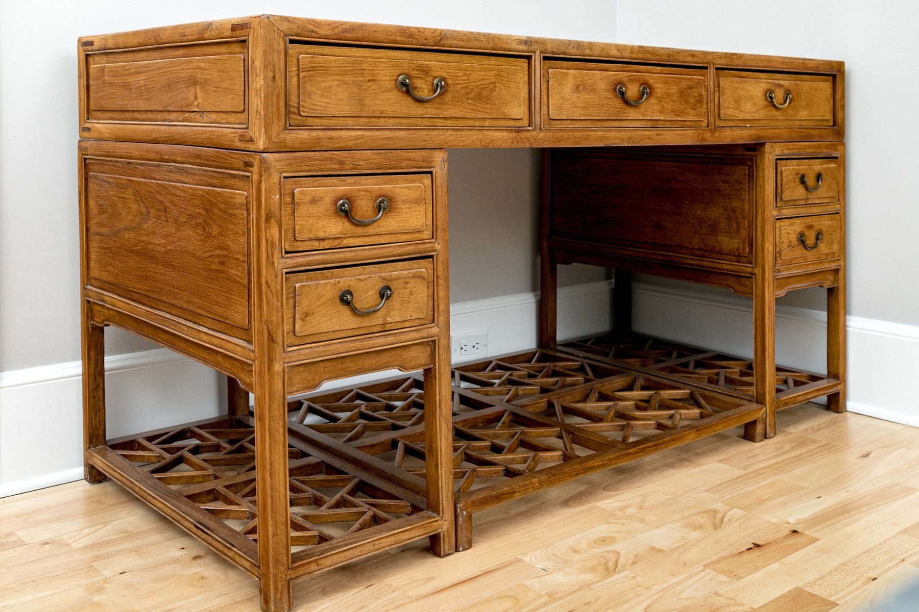 An excellent 19th century Chinese pedestal desk in honeyed brown elm, showcasing a paneled top with a banded border leading to three upper drawers with simple brass handles. Each pedestal showcases two smaller drawers, raised over straight legs surrounding geometric openwork lower shelves in a cracked ice pattern that matches a central panel.