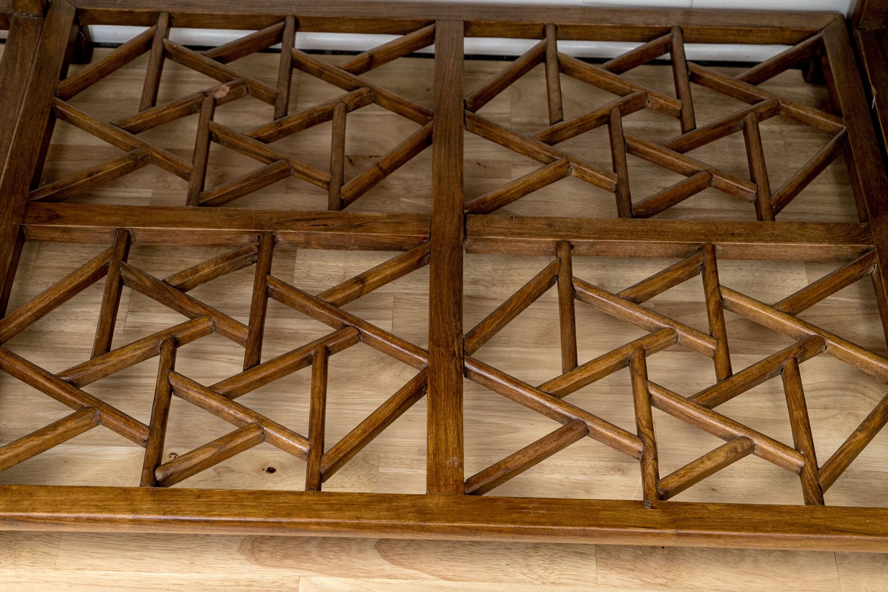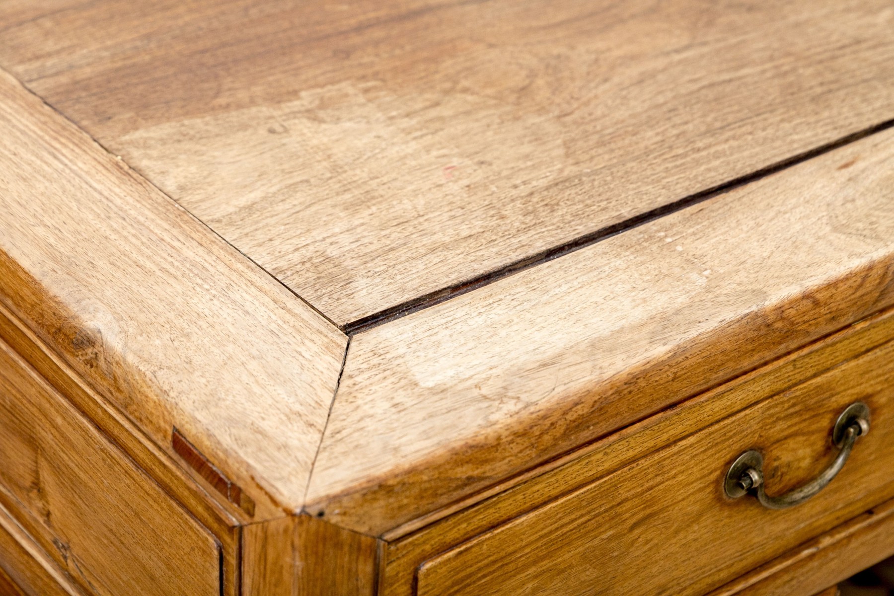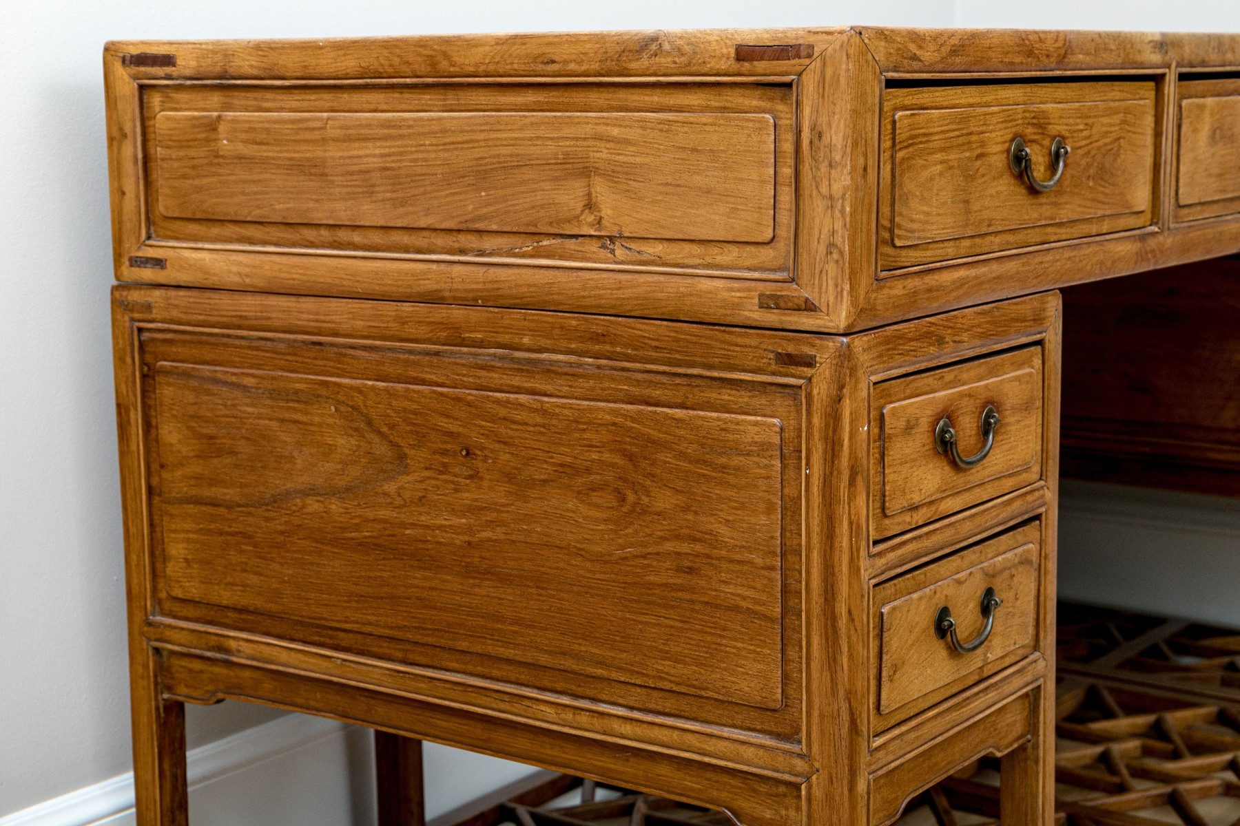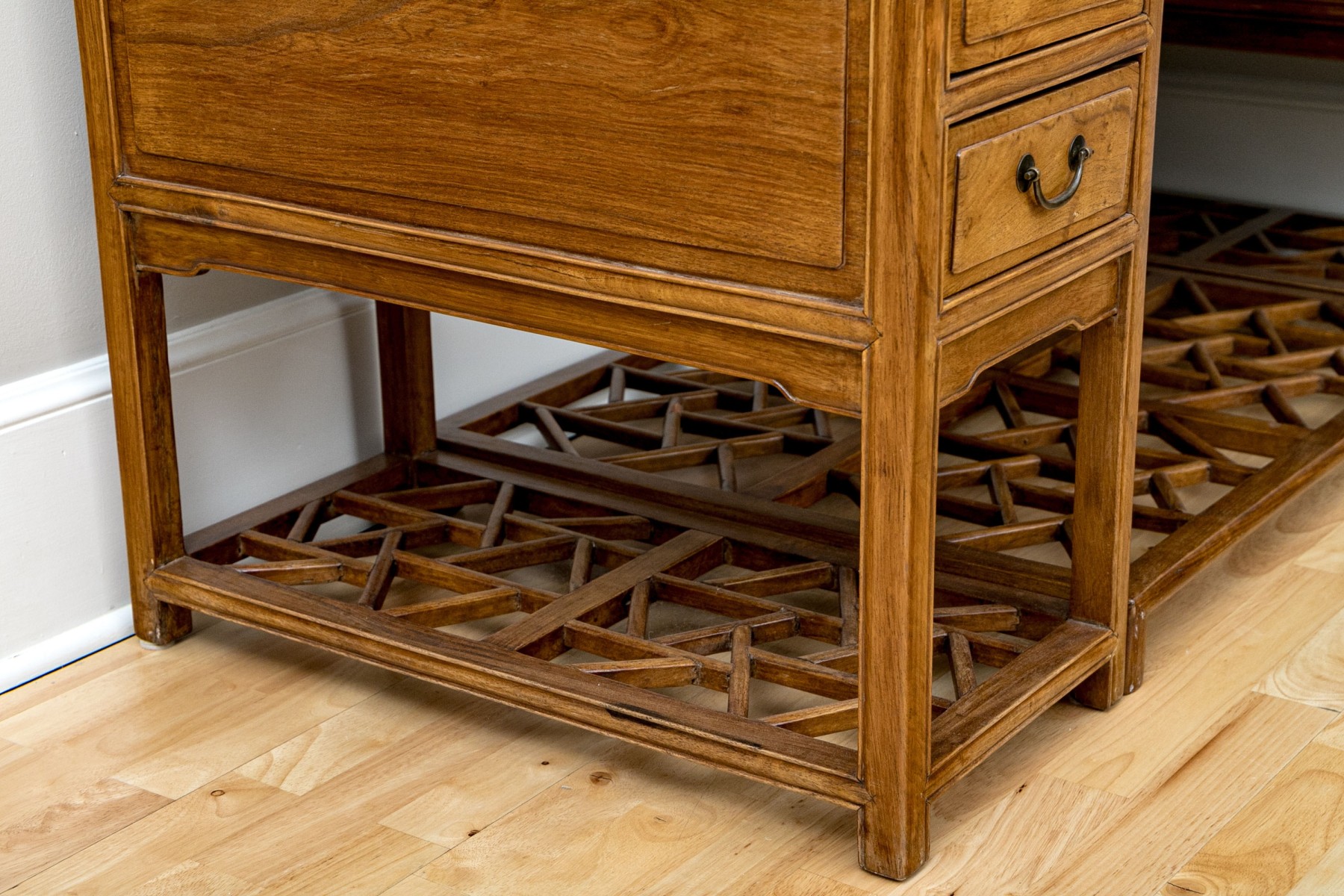 An excellent 19th century Chinese pedestal desk in honeyed brown elm, showcasing a paneled top with a banded border leading to three upper drawers with simple brass handles. Each pedestal showcases two smaller drawers, raised over straight legs surrounding geometric openwork lower shelves in a cracked ice pattern that matches a central panel.