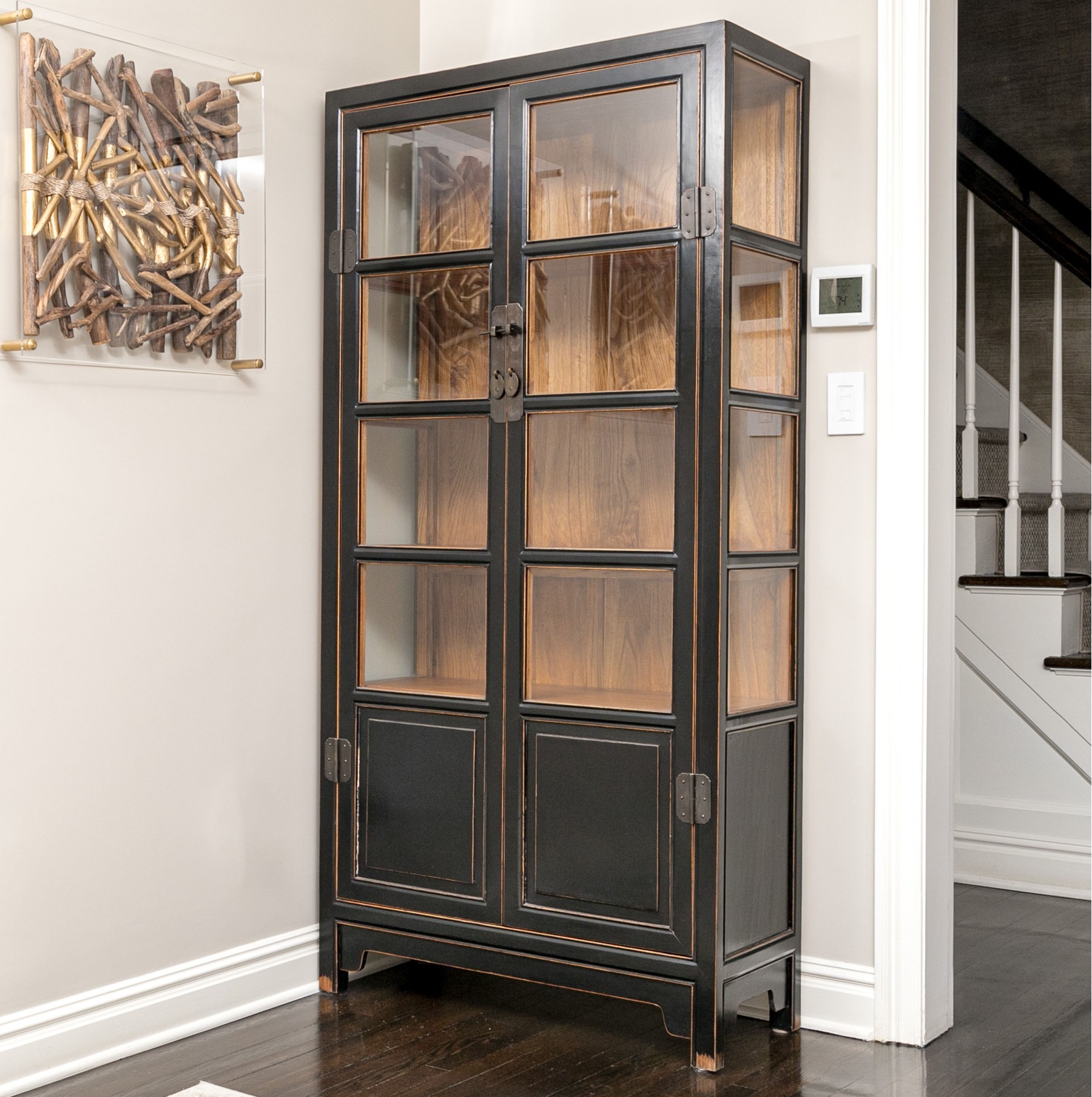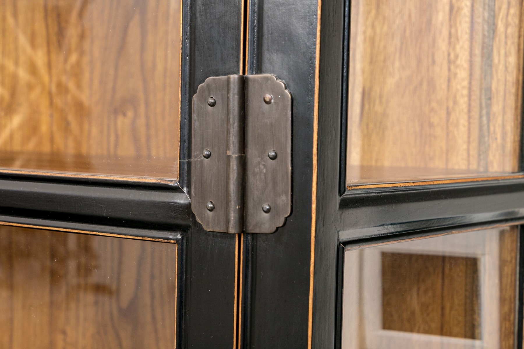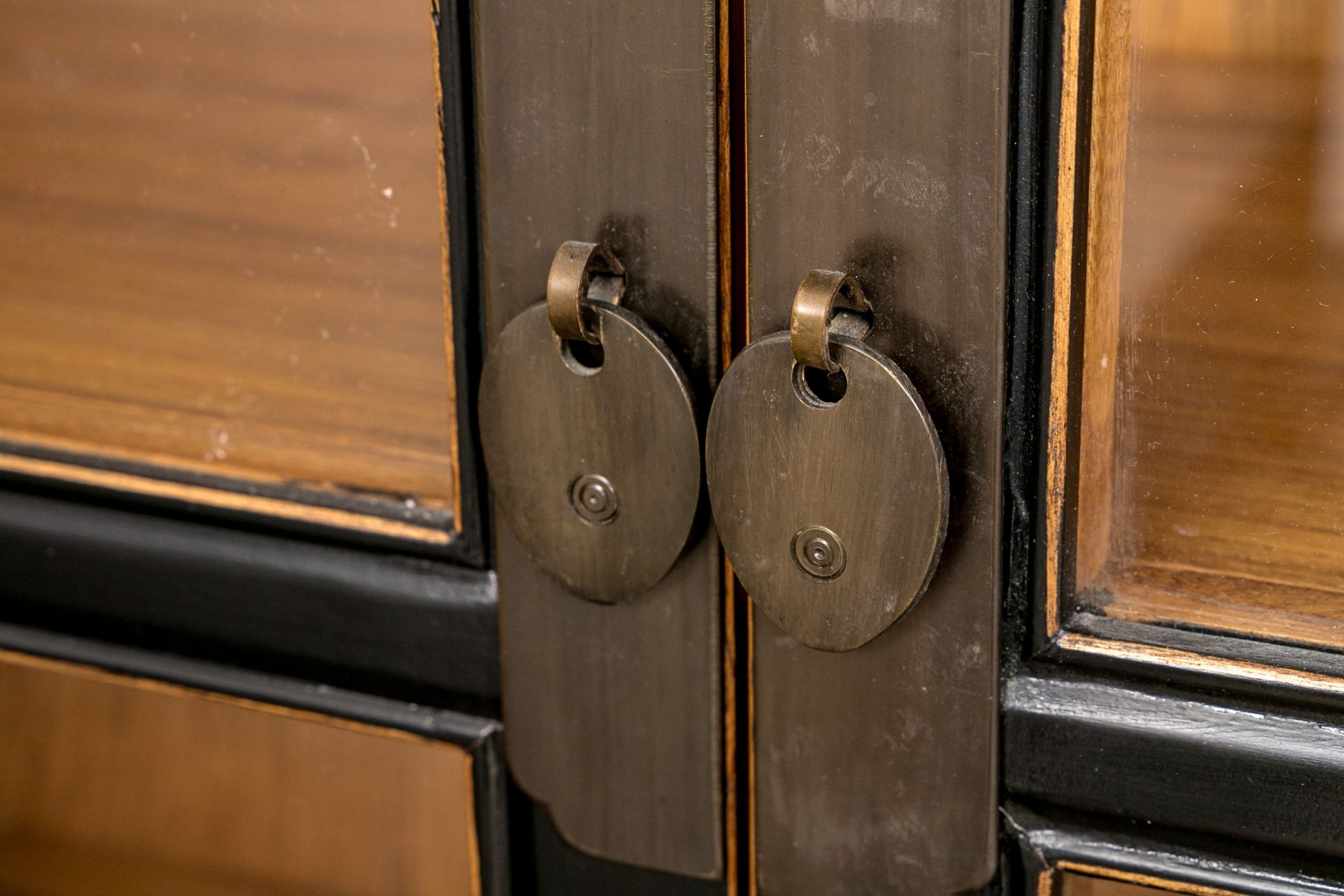 An excellent Chinoiserie curio cabinet painted satin black, featuring glass paned double doors opening to a natural honeyed brown wood interior with four removable shelves over two lower drawers. Scalloped edges along gray metal hinges add a decorative flare that compliments the oval tab handles and pin latch closure. The lower body sports beveled panels and simply detailed brackets along the apron, raised on rectangular legs.
