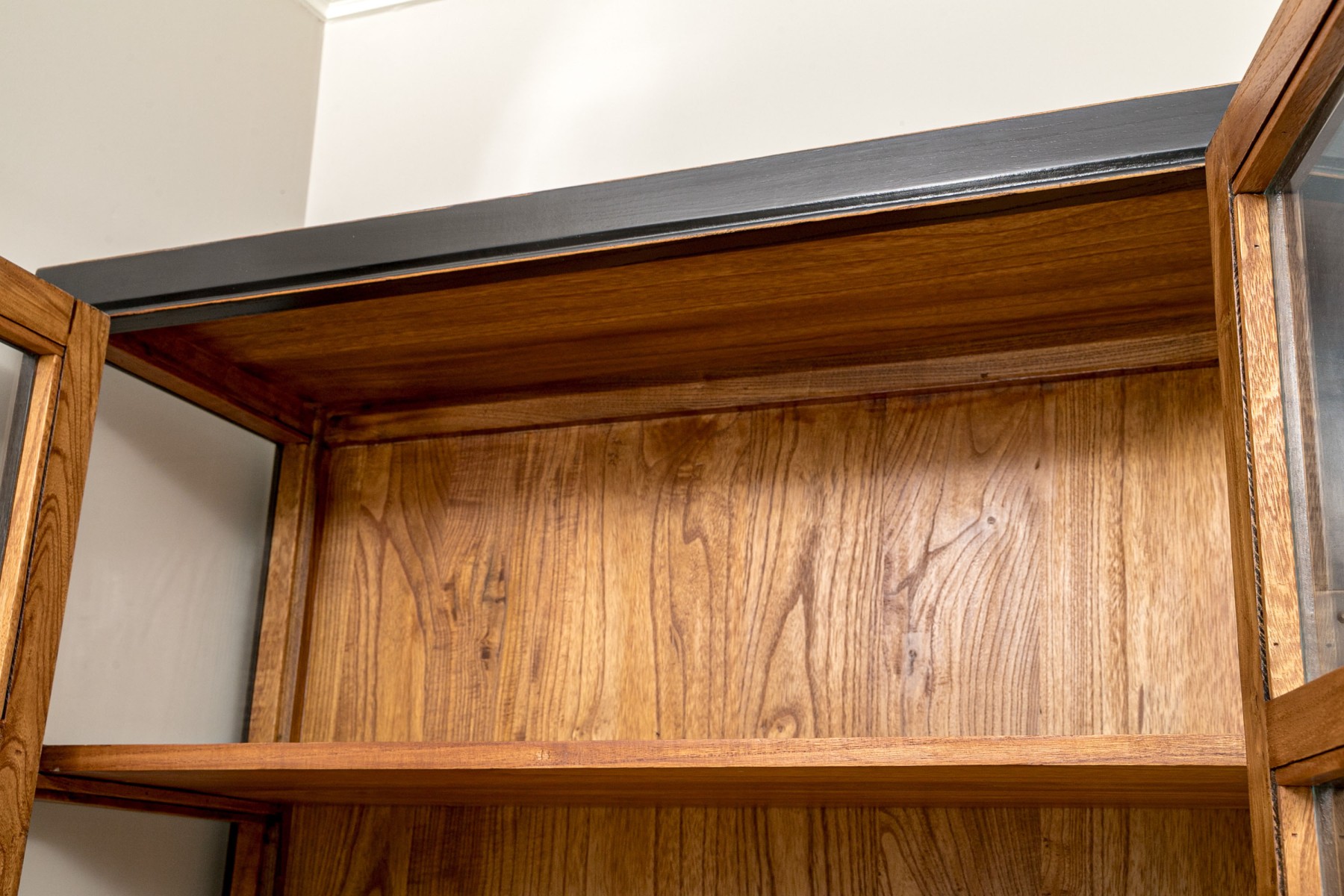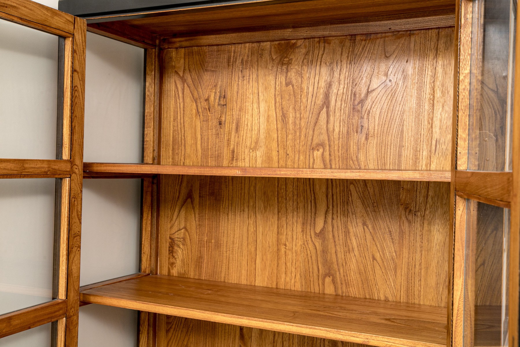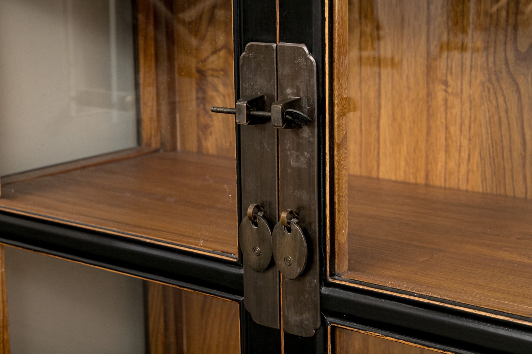 An excellent Chinoiserie curio cabinet painted satin black, featuring glass paned double doors opening to a natural honeyed brown wood interior with four removable shelves over two lower drawers. Scalloped edges along gray metal hinges add a decorative flare that compliments the oval tab handles and pin latch closure. The lower body sports beveled panels and simply detailed brackets along the apron, raised on rectangular legs.