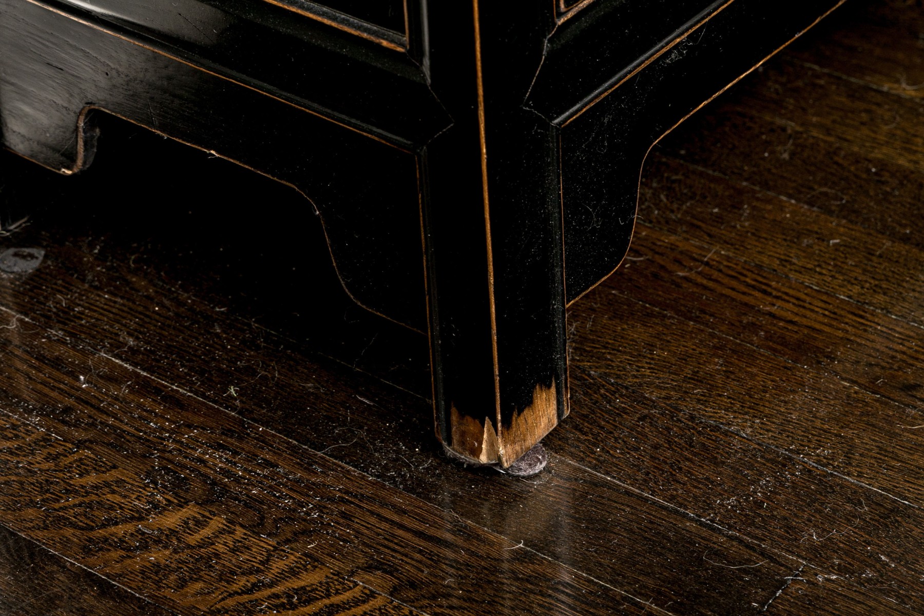 Front left leg has damage but remains sturdy. Finish wear around the legs. Please review the pictures as they are a part of the condition report.