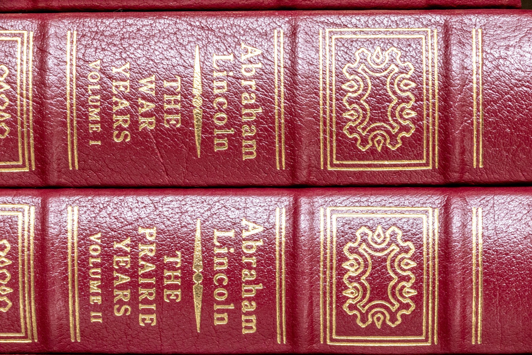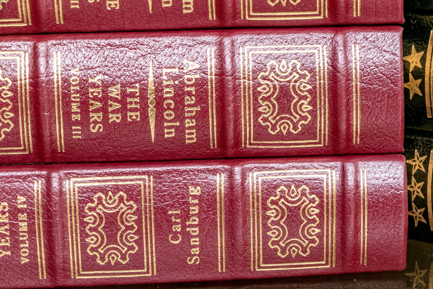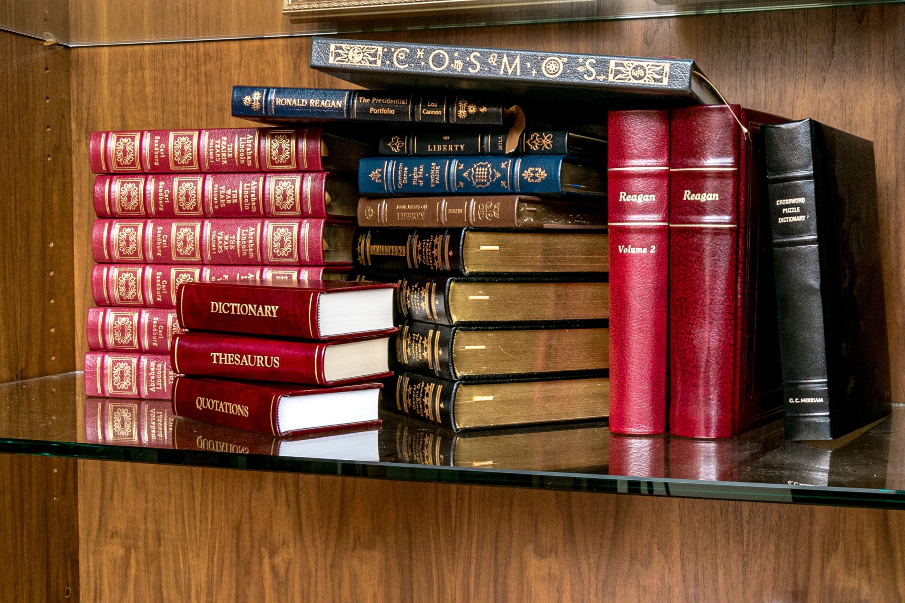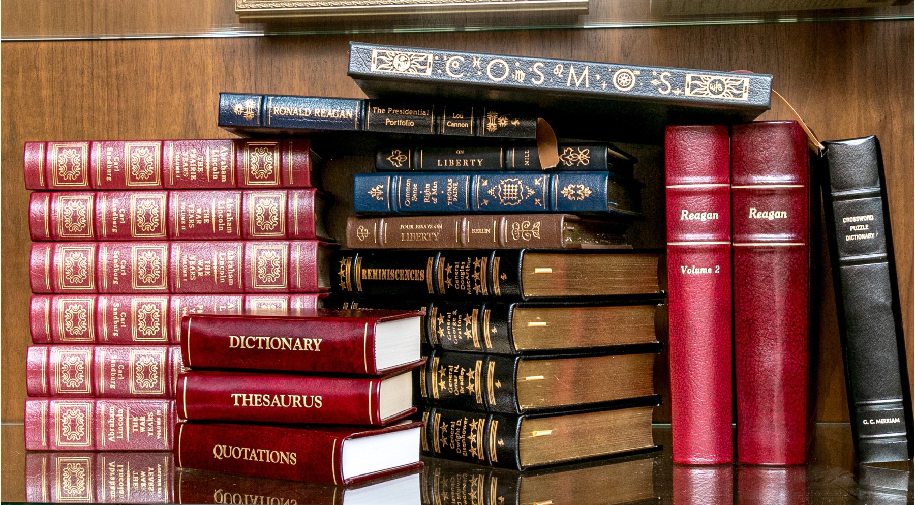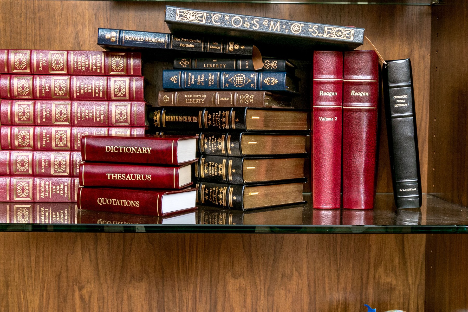 An excellent lot of leatherette/leather hardcover books. Includes Abraham Lincoln by Carl Sandburg, Ronald Reagan by Lou Cannon, Dictionaries, Cosmos, and books by Generals.