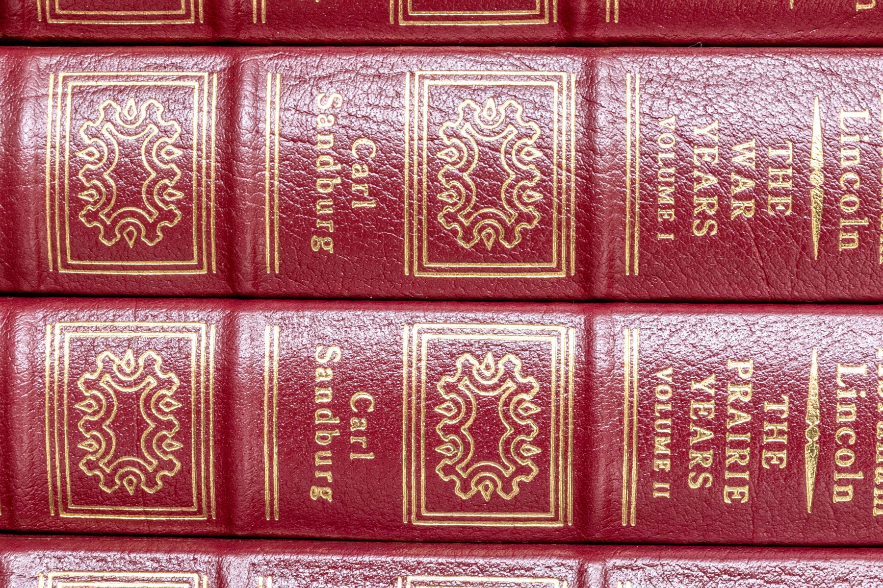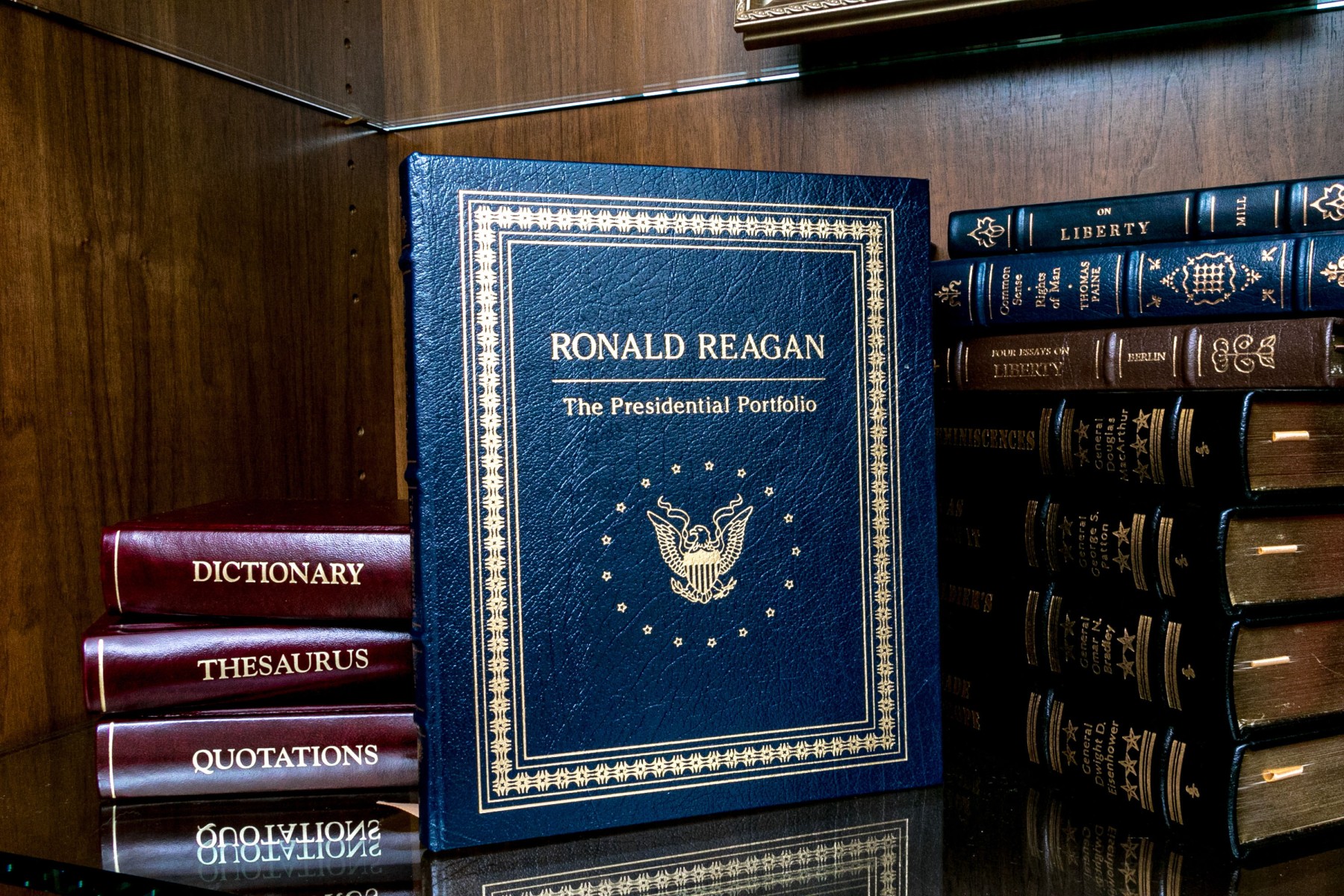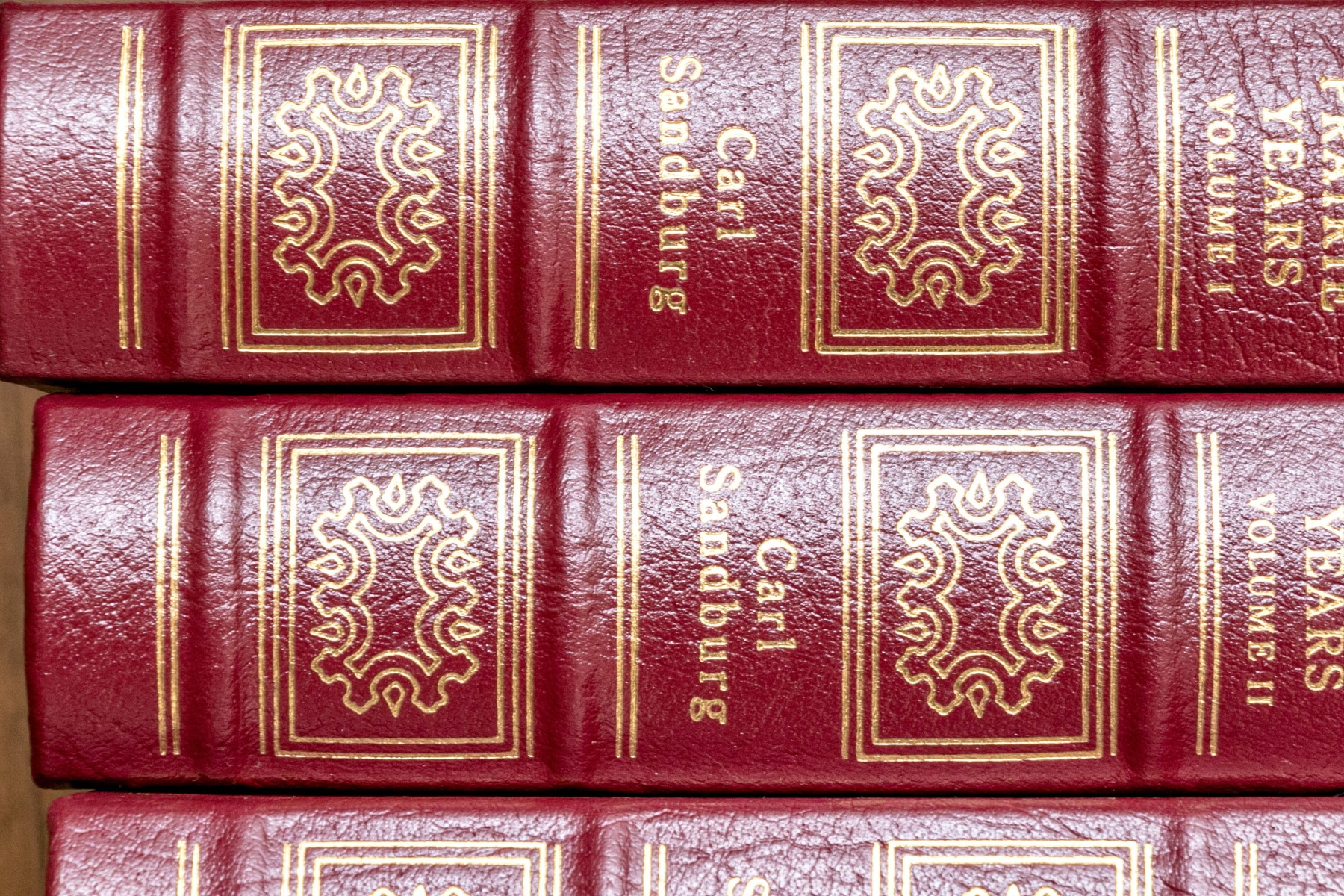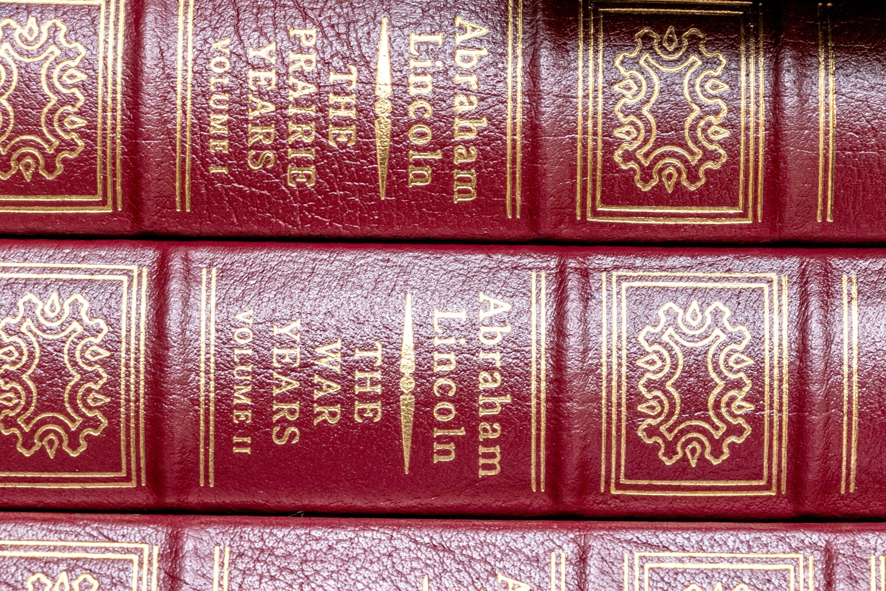 An excellent lot of leatherette/leather hardcover books. Includes Abraham Lincoln by Carl Sandburg, Ronald Reagan by Lou Cannon, Dictionaries, Cosmos, and books by Generals.