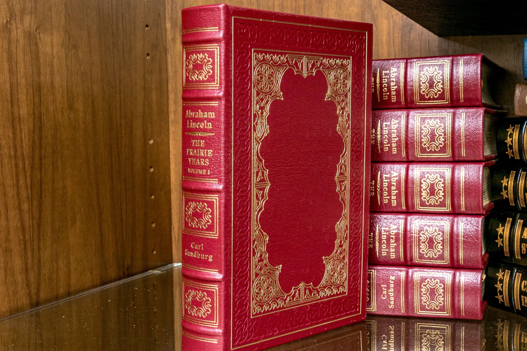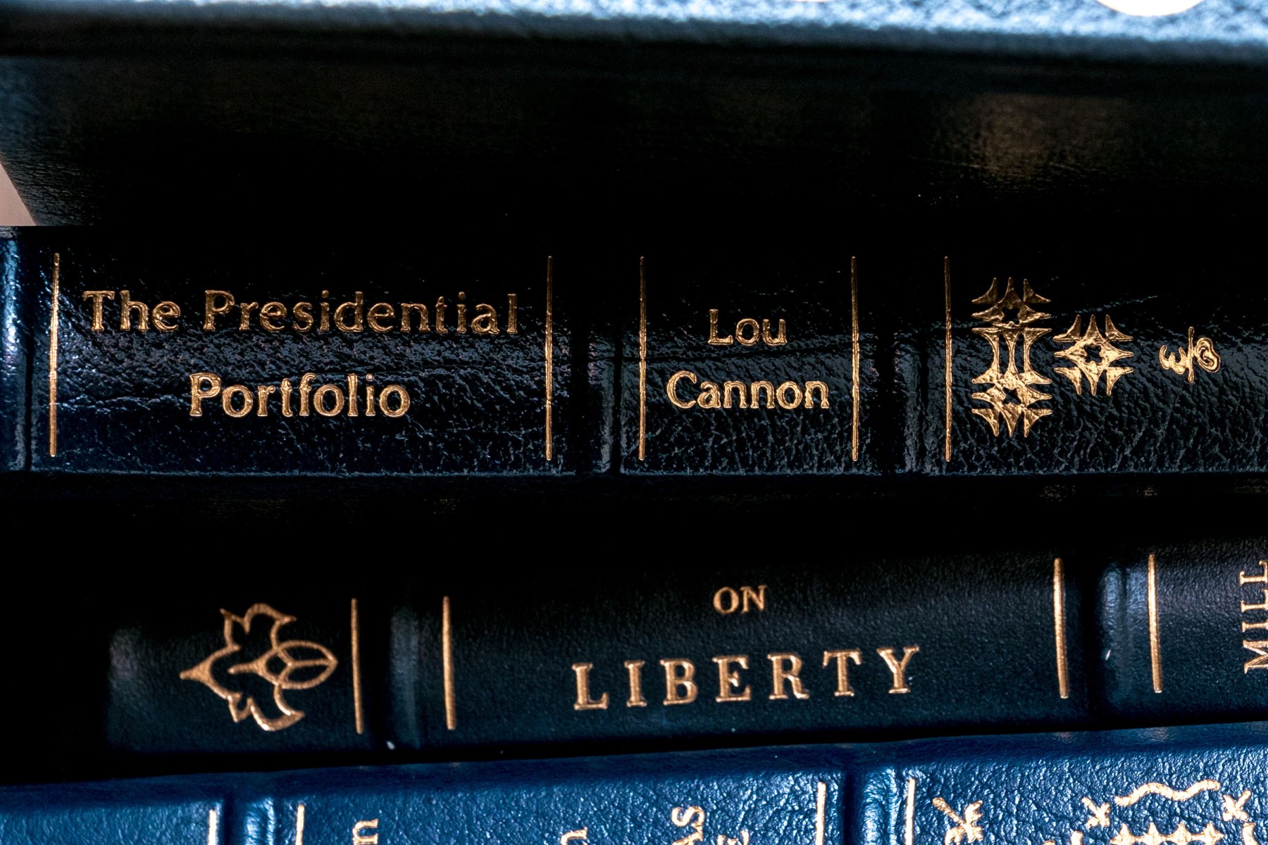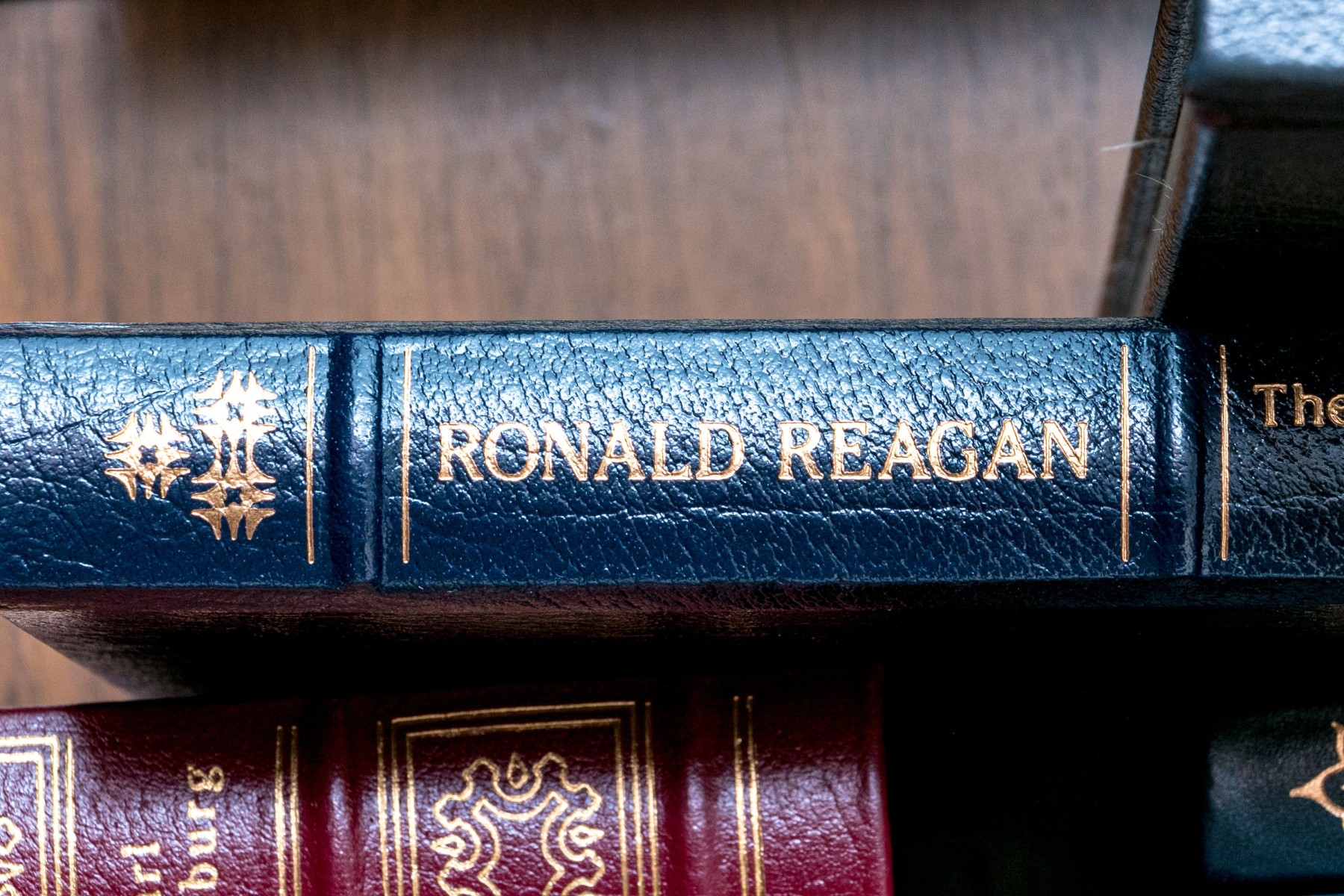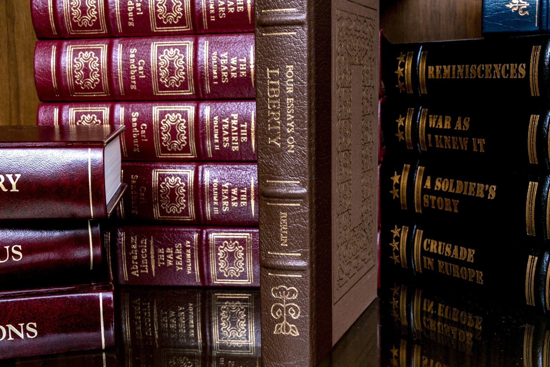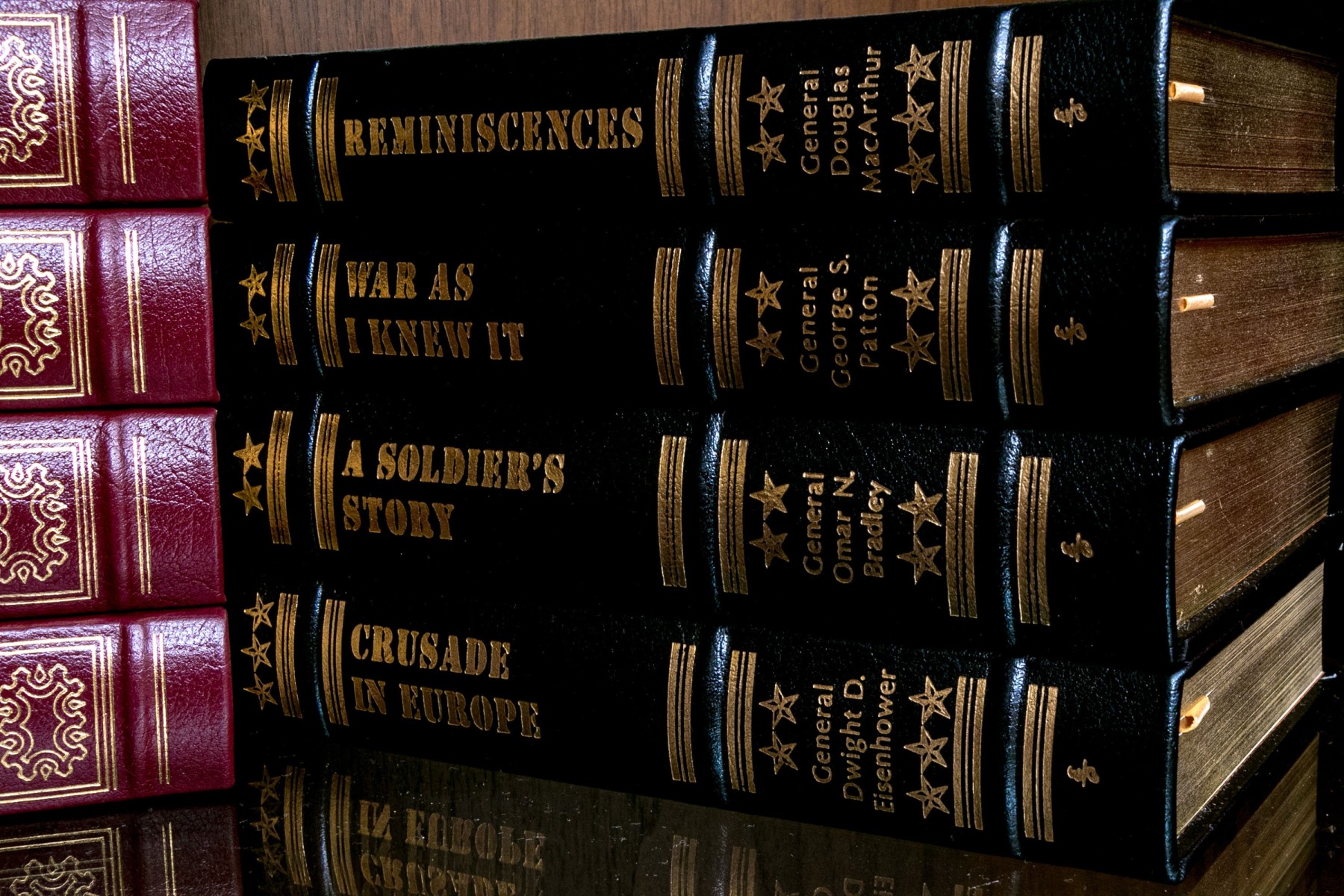 An excellent lot of leatherette/leather hardcover books. Includes Abraham Lincoln by Carl Sandburg, Ronald Reagan by Lou Cannon, Dictionaries, Cosmos, and books by Generals.