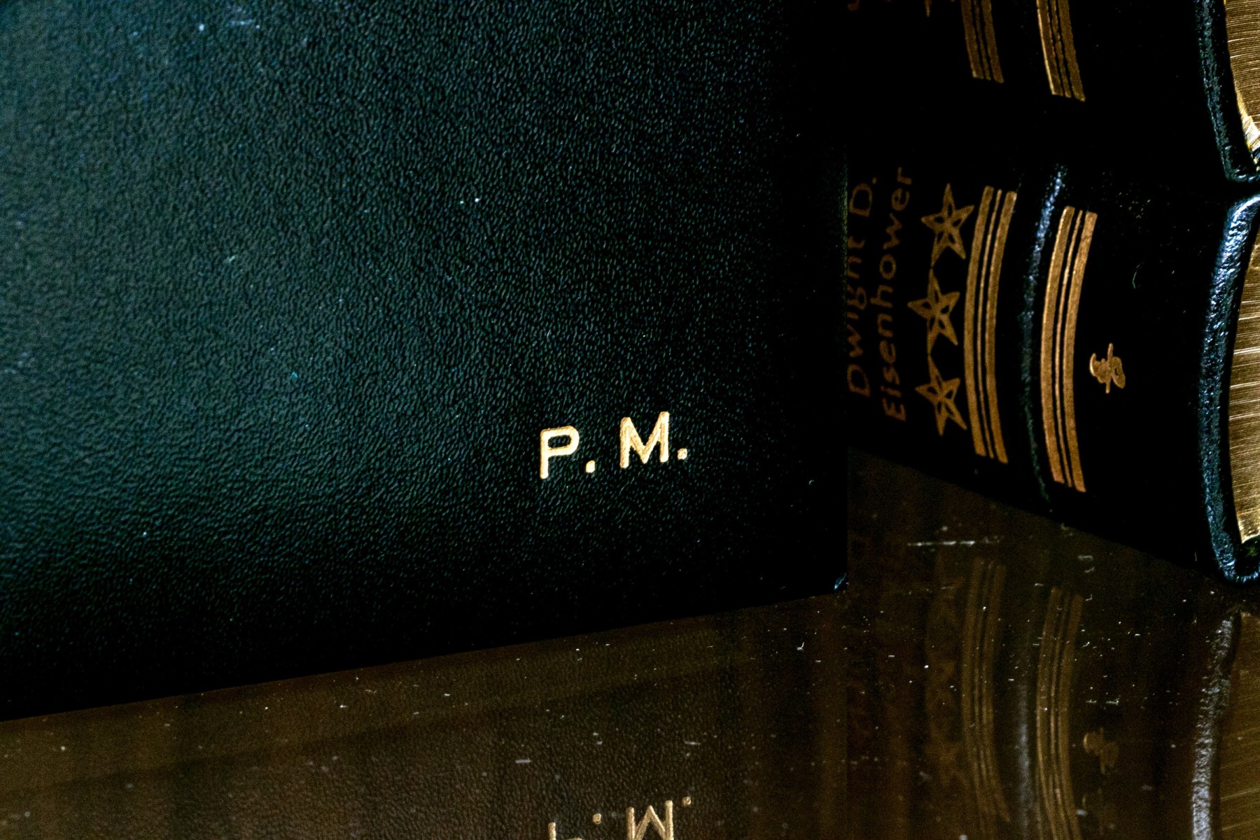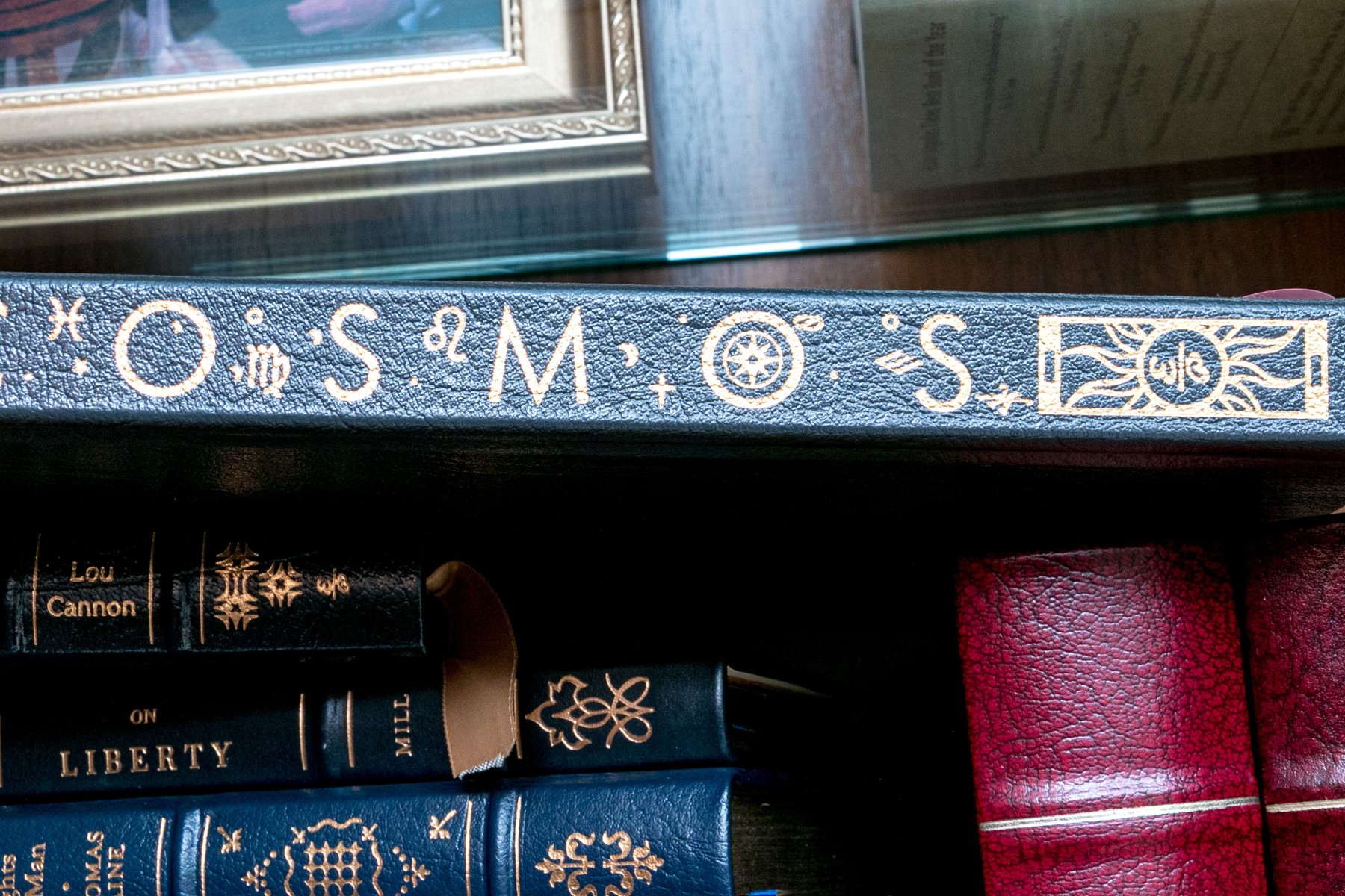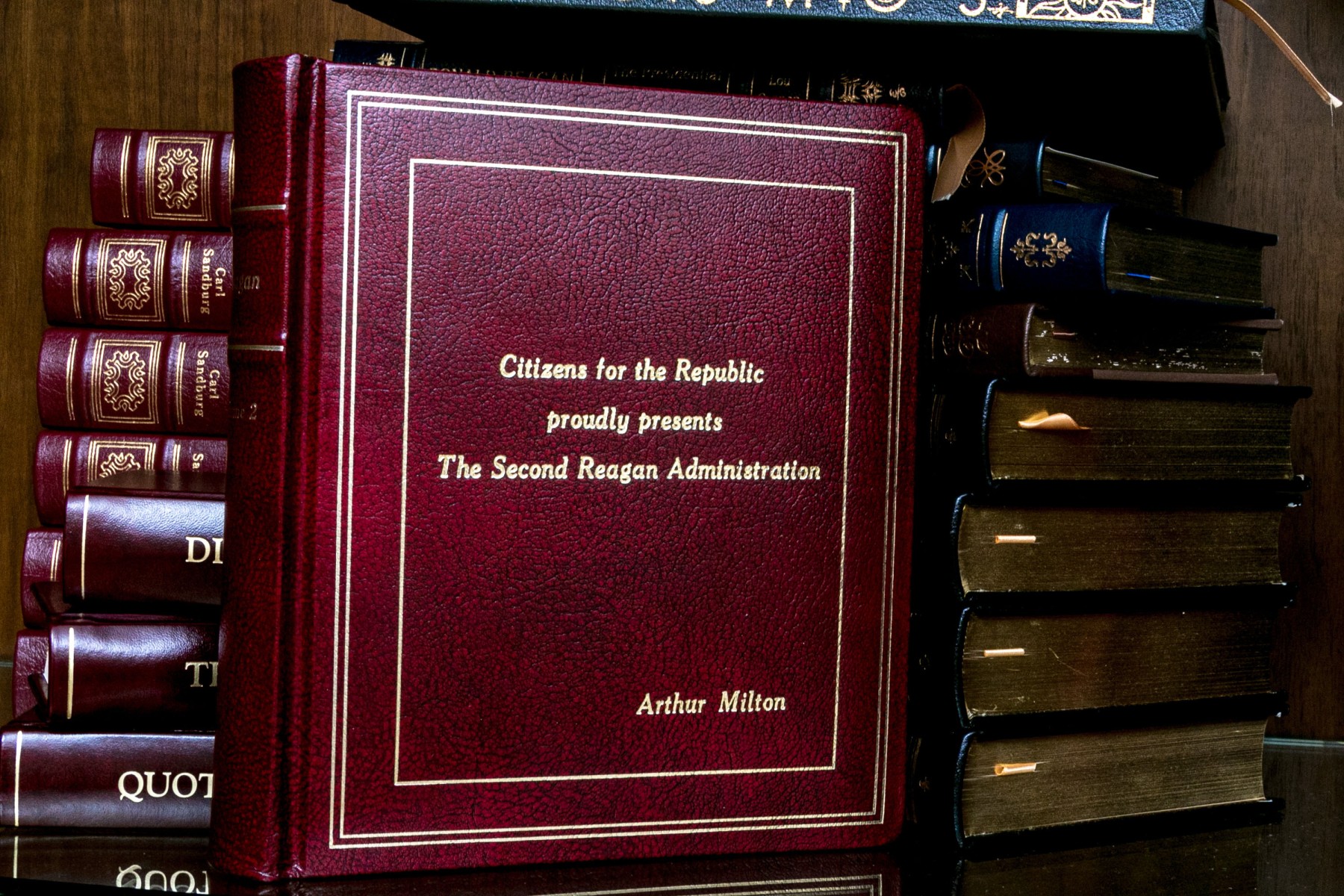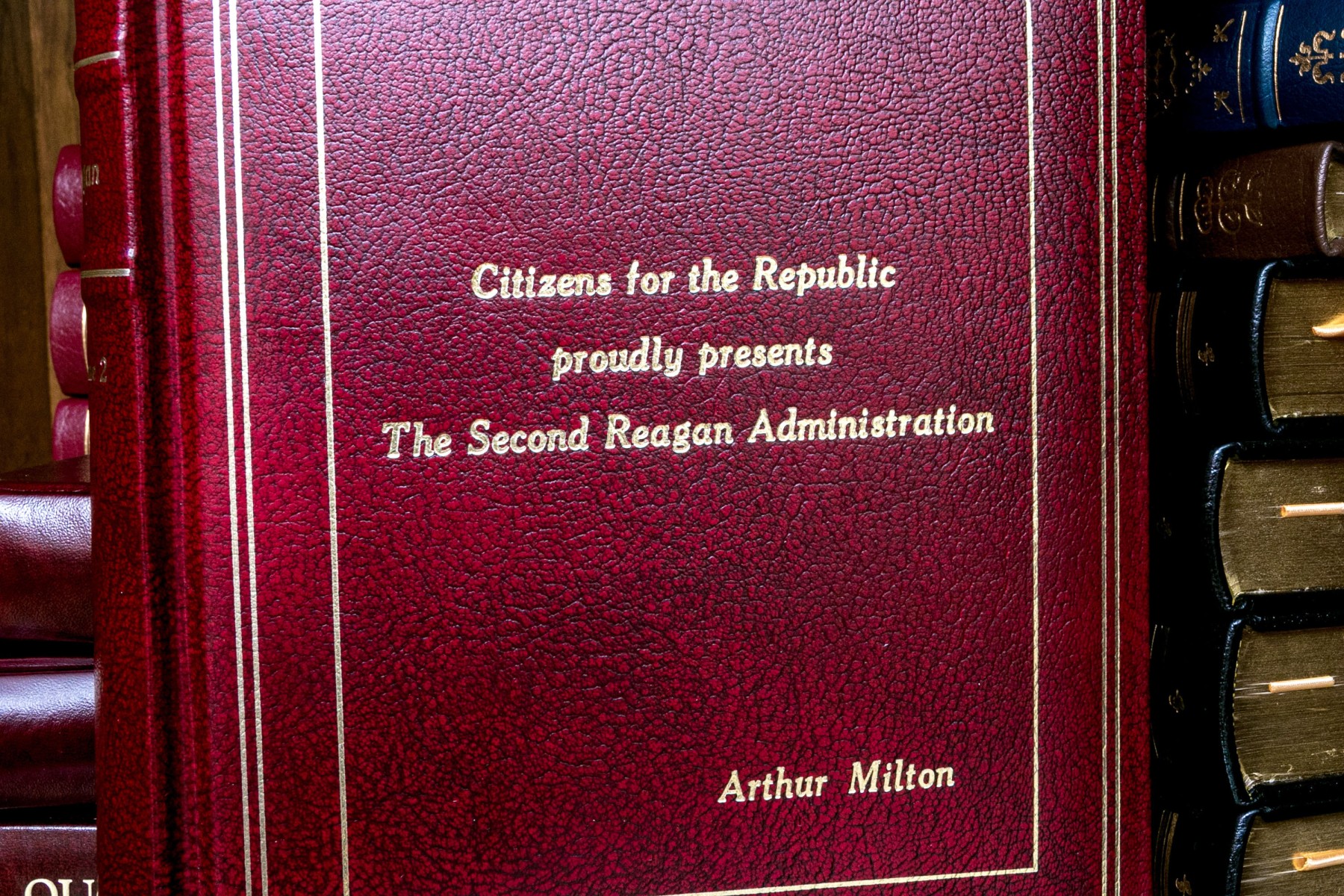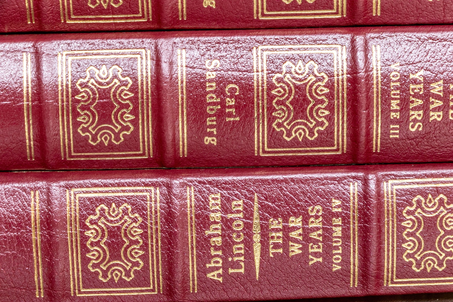An excellent lot of leatherette/leather hardcover books. Includes Abraham Lincoln by Carl Sandburg, Ronald Reagan by Lou Cannon, Dictionaries, Cosmos, and books by Generals.