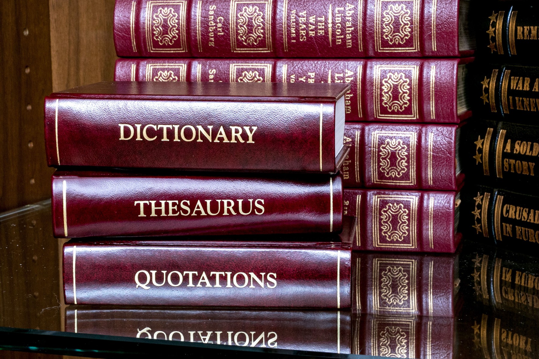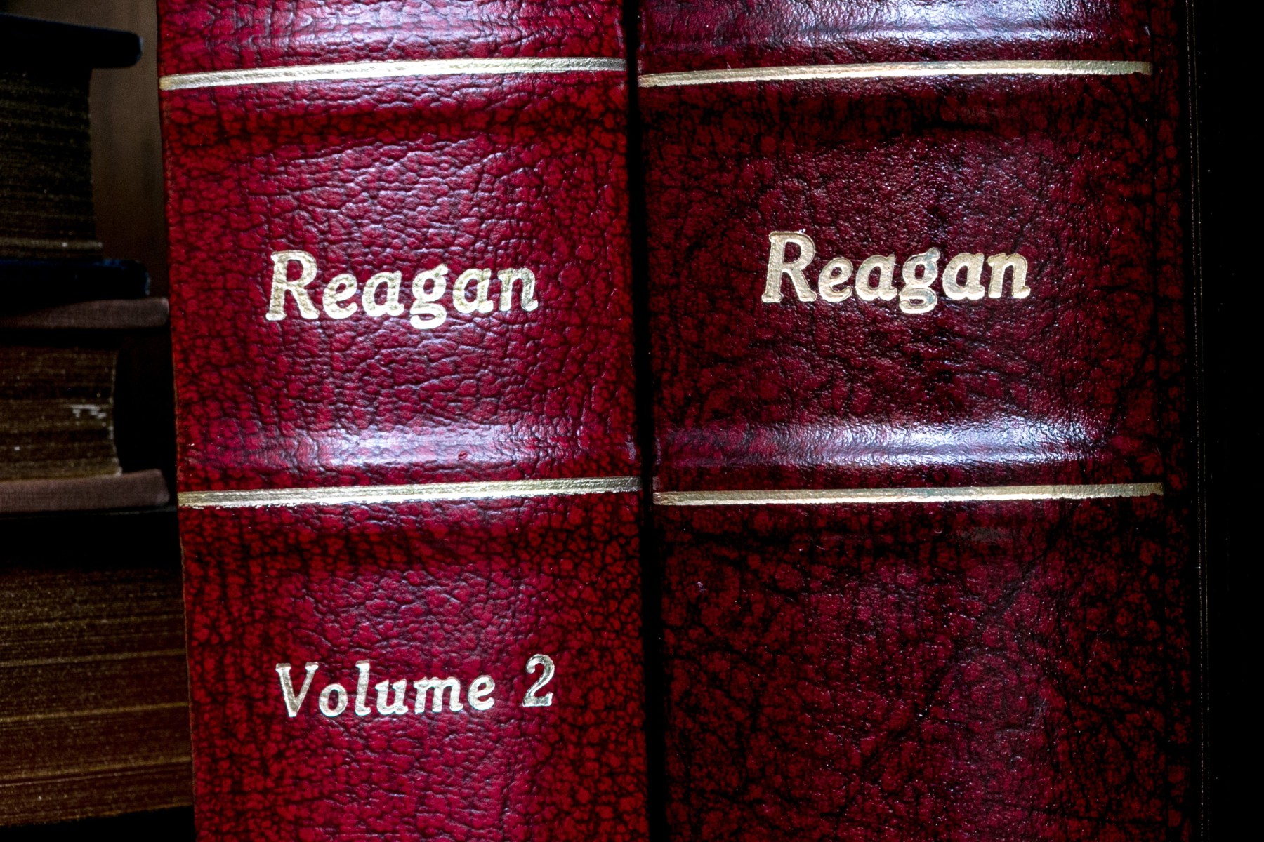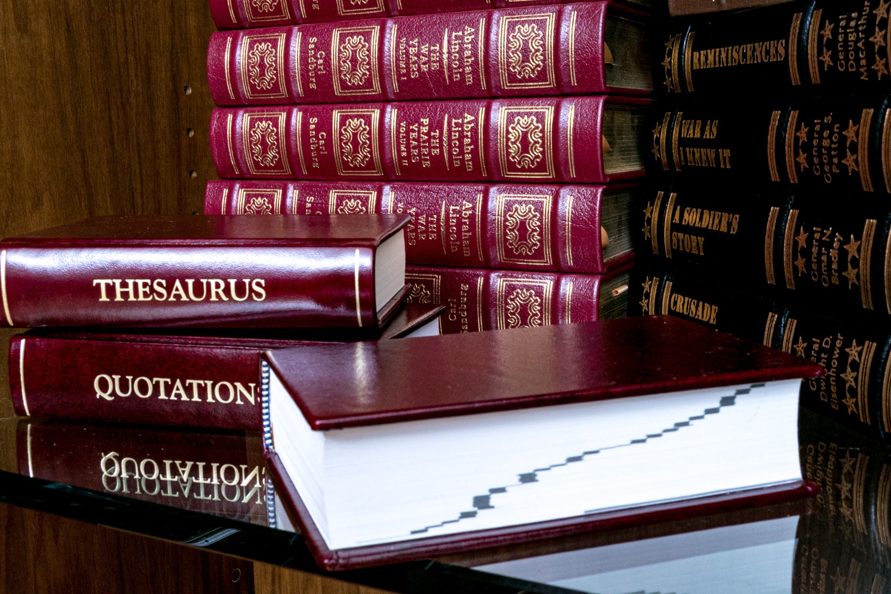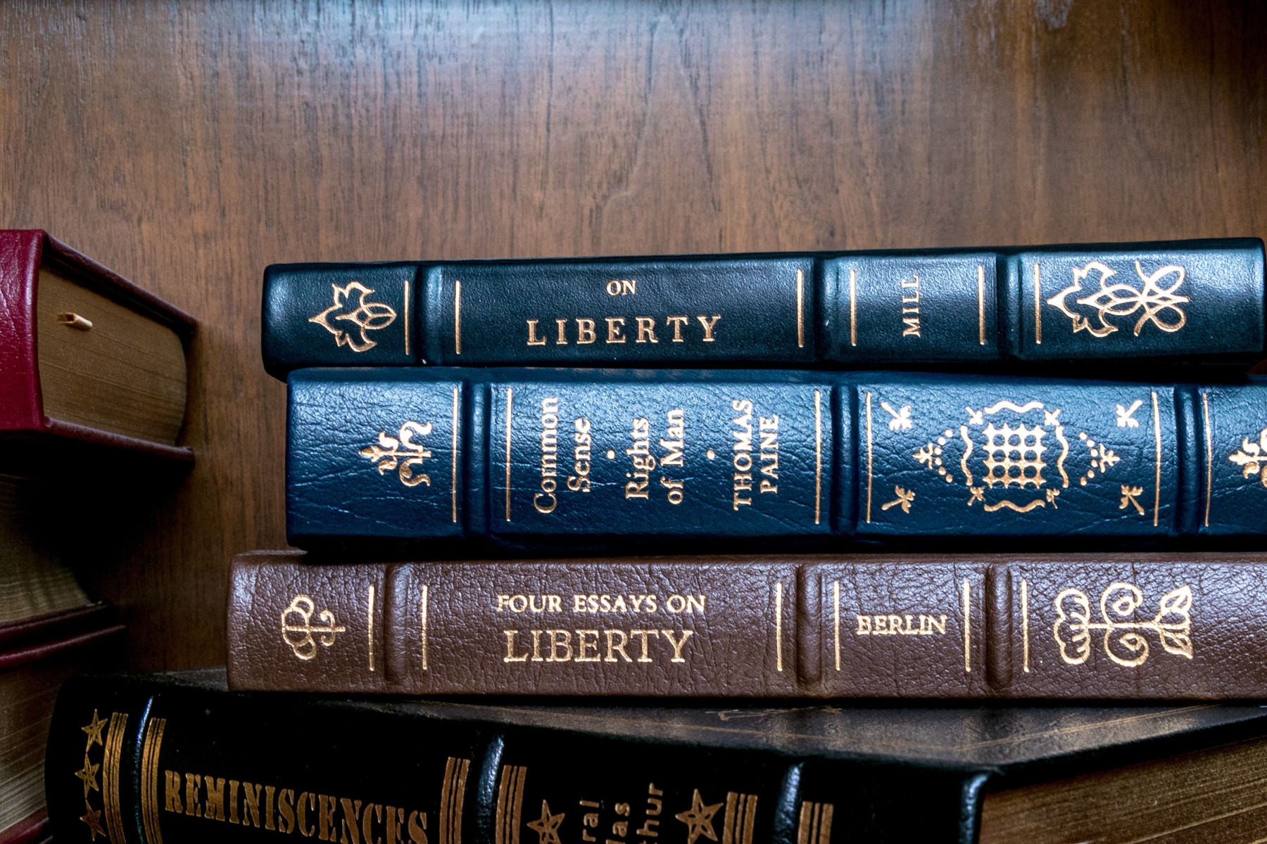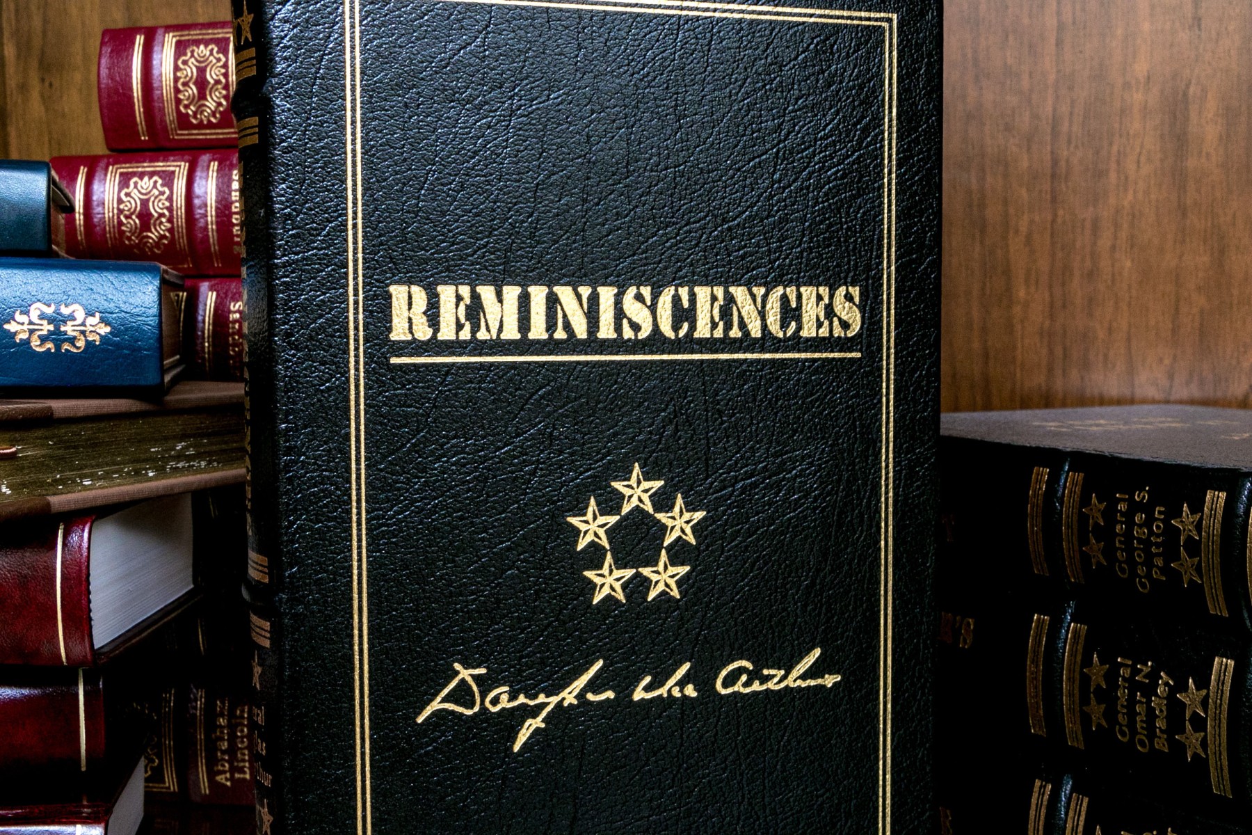 An excellent lot of leatherette/leather hardcover books. Includes Abraham Lincoln by Carl Sandburg, Ronald Reagan by Lou Cannon, Dictionaries, Cosmos, and books by Generals.