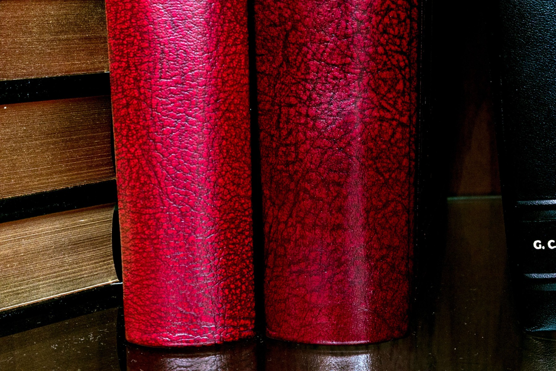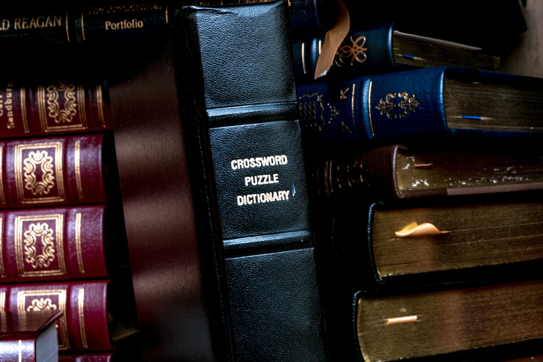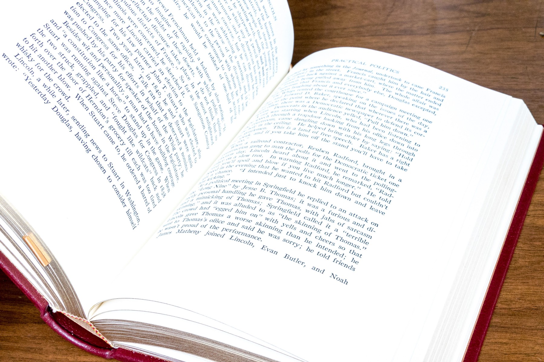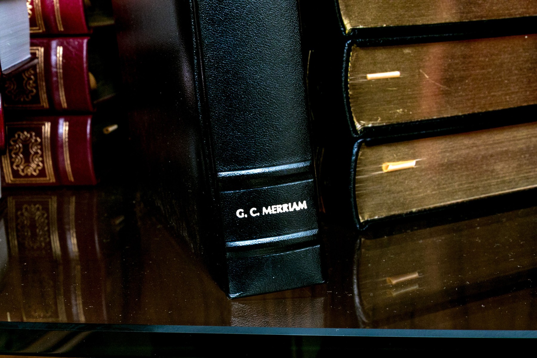 An excellent lot of leatherette/leather hardcover books. Includes Abraham Lincoln by Carl Sandburg, Ronald Reagan by Lou Cannon, Dictionaries, Cosmos, and books by Generals.