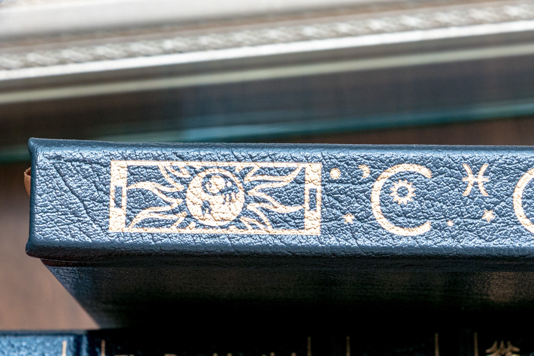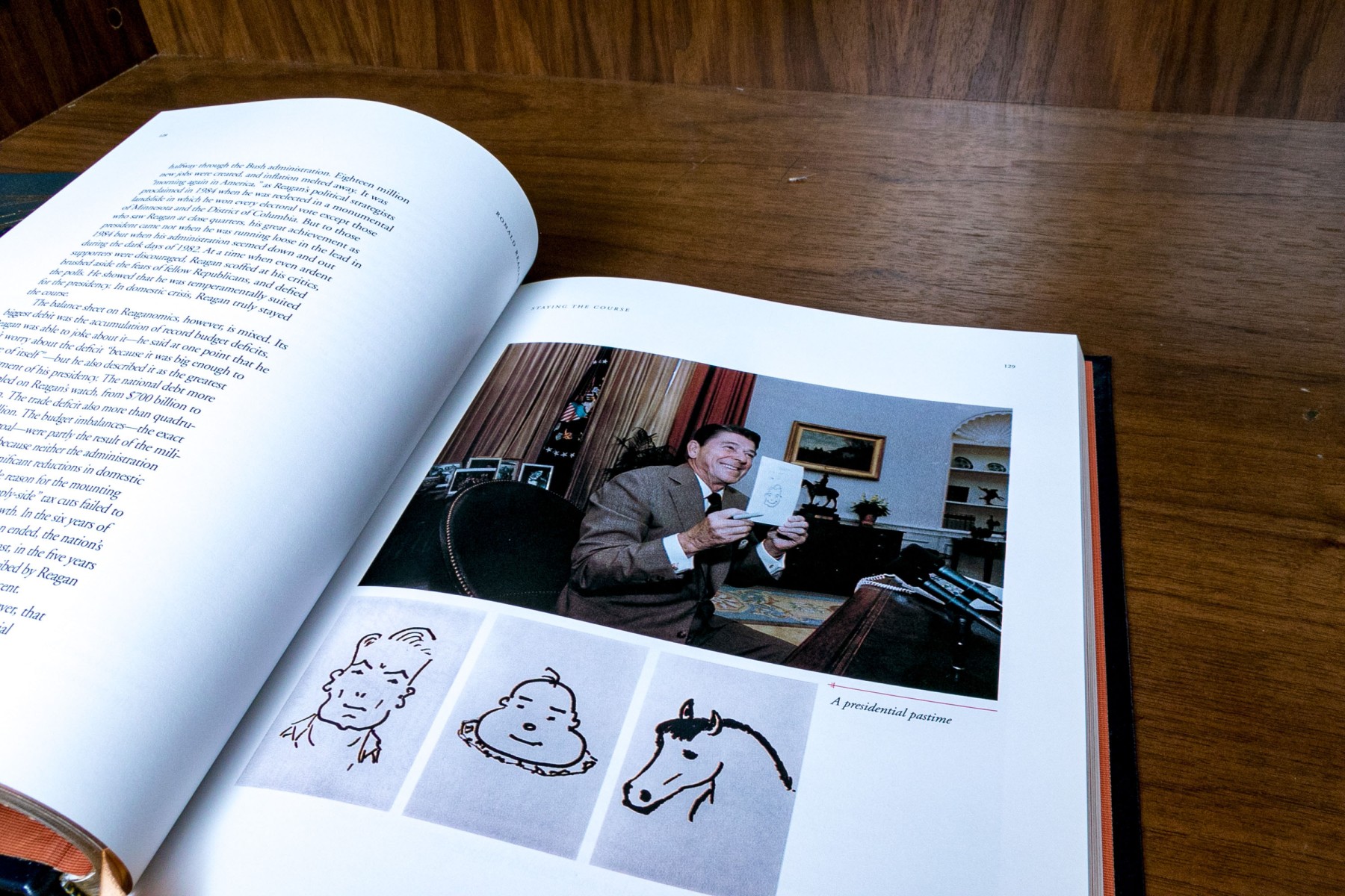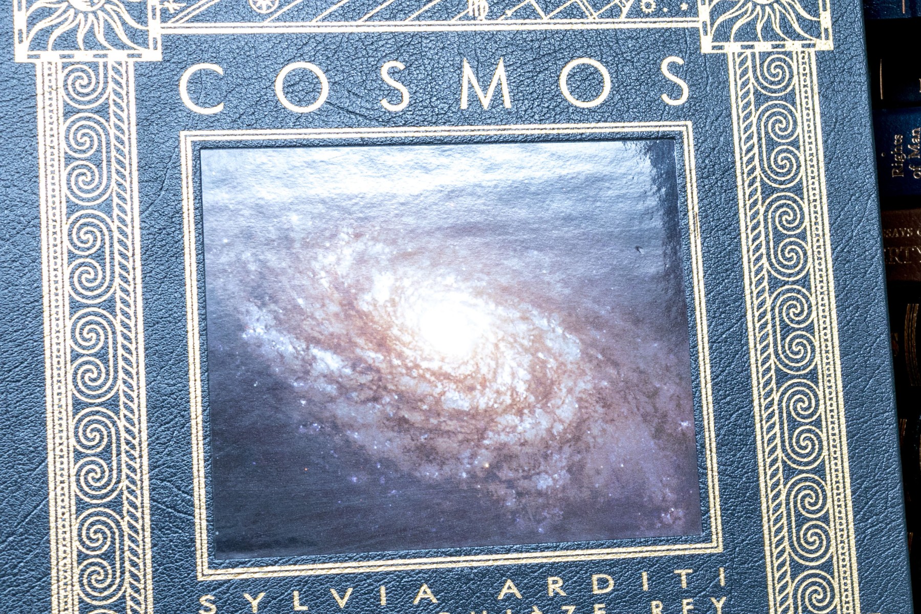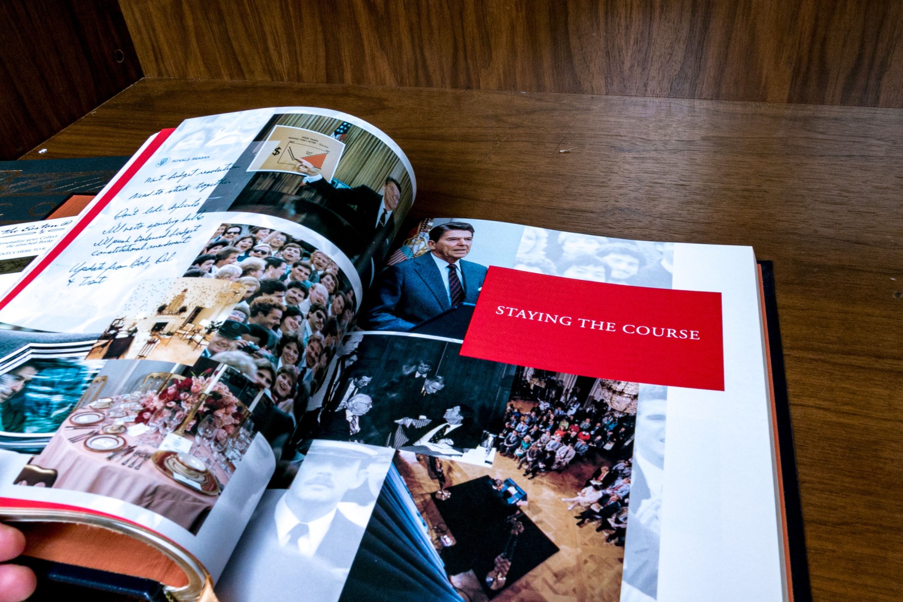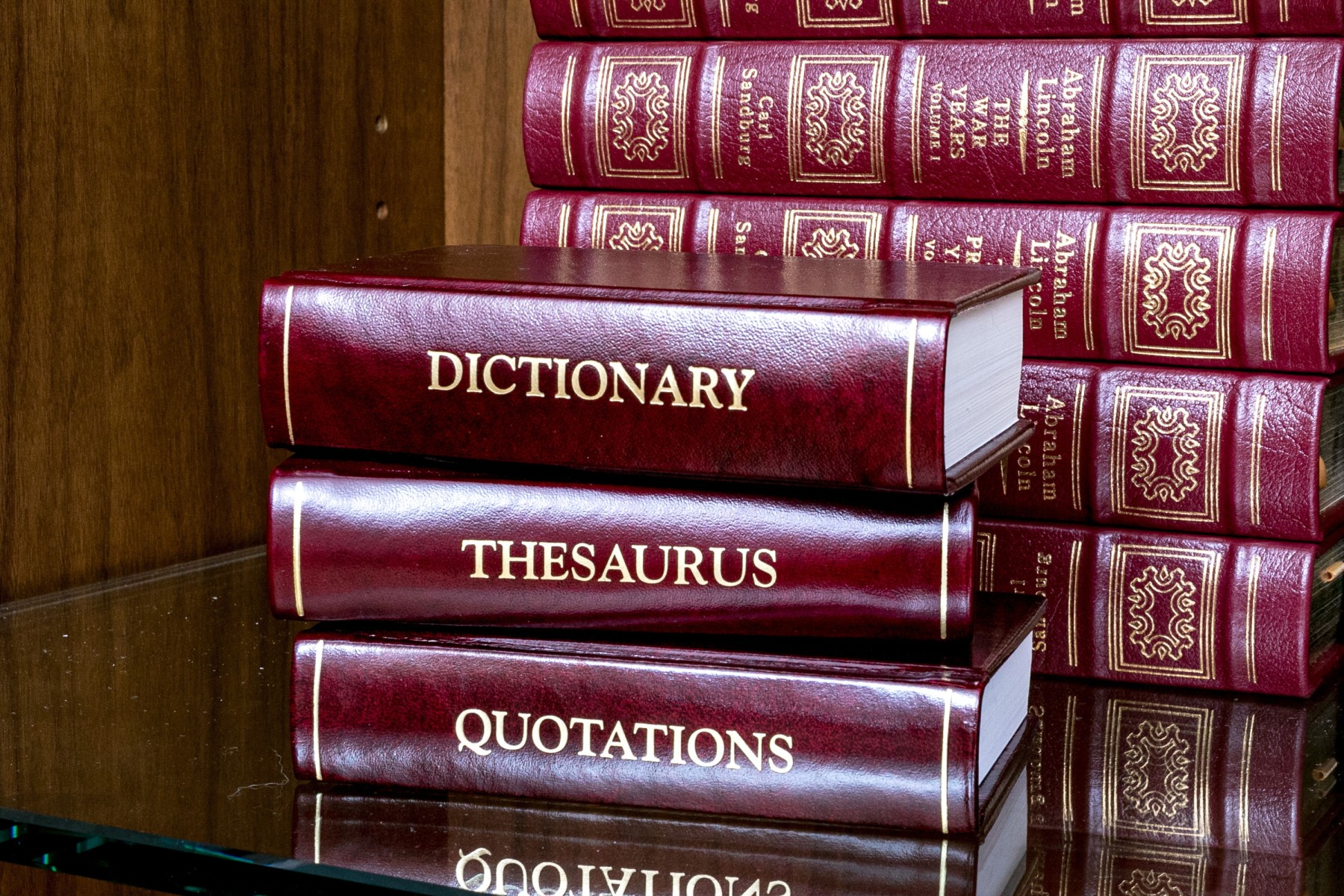 An excellent lot of leatherette/leather hardcover books. Includes Abraham Lincoln by Carl Sandburg, Ronald Reagan by Lou Cannon, Dictionaries, Cosmos, and books by Generals.