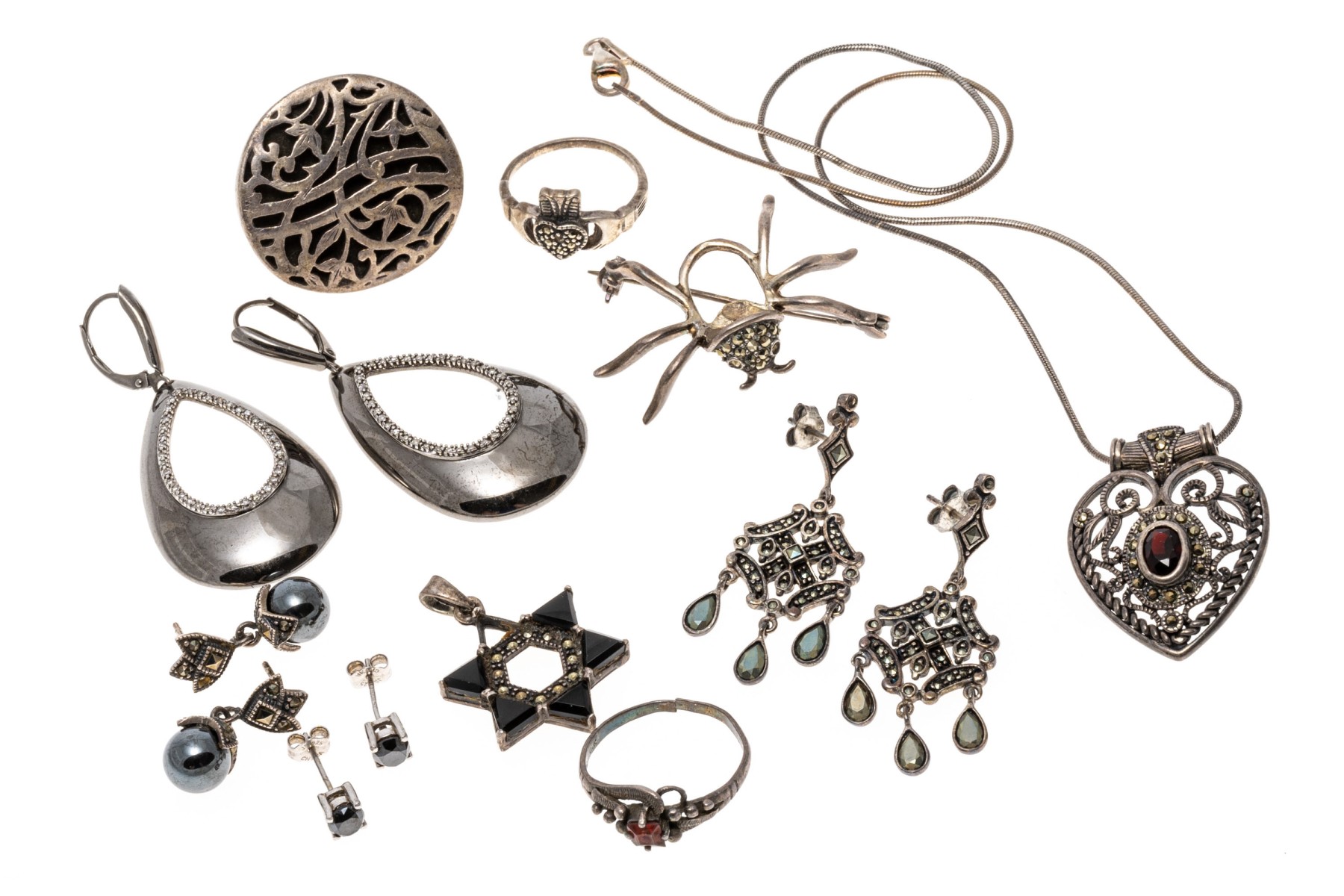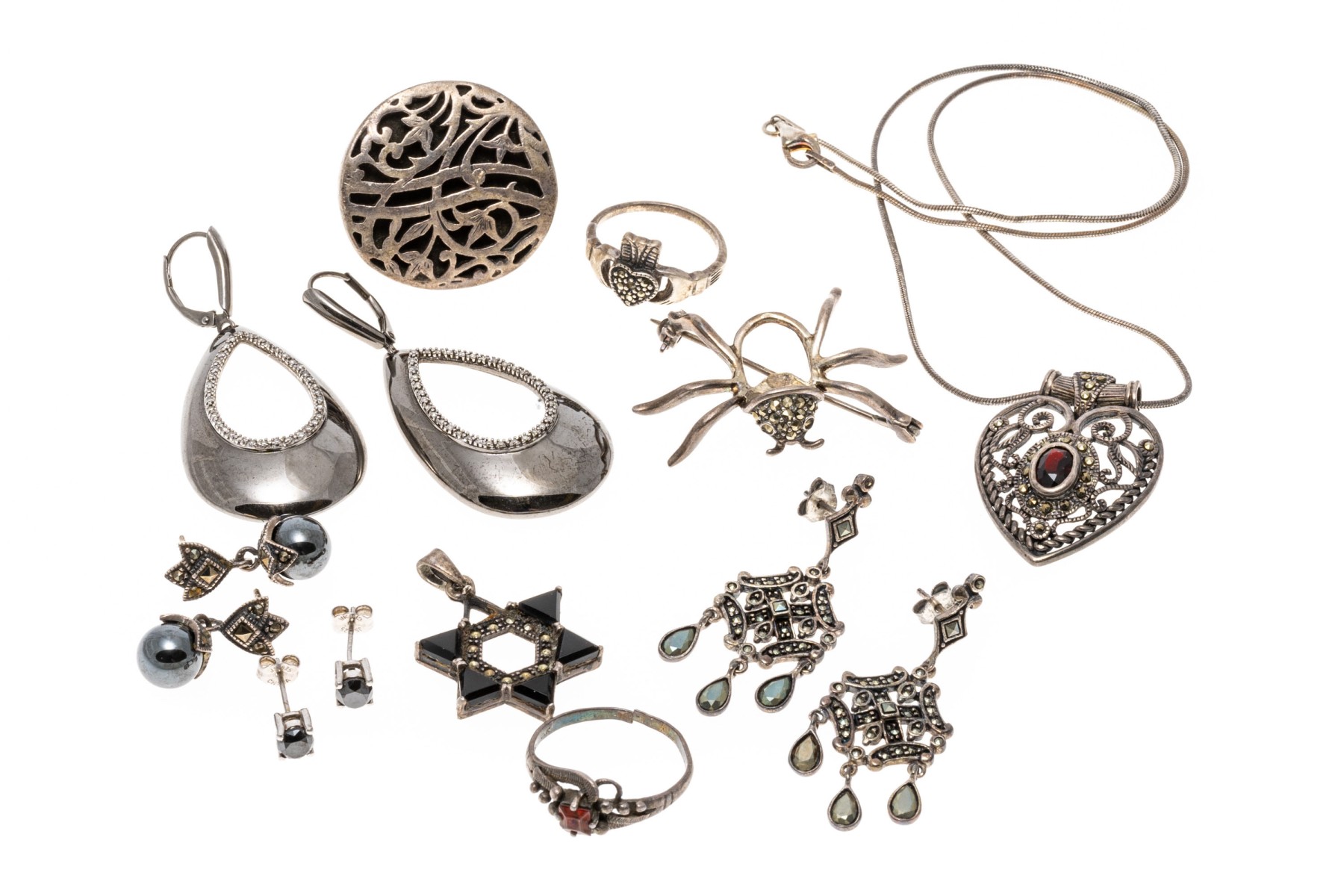 An excellent assortment of sterling silver jewelry, including earrings, pendants, necklaces, brooches, and rings.