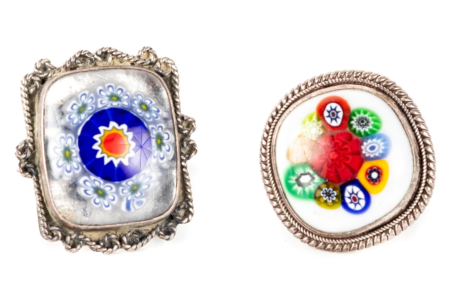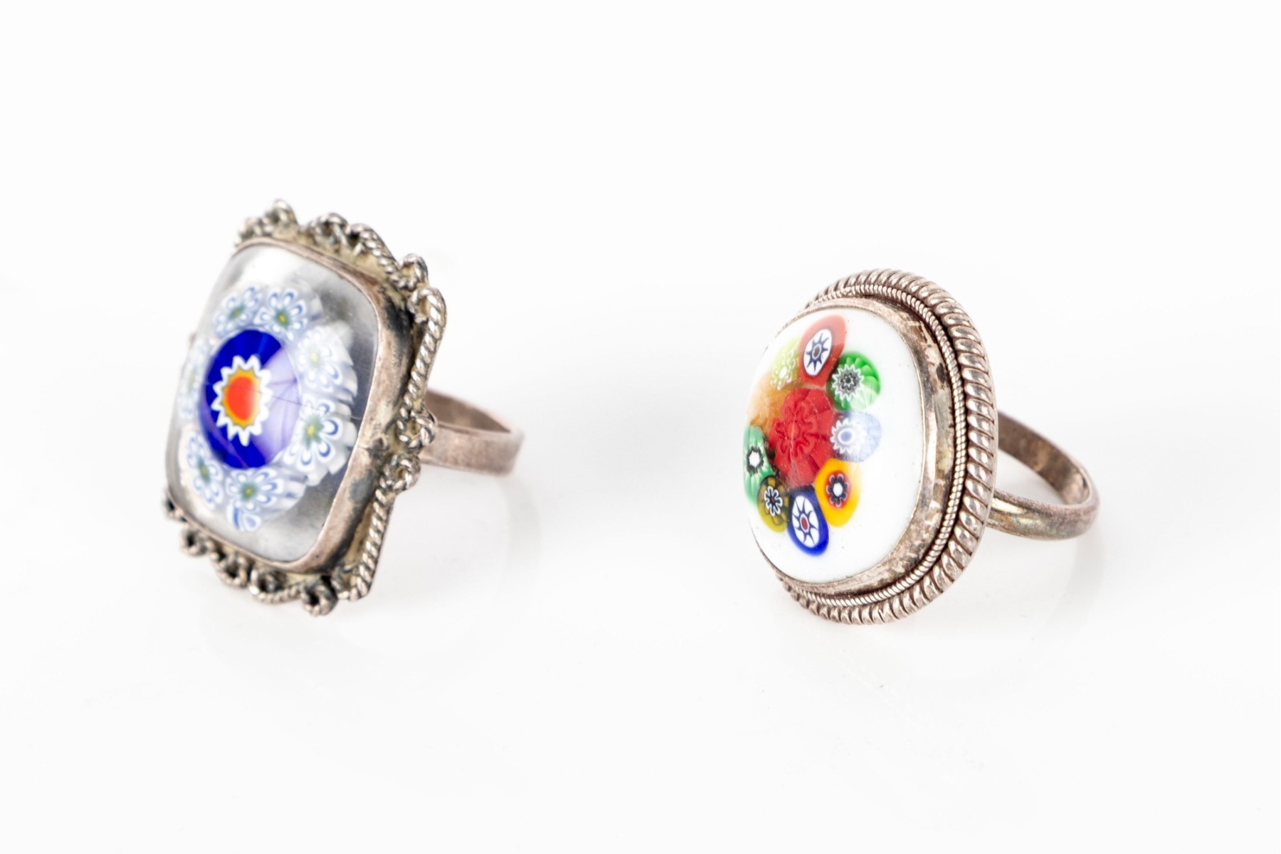 A pair of amazing hand-crafted, vintage milliefori glass rings set in sterling silver.