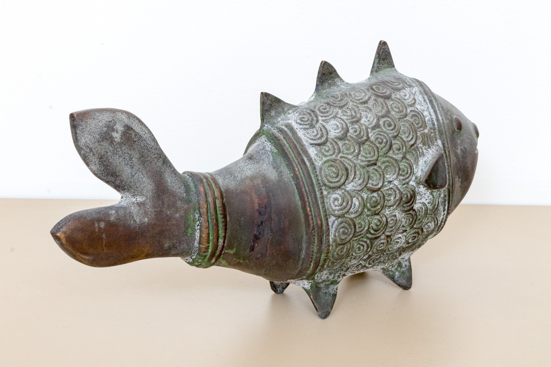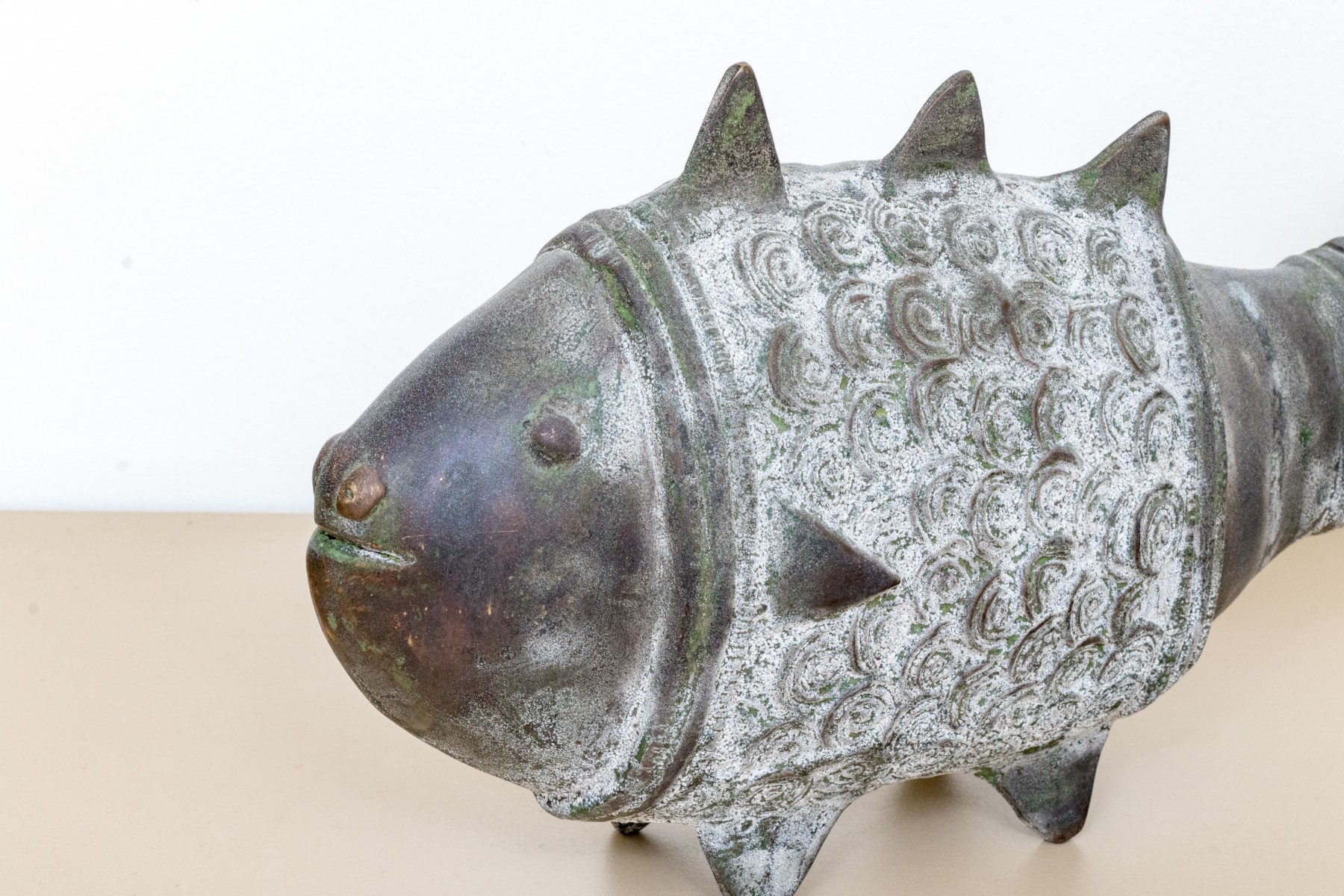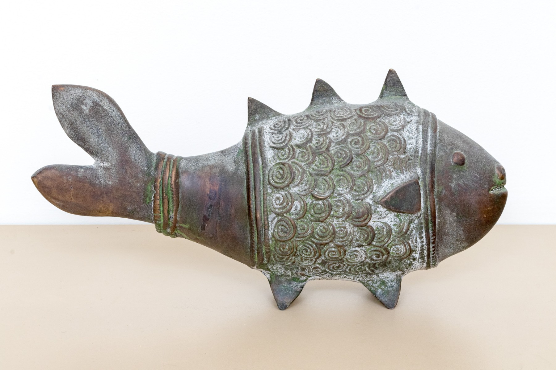 A fabulous sculpture of a fish in beautifully patinaed brass, lending a rustic and time worn quality to the piece. The fish stands on pointed ventral fins that compliment three spikey dorsal fins along the spine. The body is finely detailed with swirled textures, creating a striking and eye-catching display. Finished with a slightly upturned and pronged tail.