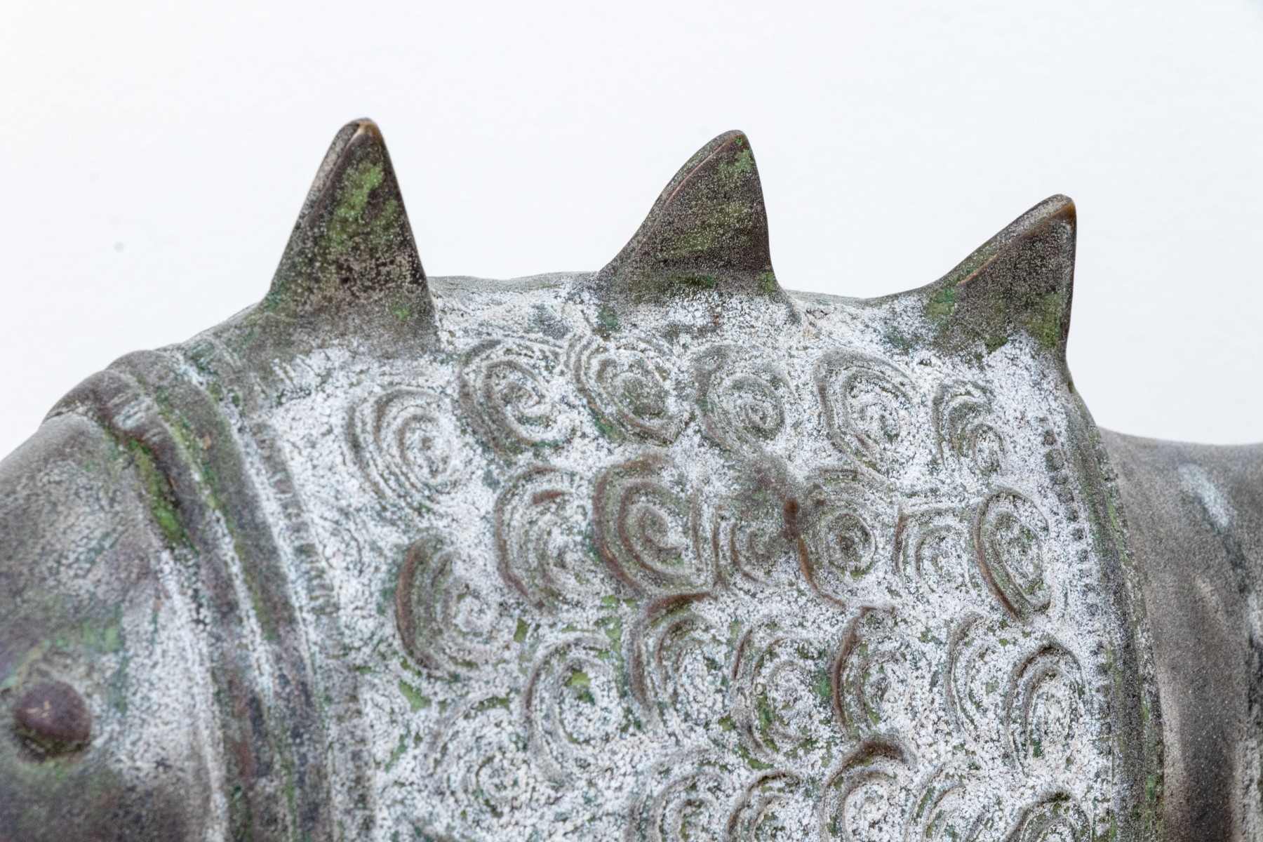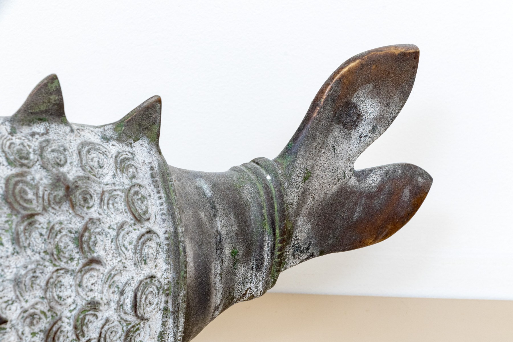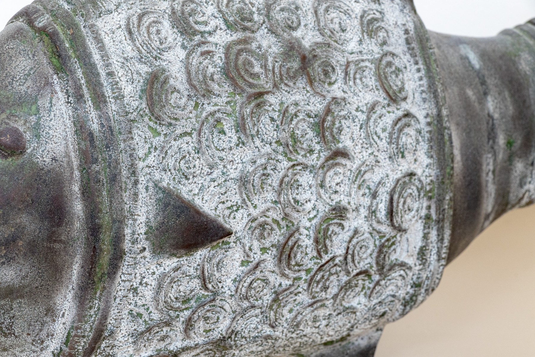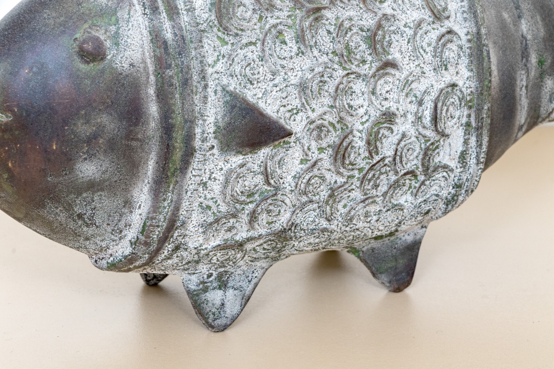 A fabulous sculpture of a fish in beautifully patinaed brass, lending a rustic and time worn quality to the piece. The fish stands on pointed ventral fins that compliment three spikey dorsal fins along the spine. The body is finely detailed with swirled textures, creating a striking and eye-catching display. Finished with a slightly upturned and pronged tail.