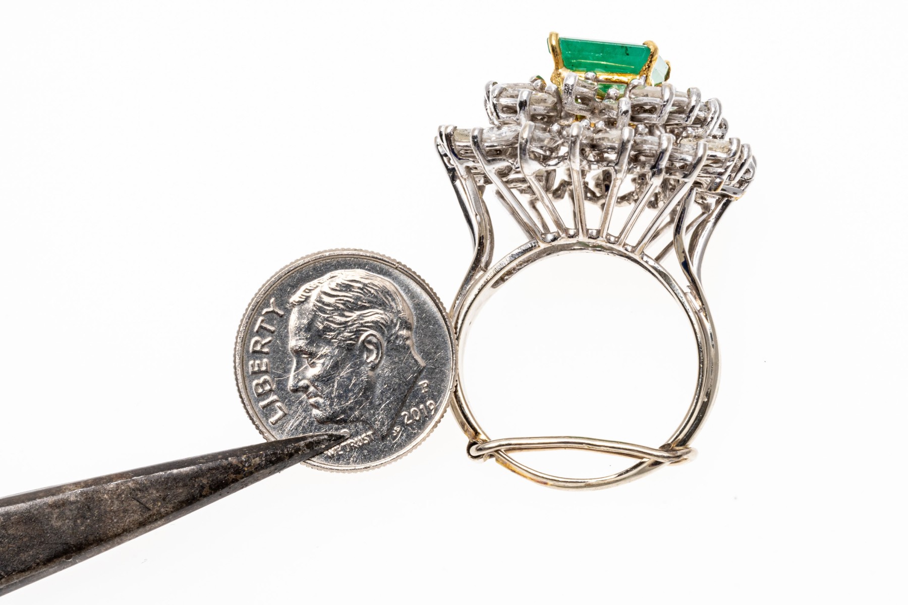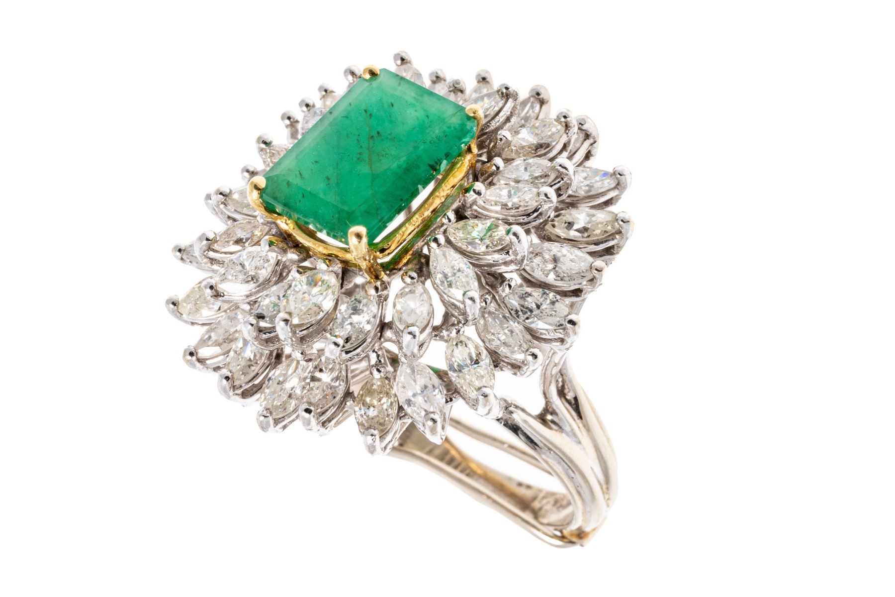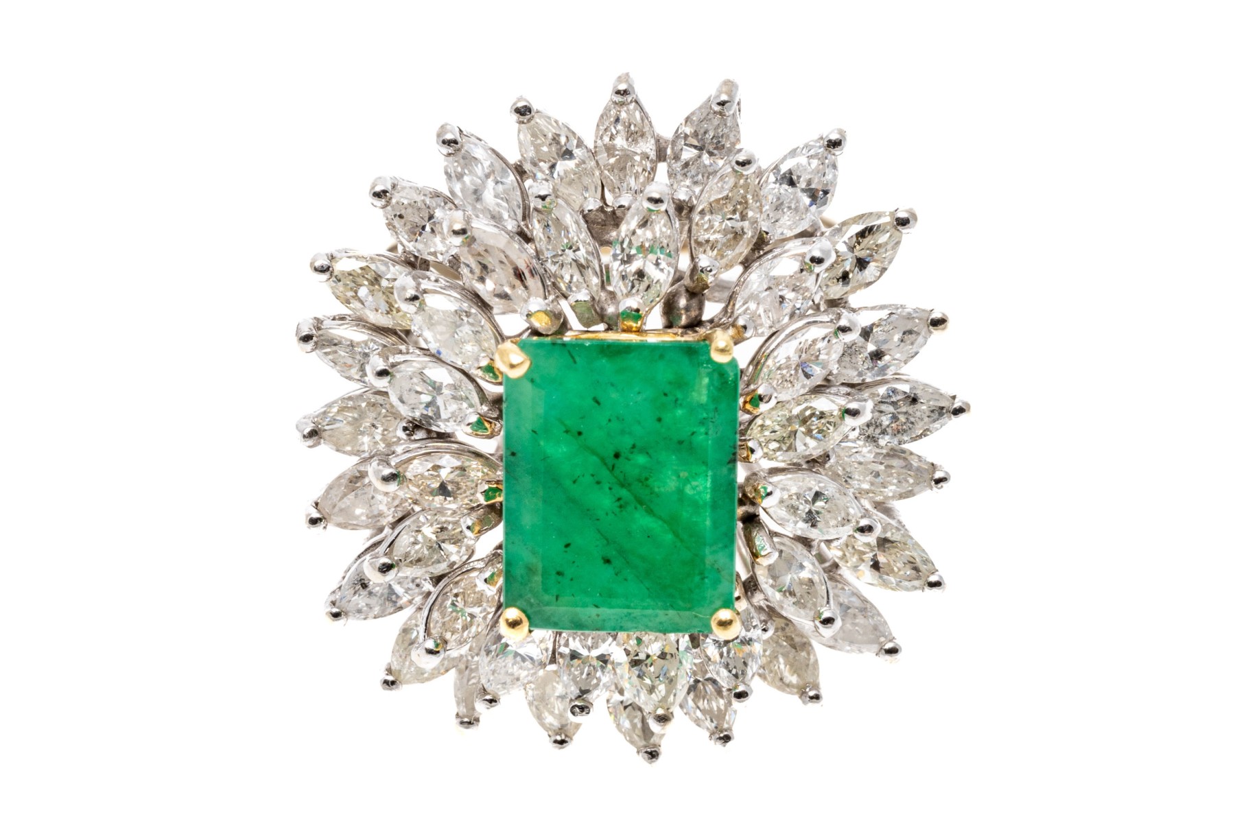 An exceptional white gold cocktail ring displaying an emerald-cut emerald with eye-catching inclusions, raised in a yellow gold prong setting. The emerald is surrounded by two haloes of marquise diamonds for brilliant, exploding shimmer. The emerald is approximately 2.83 CTS, and the diamonds are approximately 4.3 TCW.