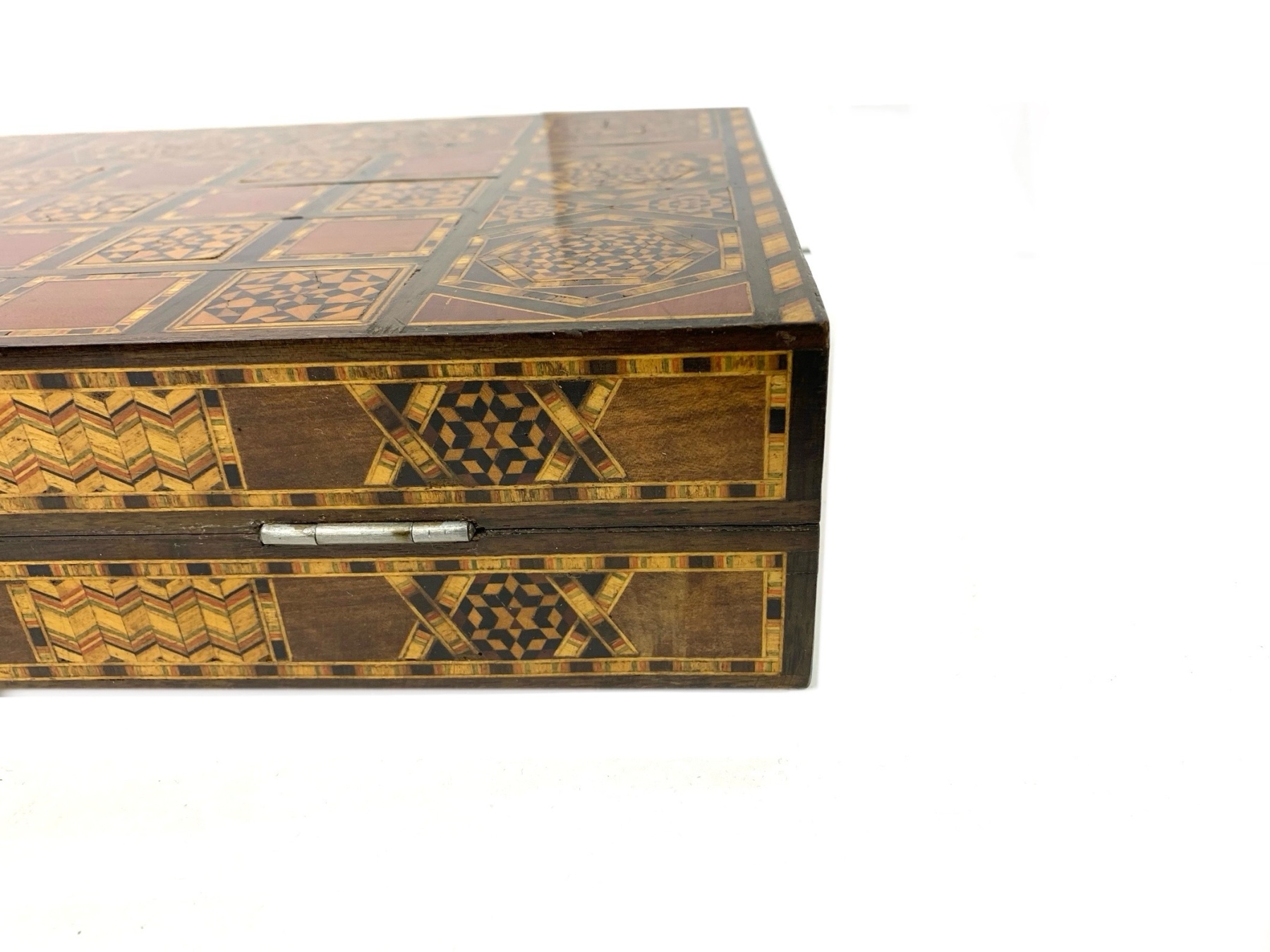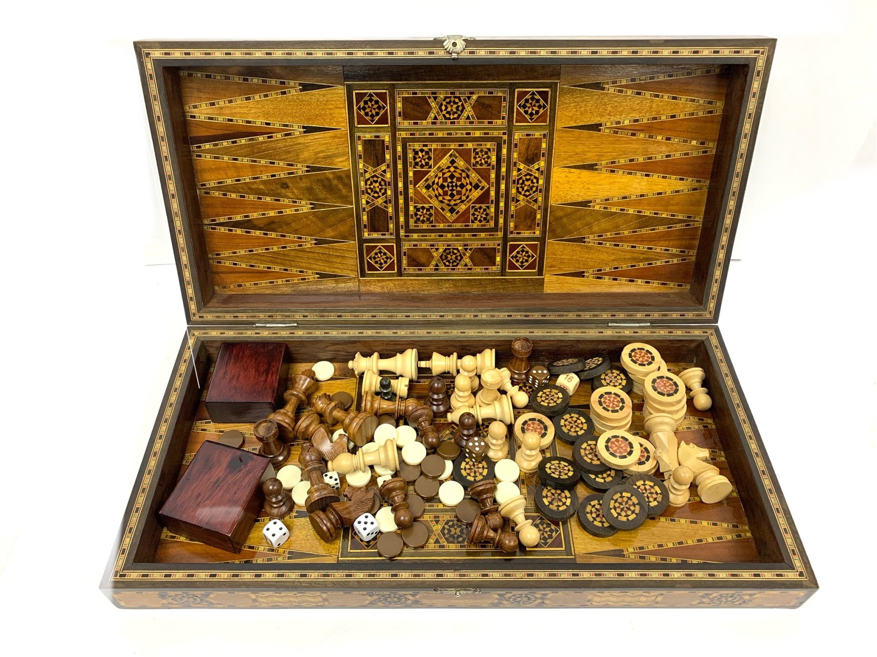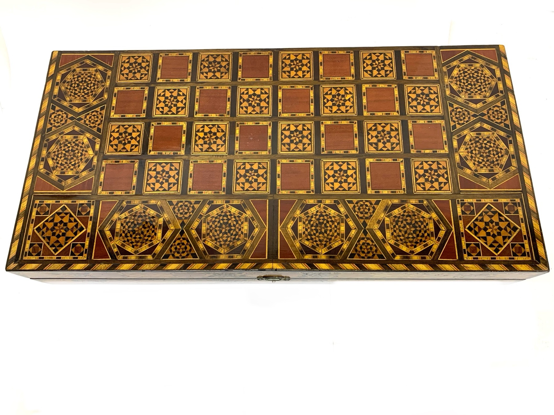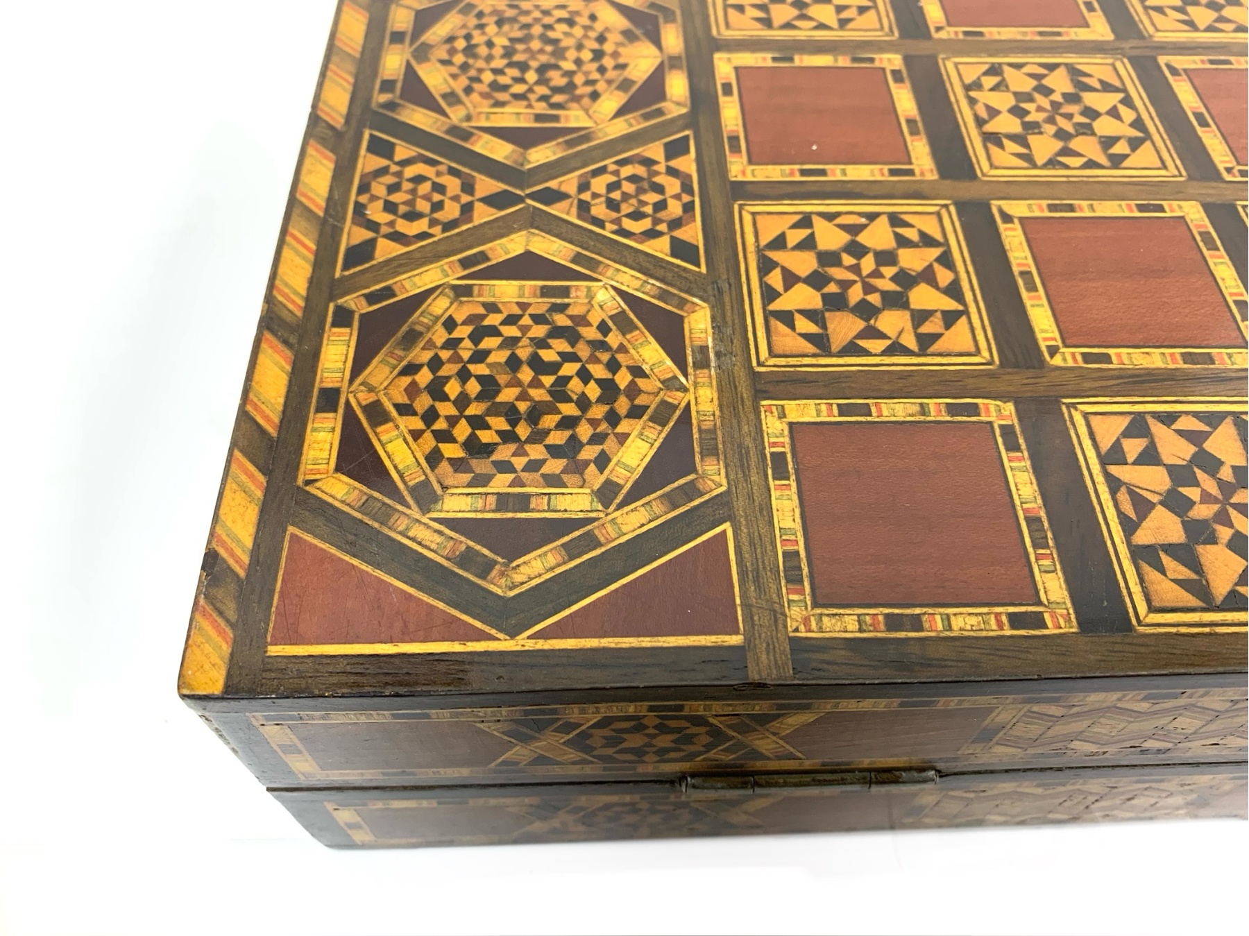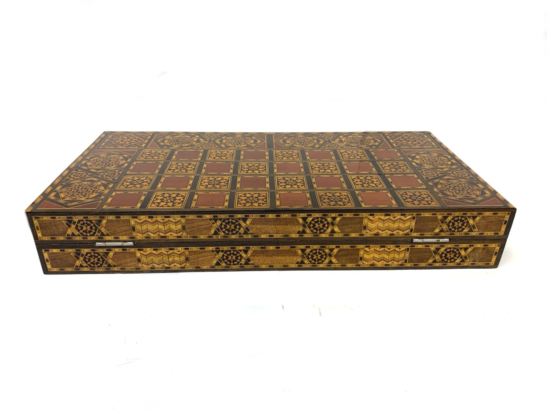 Large rectangular Games Box intricately inlaid in many different woods with all surfaces in detailed Geometric patterns. The Board is capable for playing Chess, Backgammon and Checkers and comes equipped with many Games pieces: