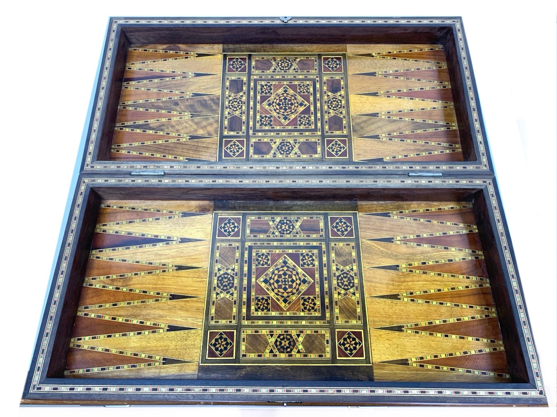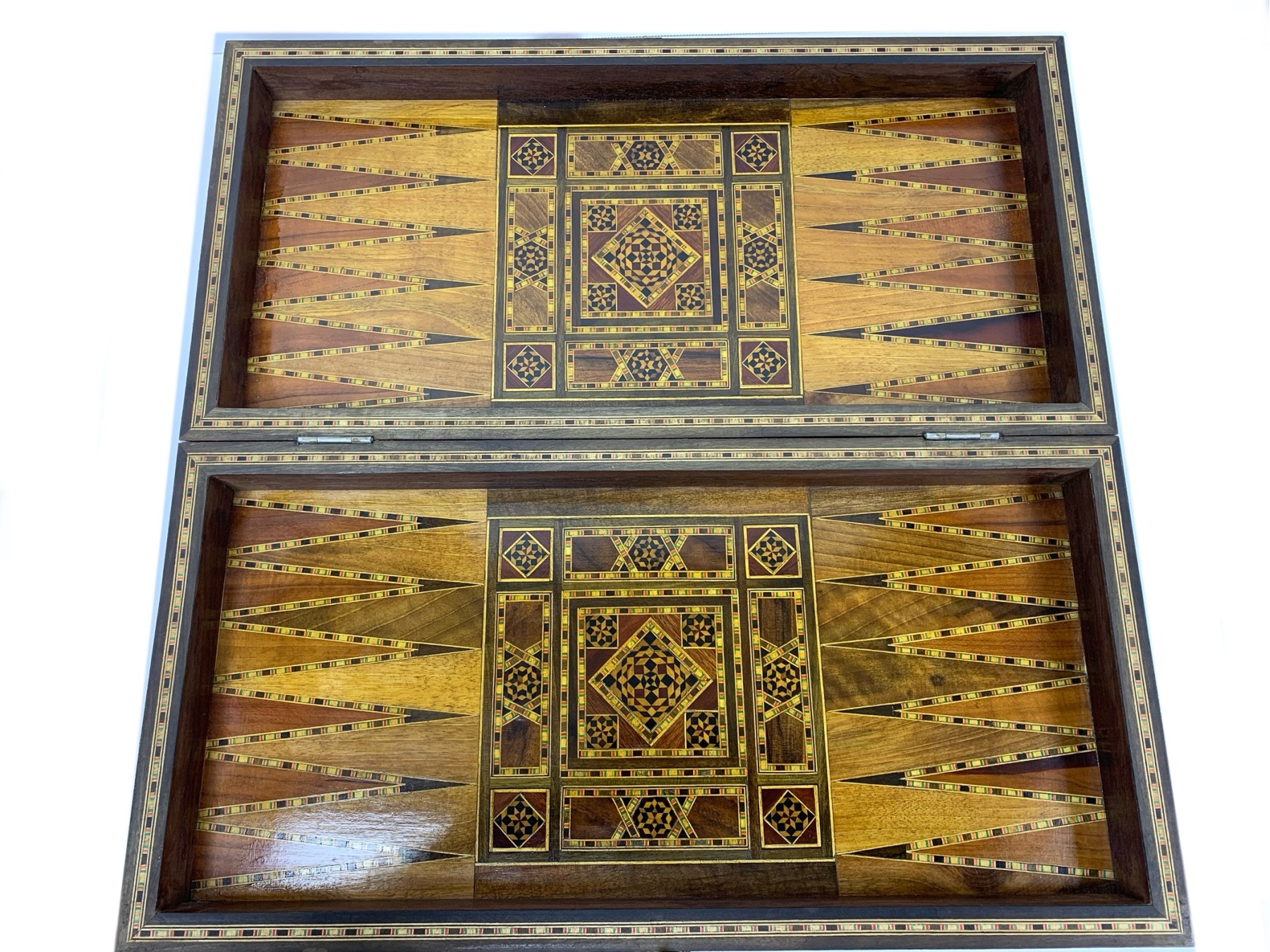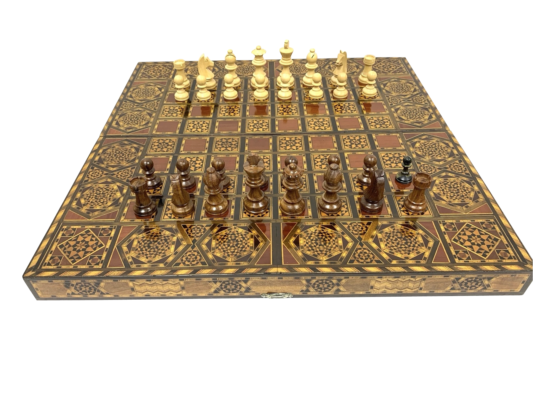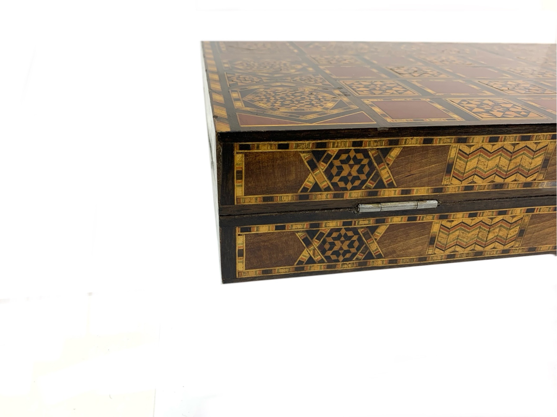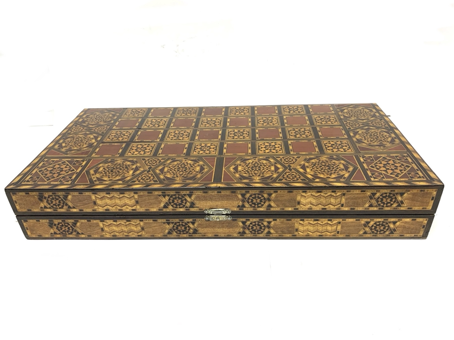 Large rectangular Games Box intricately inlaid in many different woods with all surfaces in detailed Geometric patterns. The Board is capable for playing Chess, Backgammon and Checkers and comes equipped with many Games pieces: