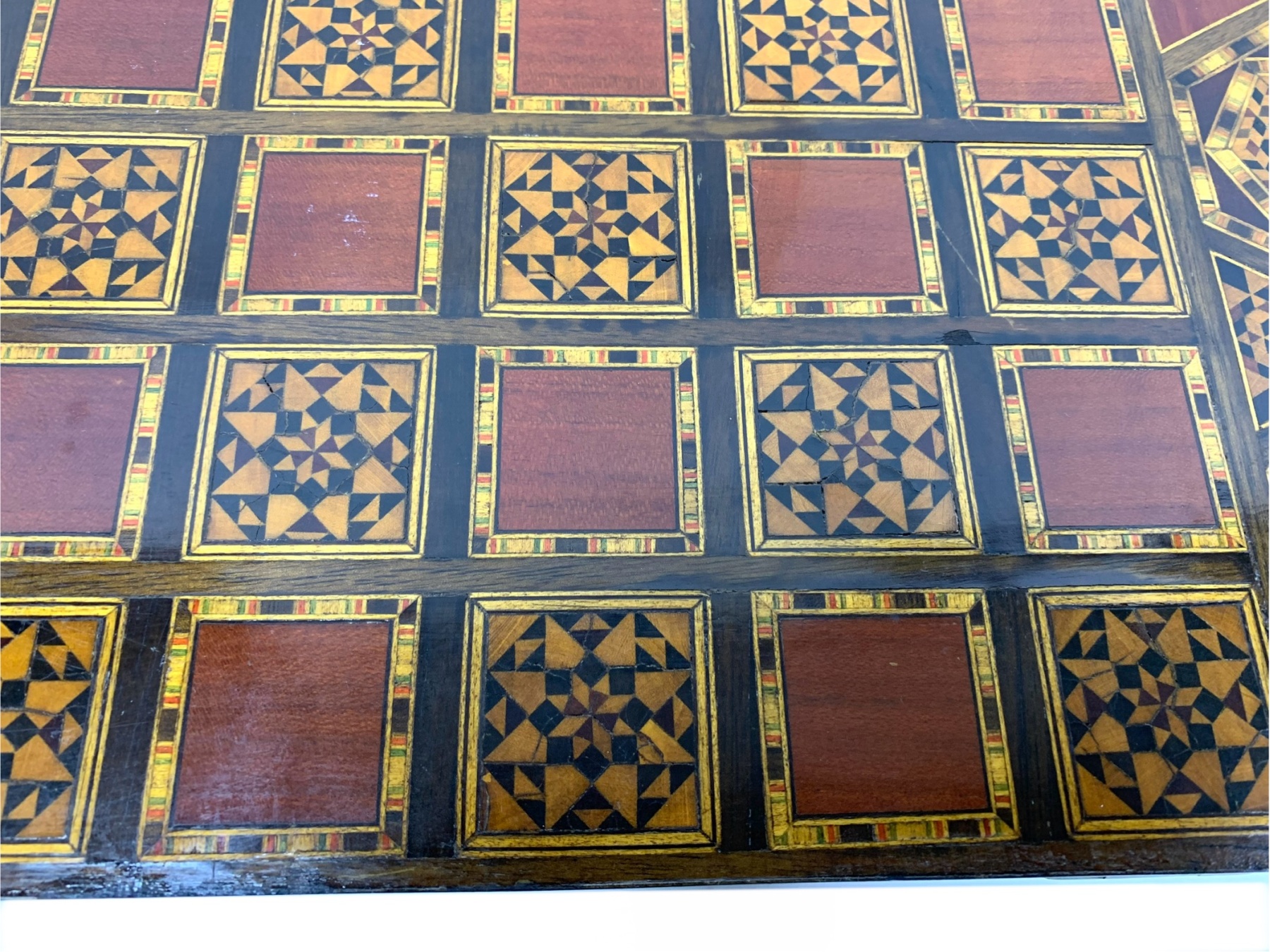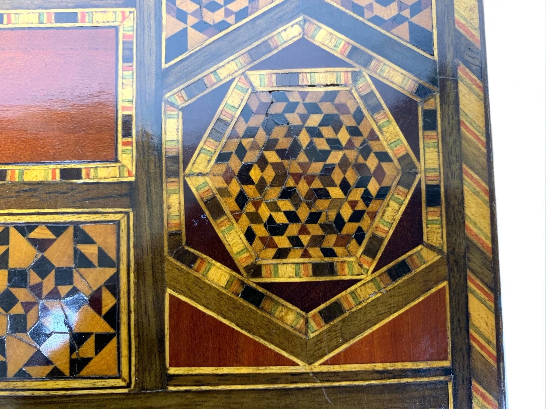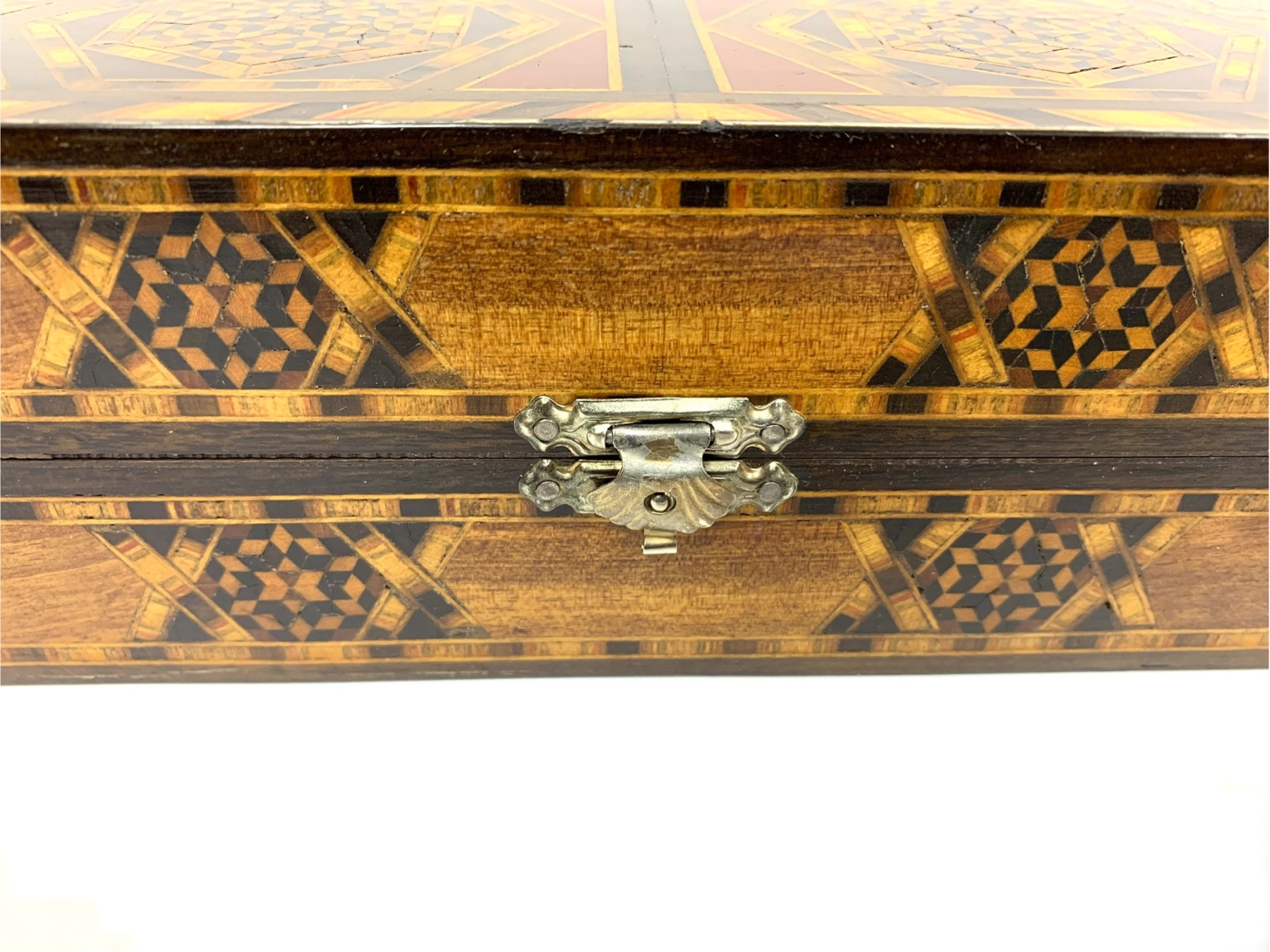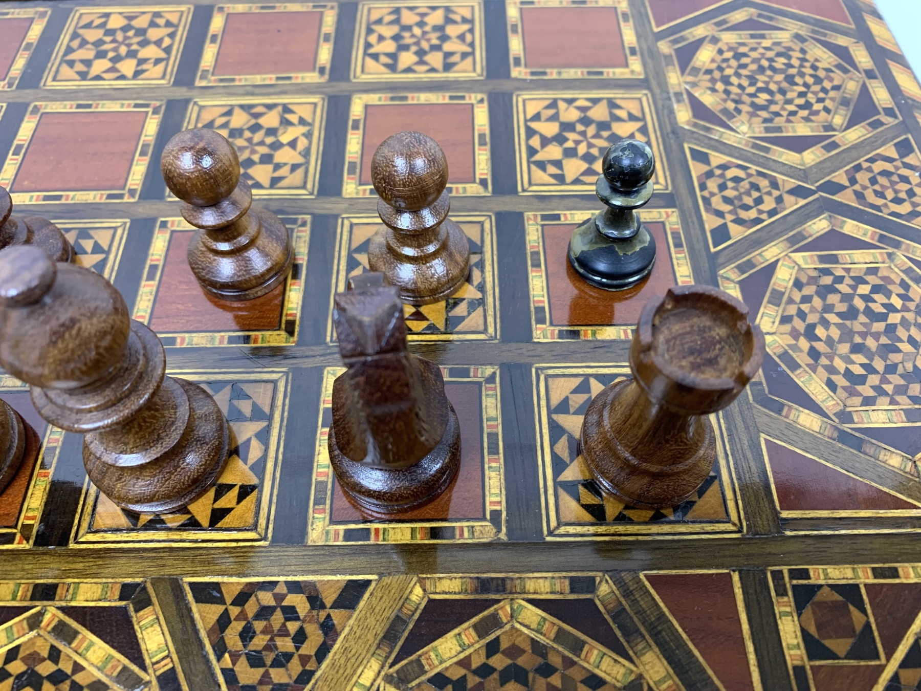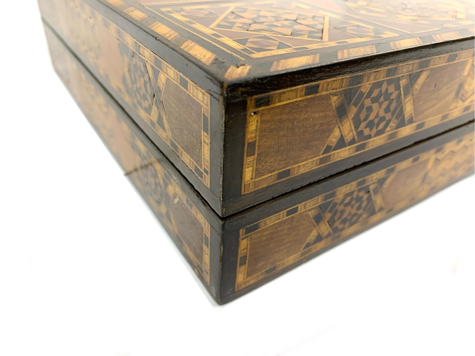 Large rectangular Games Box intricately inlaid in many different woods with all surfaces in detailed Geometric patterns. The Board is capable for playing Chess, Backgammon and Checkers and comes equipped with many Games pieces: