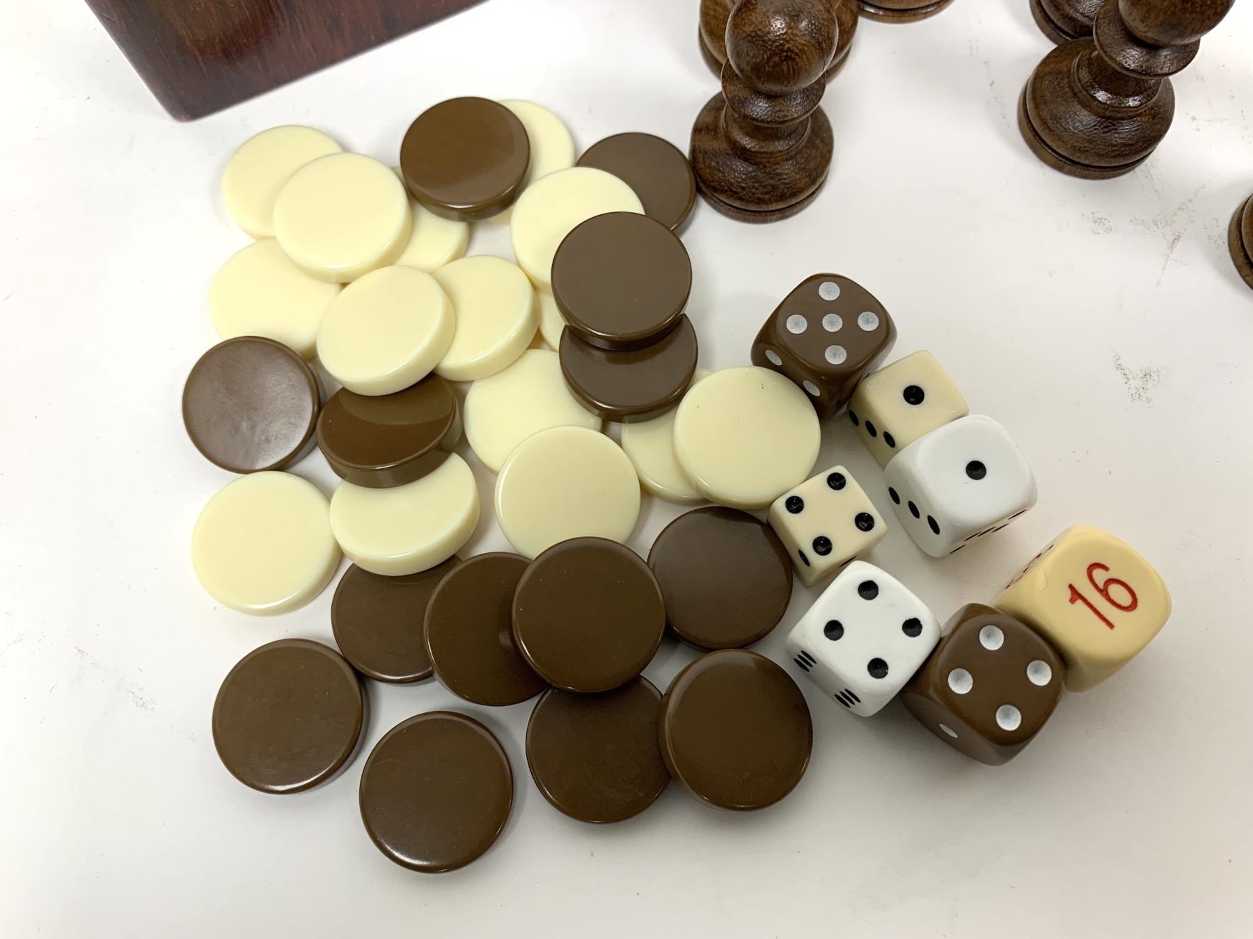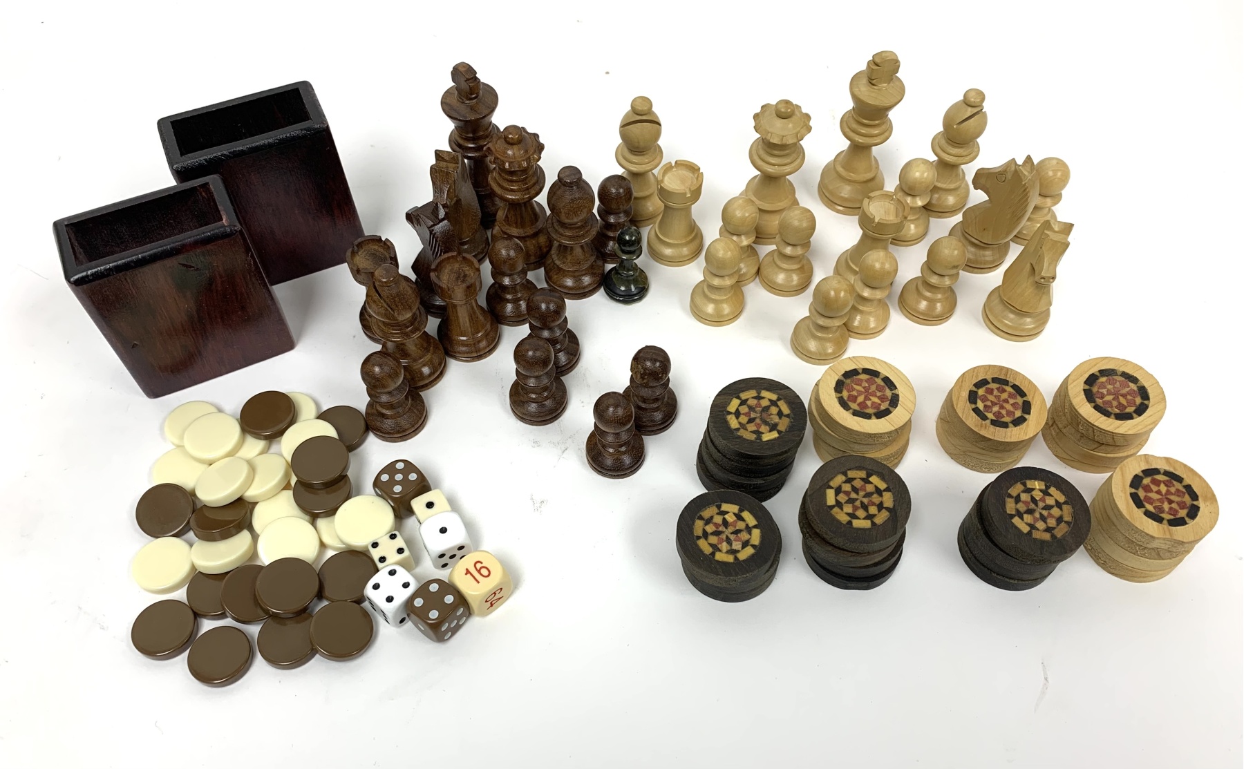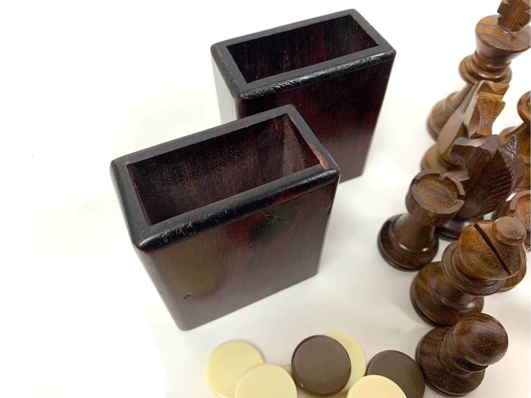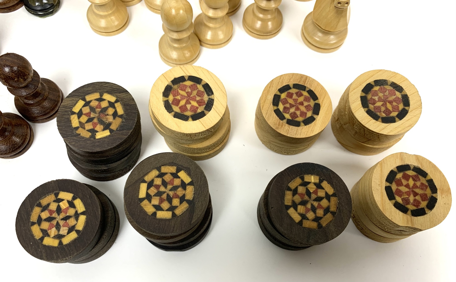 15 inlaid dark wood Checker type discs (1.25” diameter) and 15 inlaid light wood Checker type discs.
