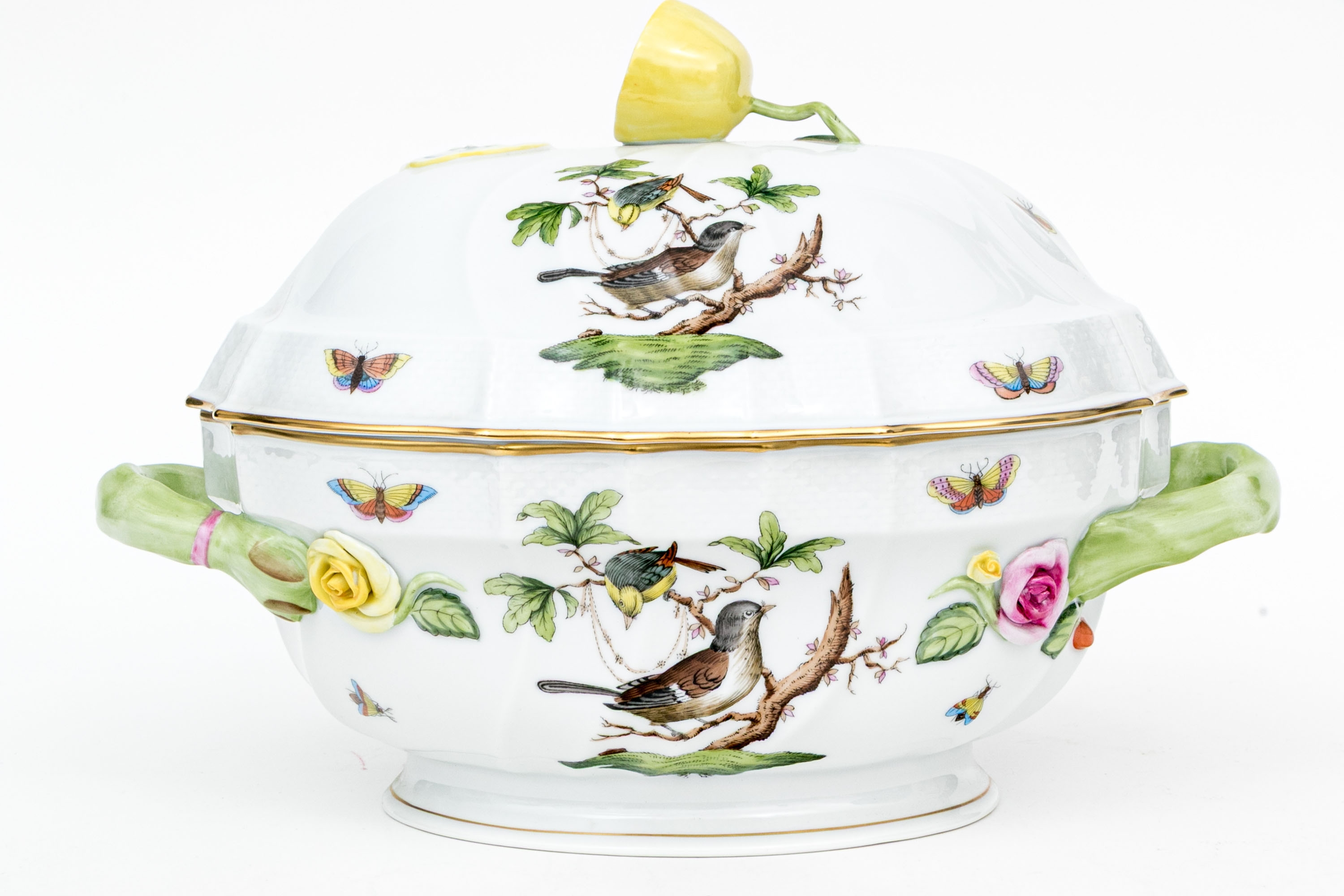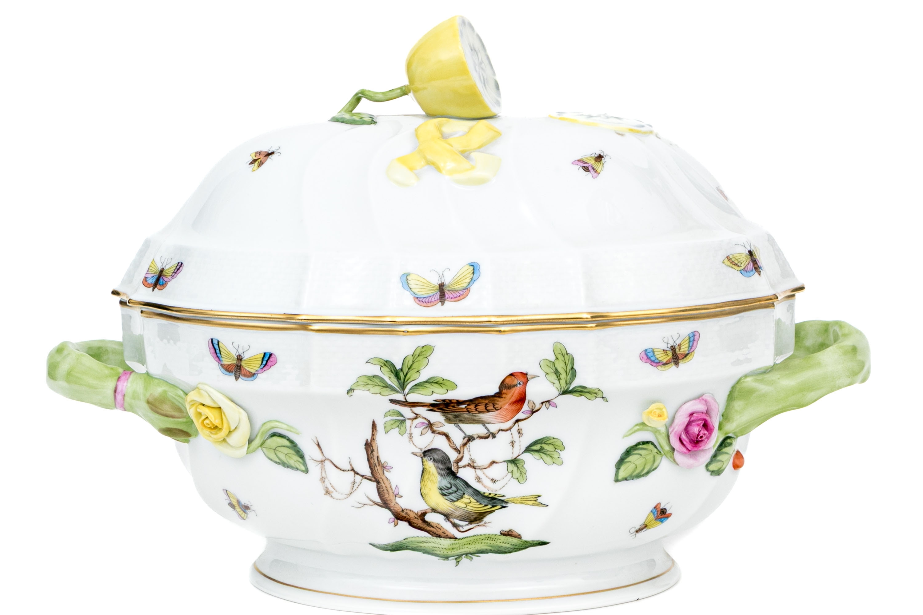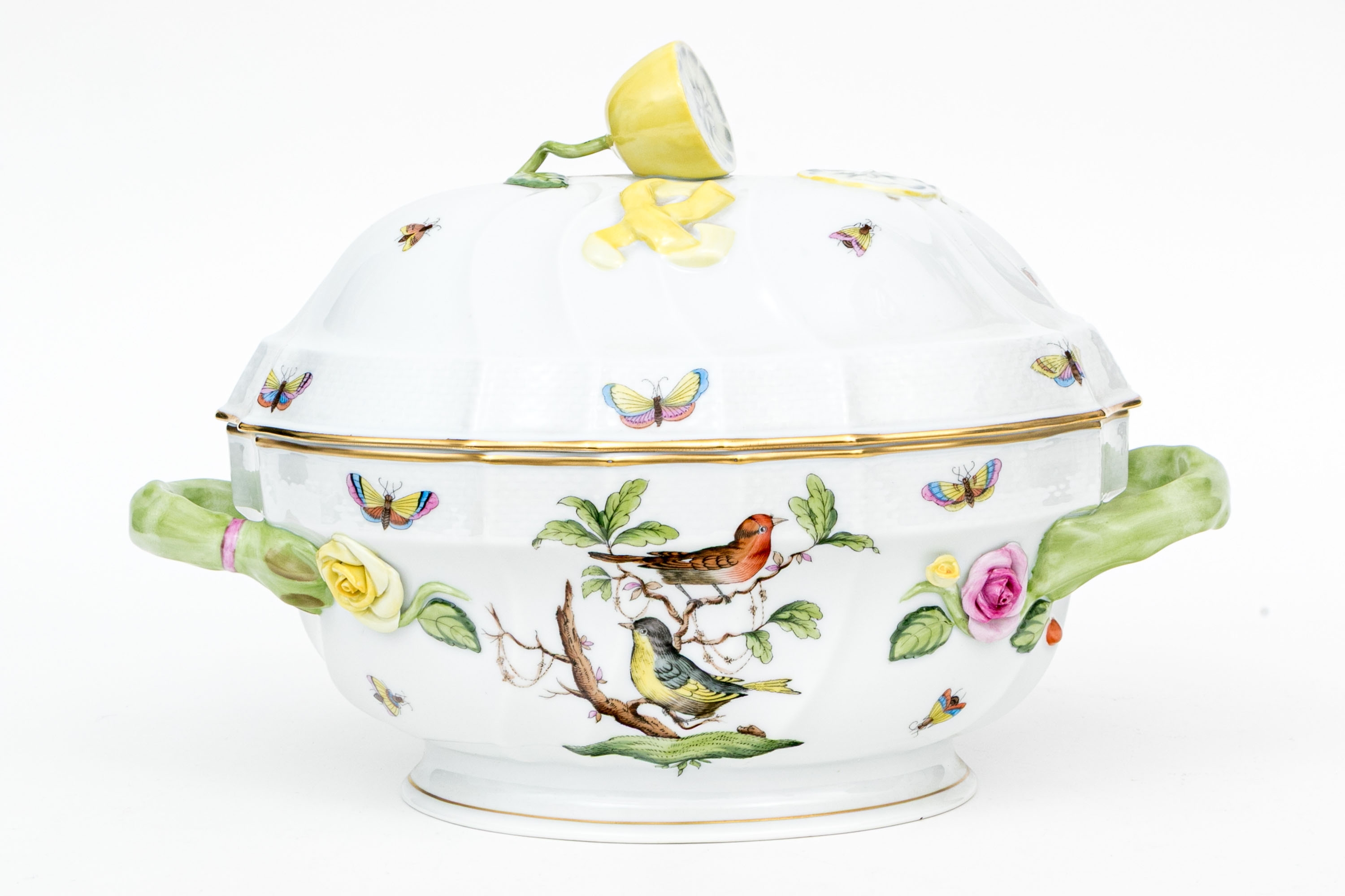 Herend Hungary hand-painted porcelain covered tureen, decorated in the Rothschild Bird (RO) pattern. The tureen features detailed songbirds perched on leafy branches with necklace, surrounded by vibrant butterflies, bees, and insects, all rendered in luminous hand-painted enamels. The vine-formed handles are painted in soft green with applied yellow and pink porcelain roses, while the lid is topped with a sculpted lemon finial and leaves. Both body and lid are finished with Herend’s signature basketweave embossed texture (fish-scale relief) and 24k gold accents along the rims. The underside bears the Herend Hungary blue shield hallmark with crossed paintbrushes, HANDPAINTED inscription, and pattern number 1015/RO.