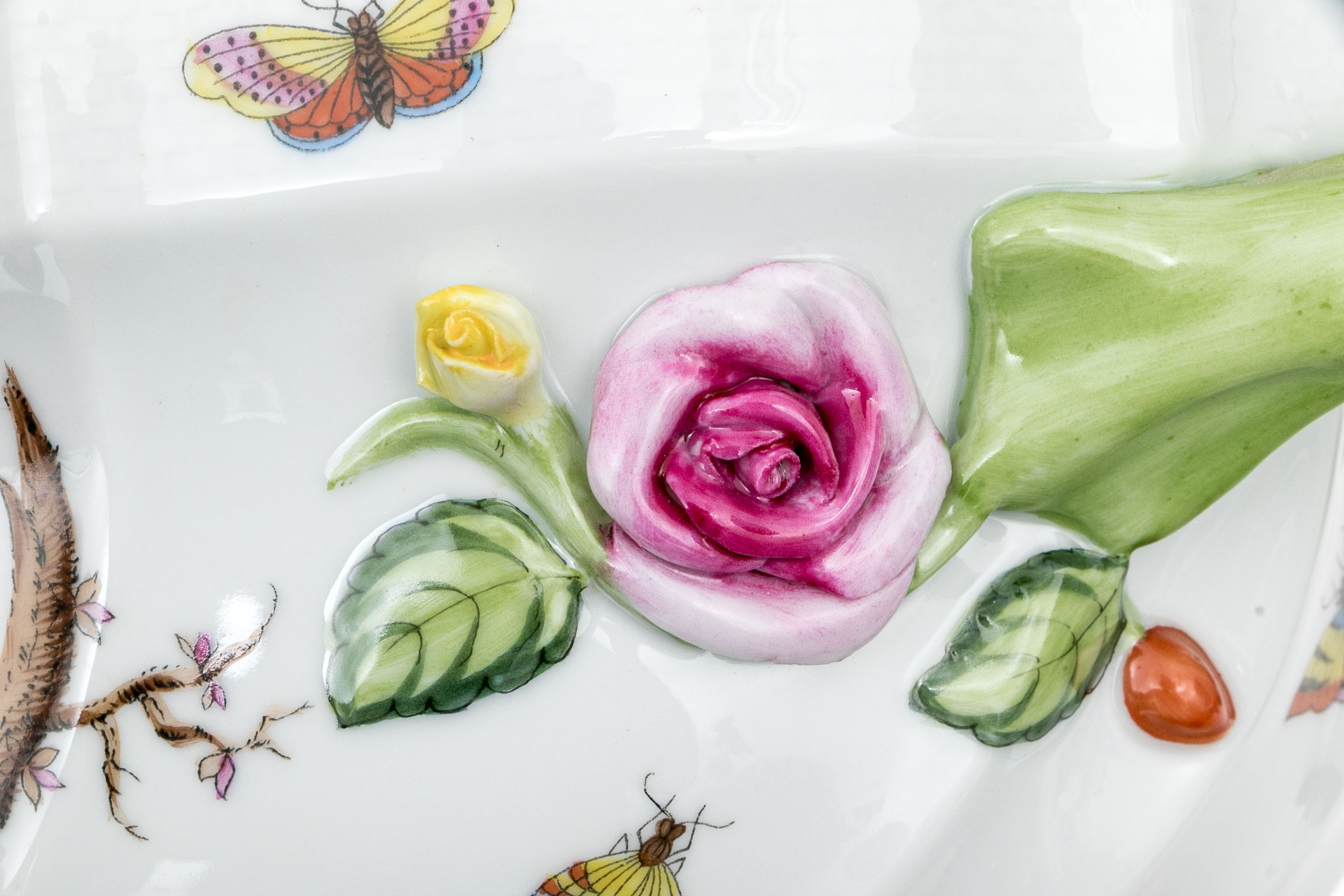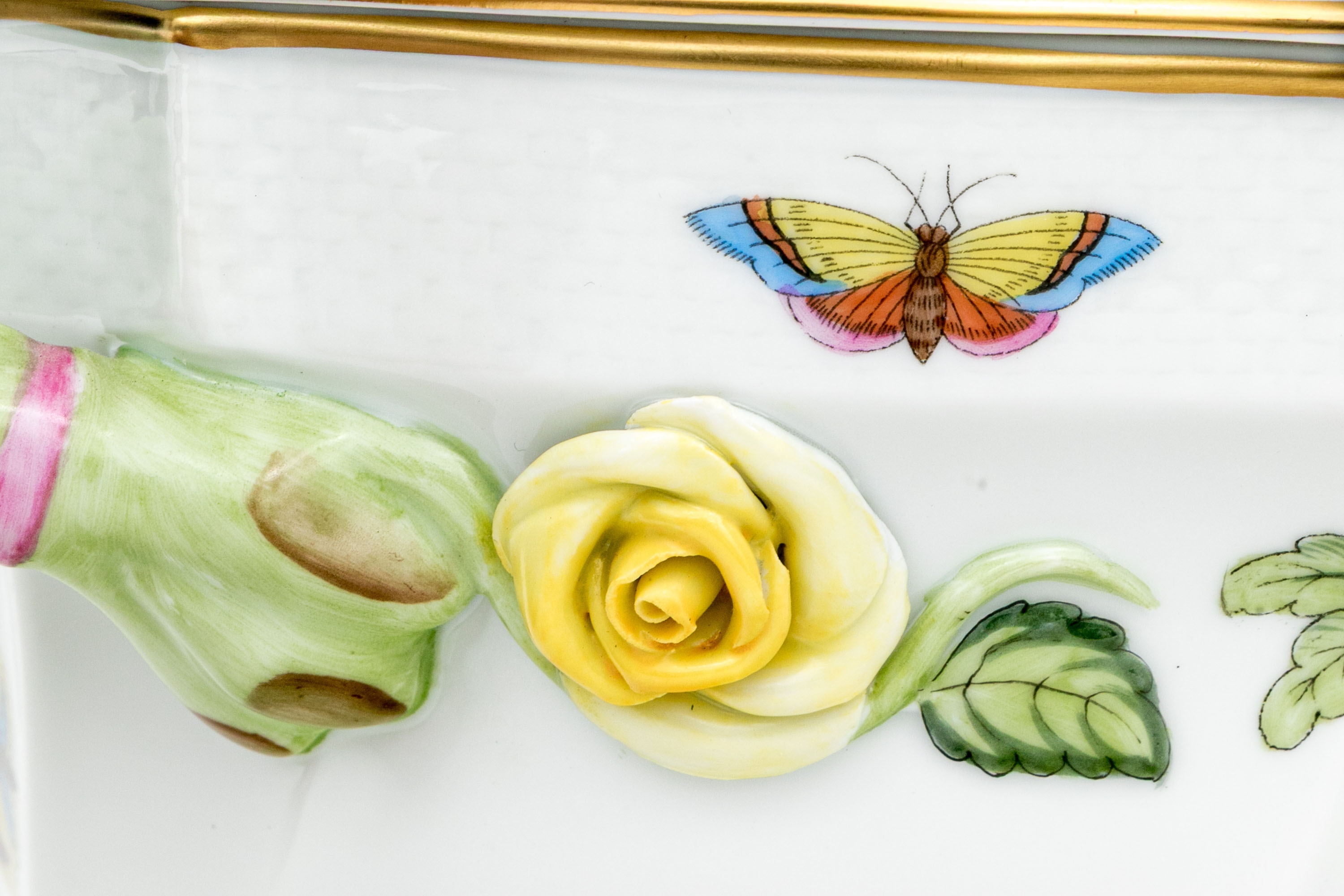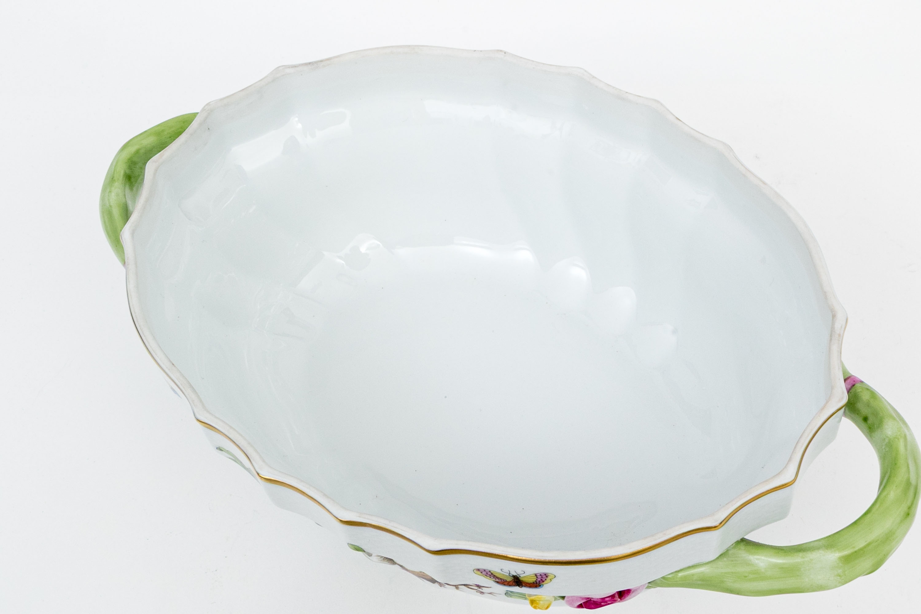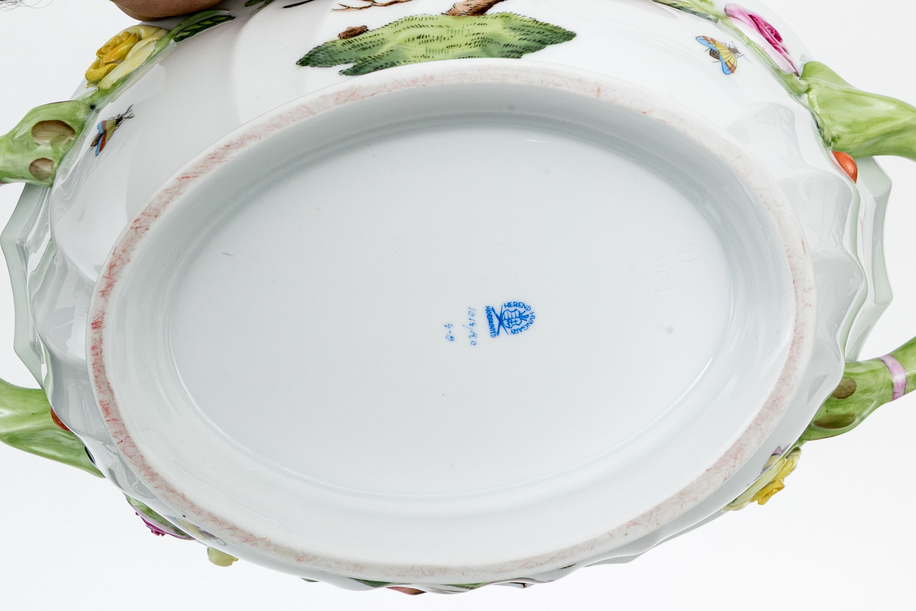 Herend Hungary hand-painted porcelain covered tureen, decorated in the Rothschild Bird (RO) pattern. The tureen features detailed songbirds perched on leafy branches with necklace, surrounded by vibrant butterflies, bees, and insects, all rendered in luminous hand-painted enamels. The vine-formed handles are painted in soft green with applied yellow and pink porcelain roses, while the lid is topped with a sculpted lemon finial and leaves. Both body and lid are finished with Herend’s signature basketweave embossed texture (fish-scale relief) and 24k gold accents along the rims. The underside bears the Herend Hungary blue shield hallmark with crossed paintbrushes, HANDPAINTED inscription, and pattern number 1015/RO.