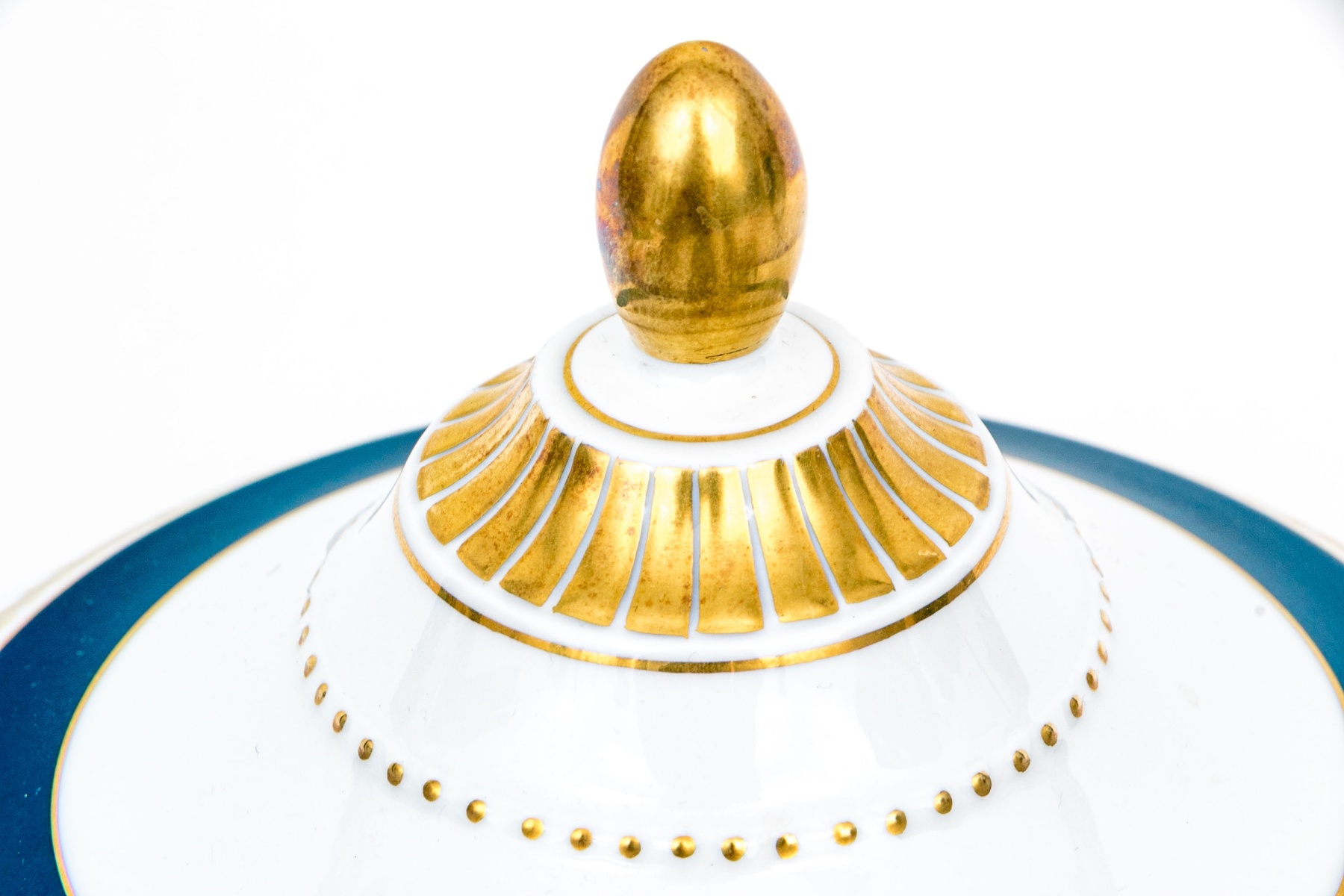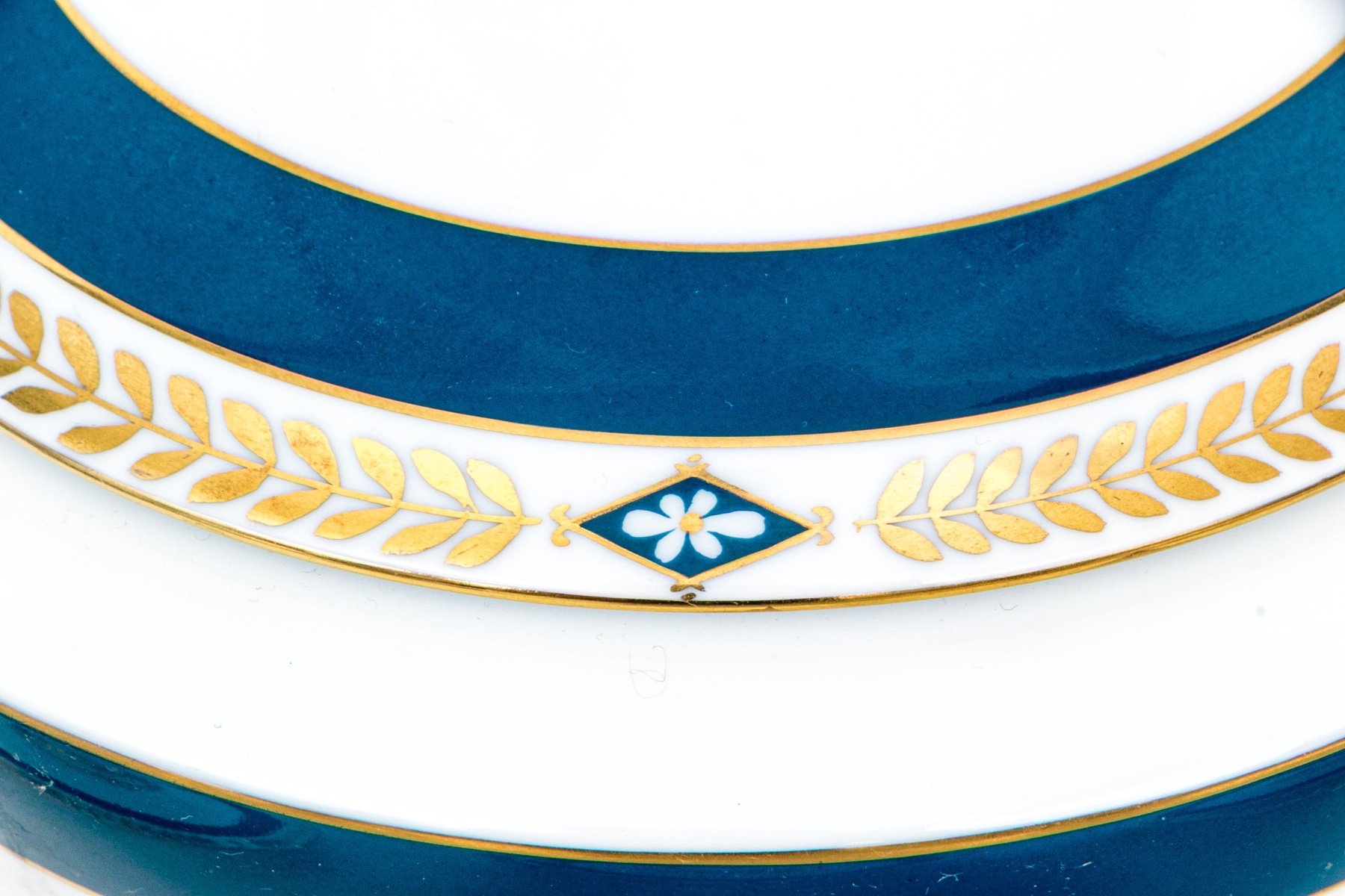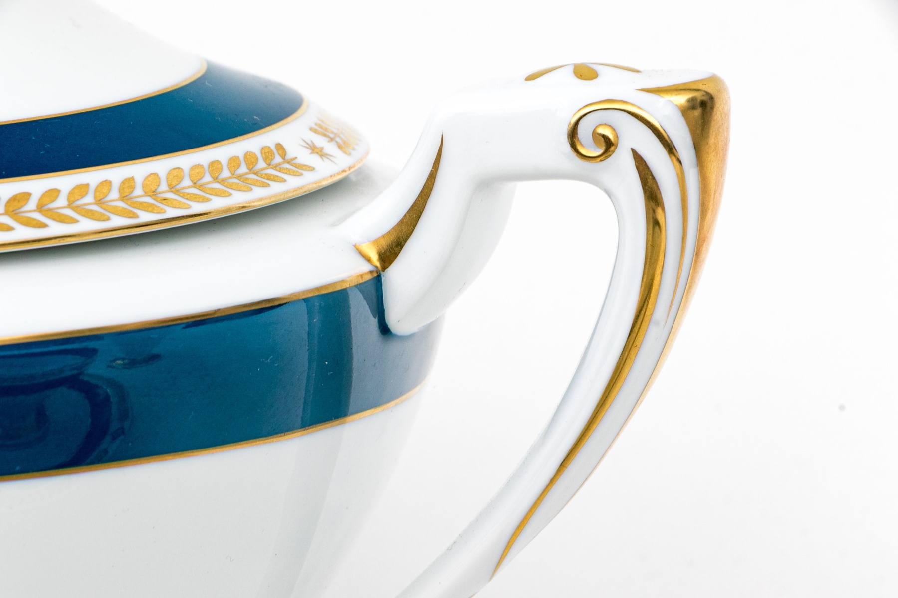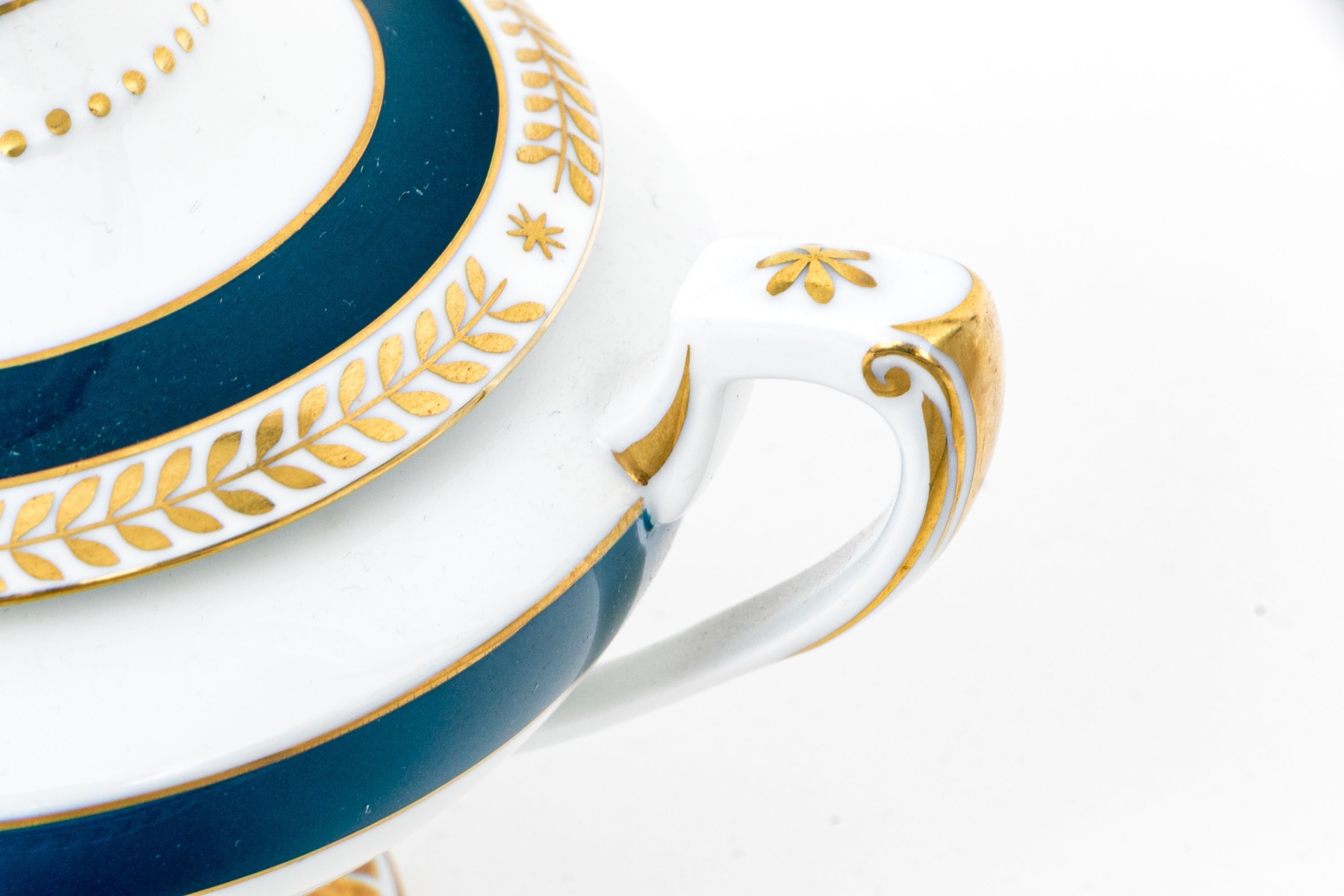The rare and exceptional fifteen piece service features a rich turquoise/cobalt blue band accented by hand-painted 24K gold laurel leaves, rosettes, and linear ornamentation on gleaming white porcelain. Each piece is finished with delicate beading, ribbed gold bases, and classical handles and finials that reflect early 19th-century Empire style.