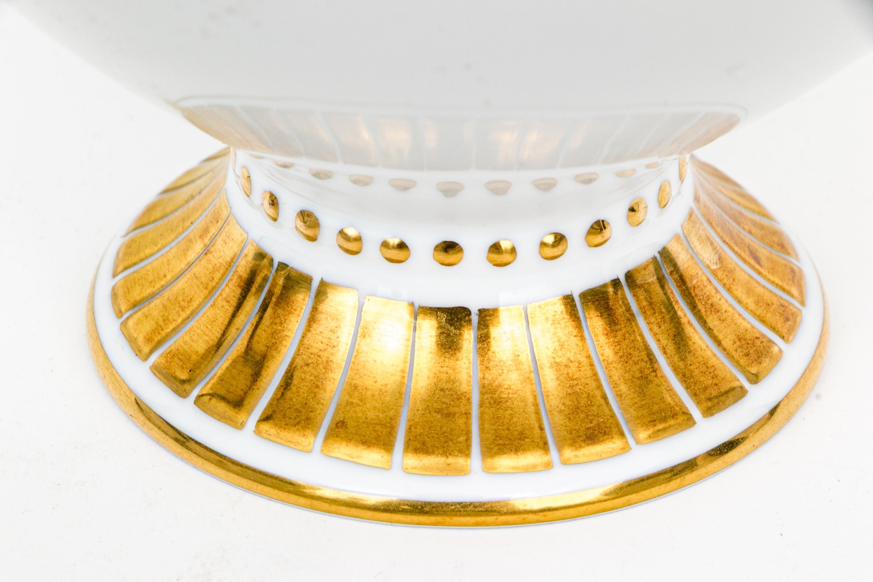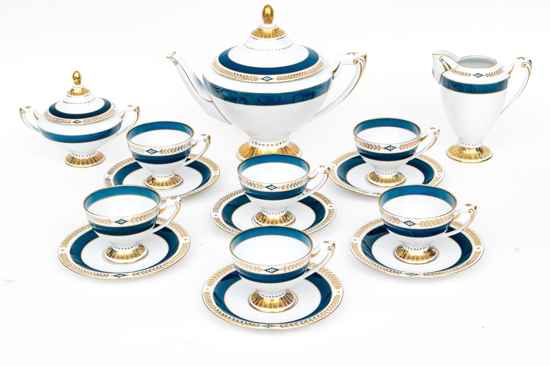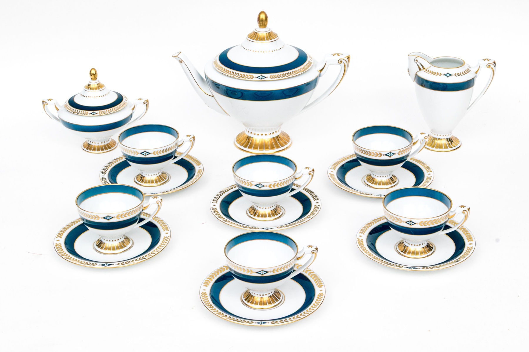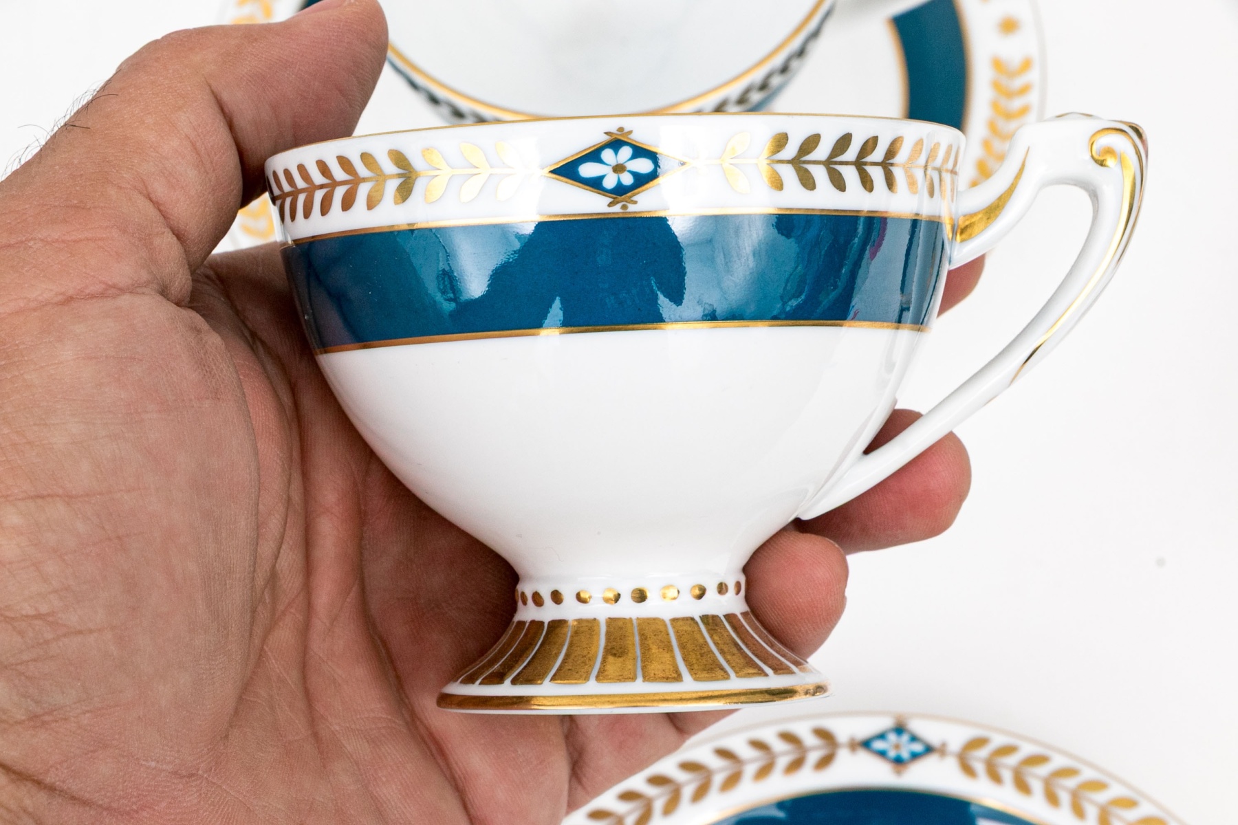 The rare and exceptional fifteen piece service features a rich turquoise/cobalt blue band accented by hand-painted 24K gold laurel leaves, rosettes, and linear ornamentation on gleaming white porcelain. Each piece is finished with delicate beading, ribbed gold bases, and classical handles and finials that reflect early 19th-century Empire style.