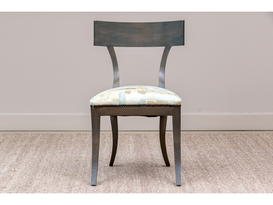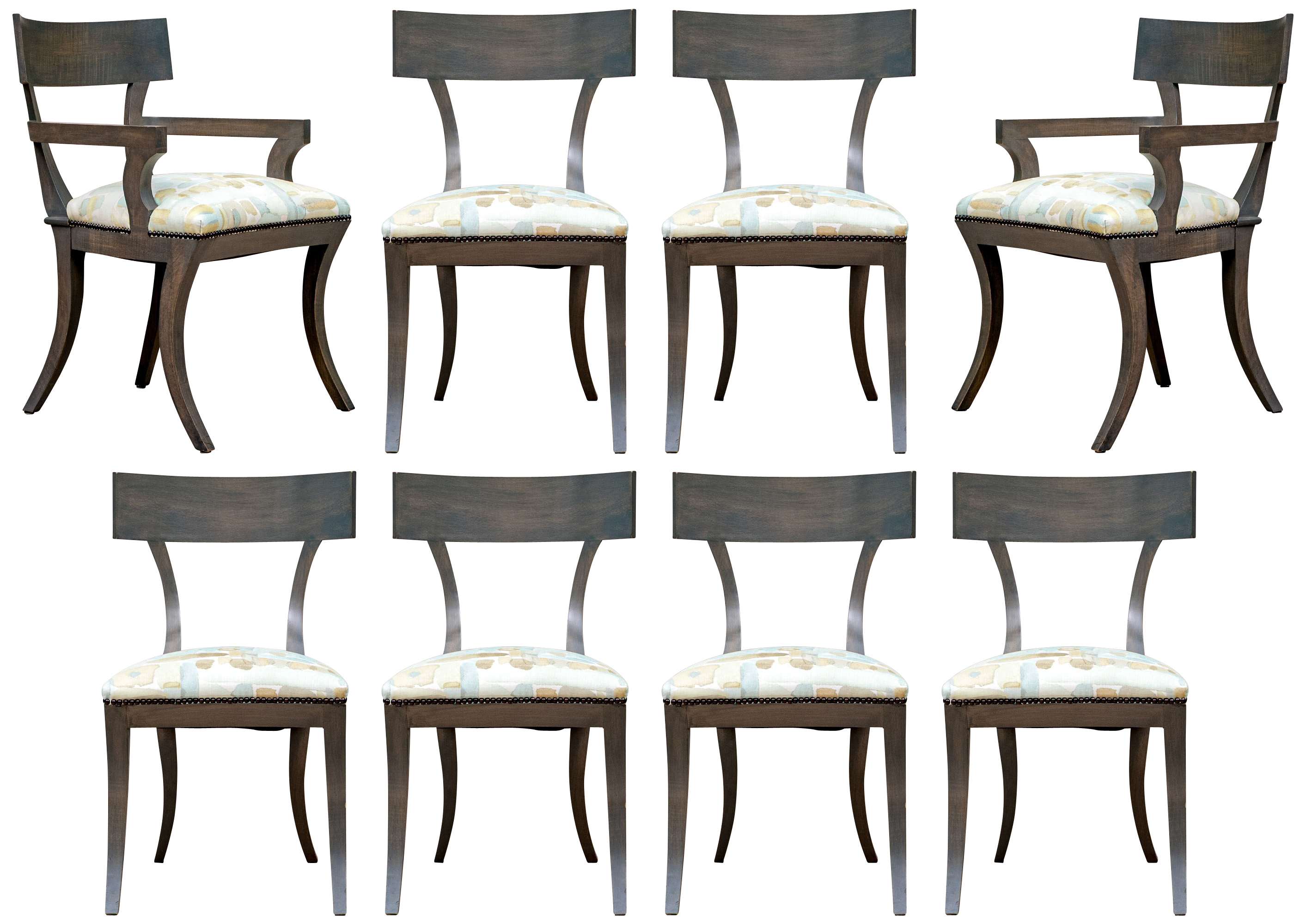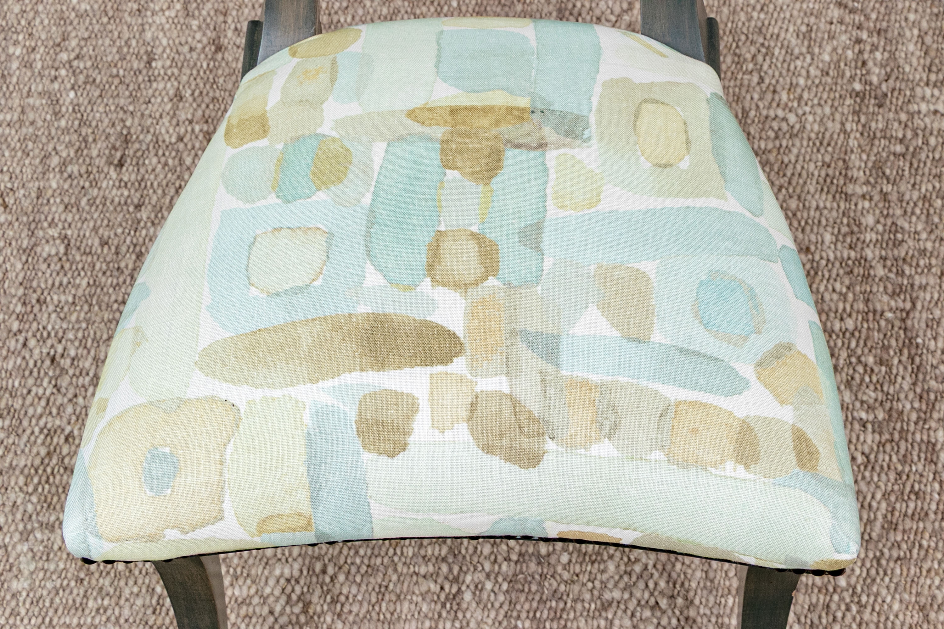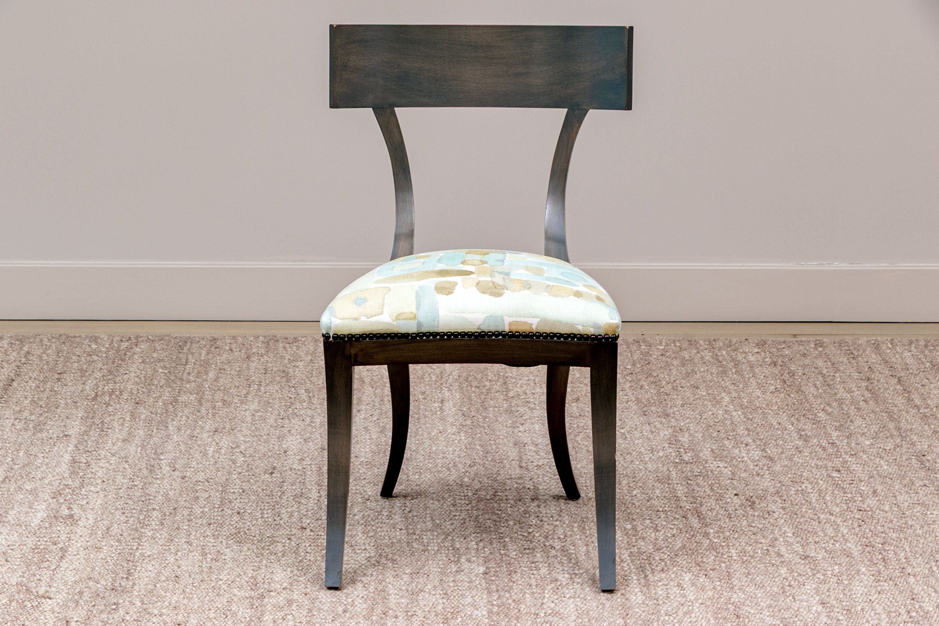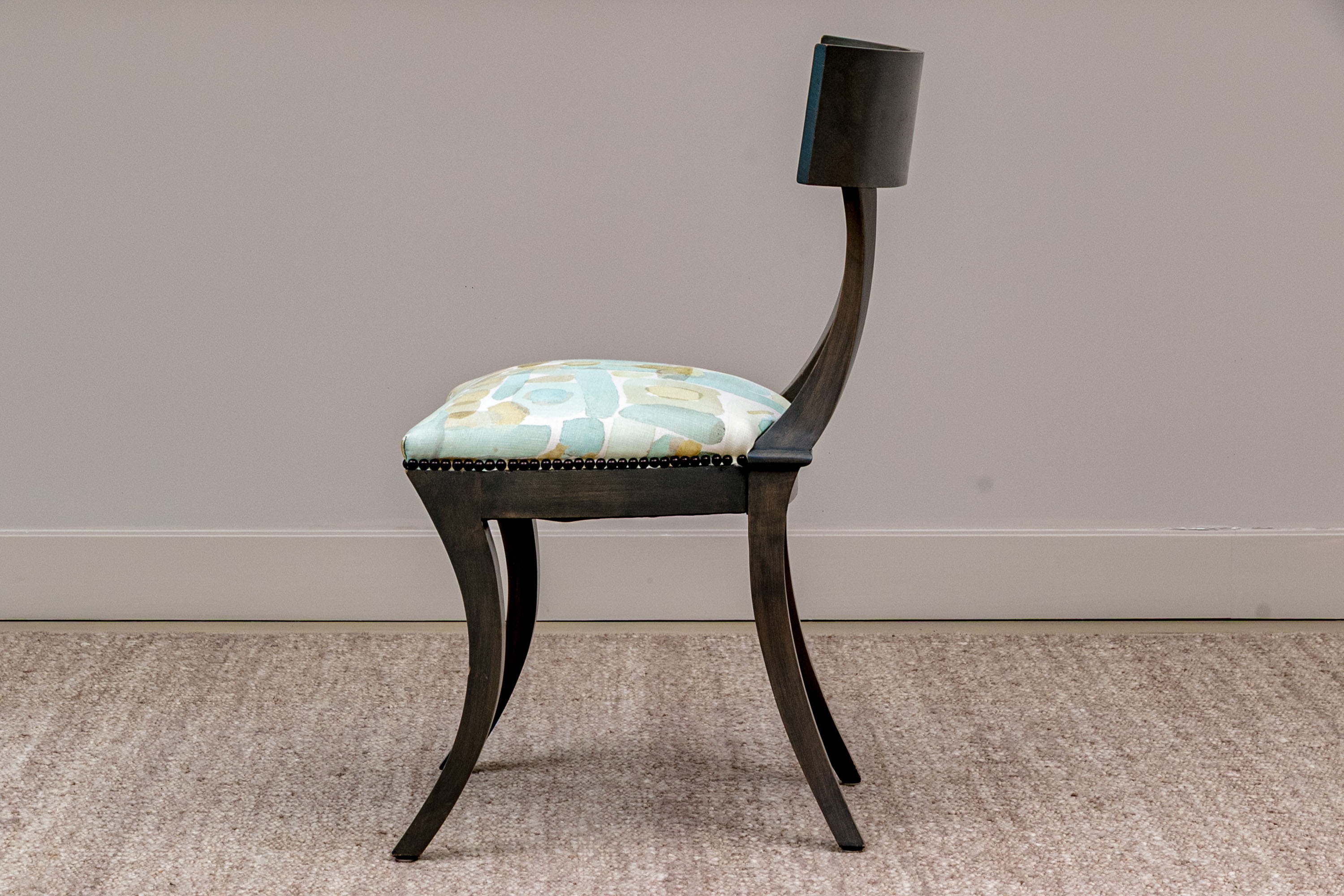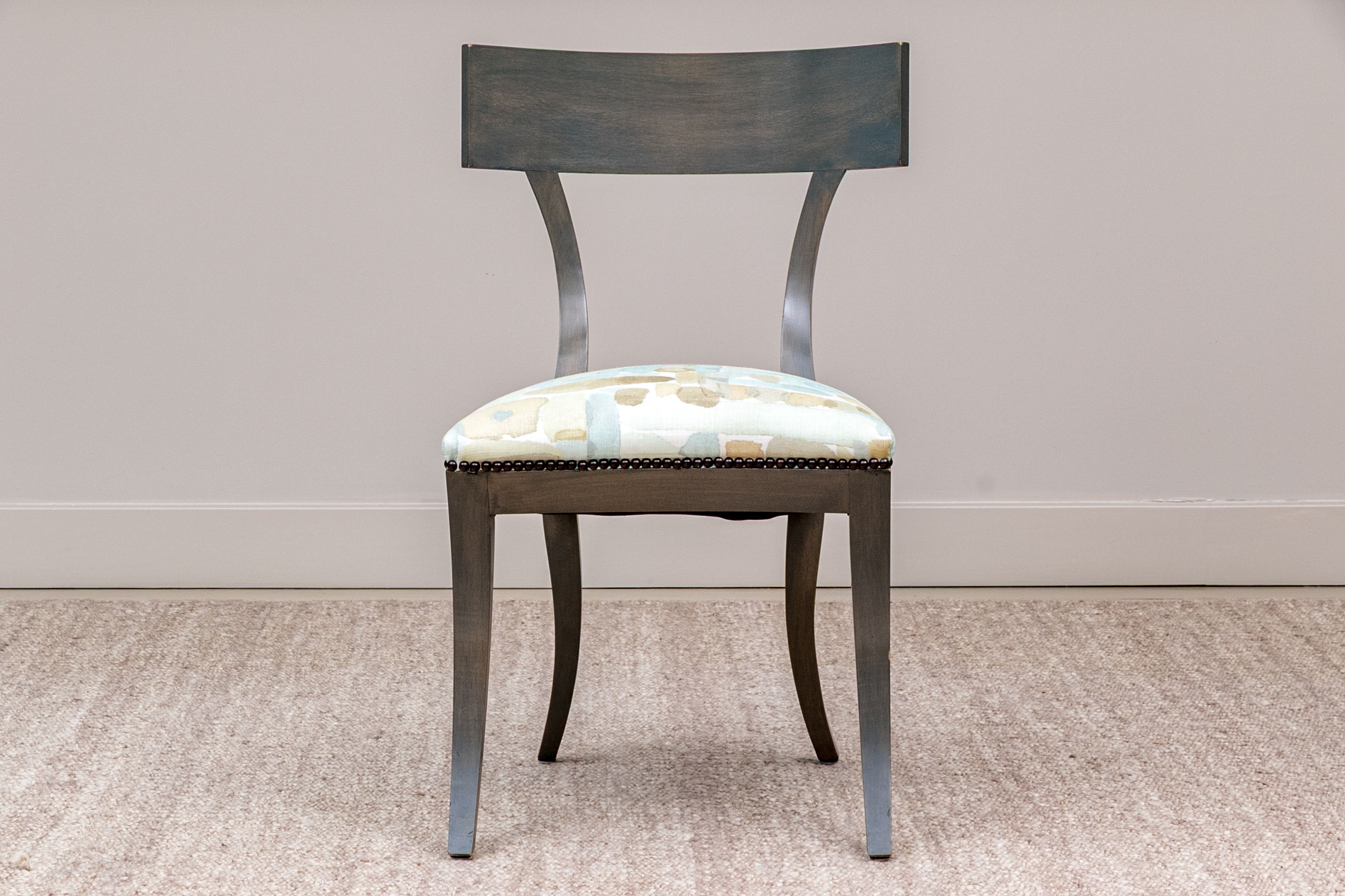 A very well made set of custom upholstered Klismos Style Dining Chairs in a soft Gray stain. Very sturdy and comfortable, the chairs have the Classic Klismos form as introduced to the design world by T.H Robsjohn Gibbings. The frames are stained in a wash type effect which allows the lighter wood below to show through. The seats are custom upholstered in a modern airy print reminiscent of watercolors in Blues, Sage, Tan and Cream and have full surround nail-head trim.
